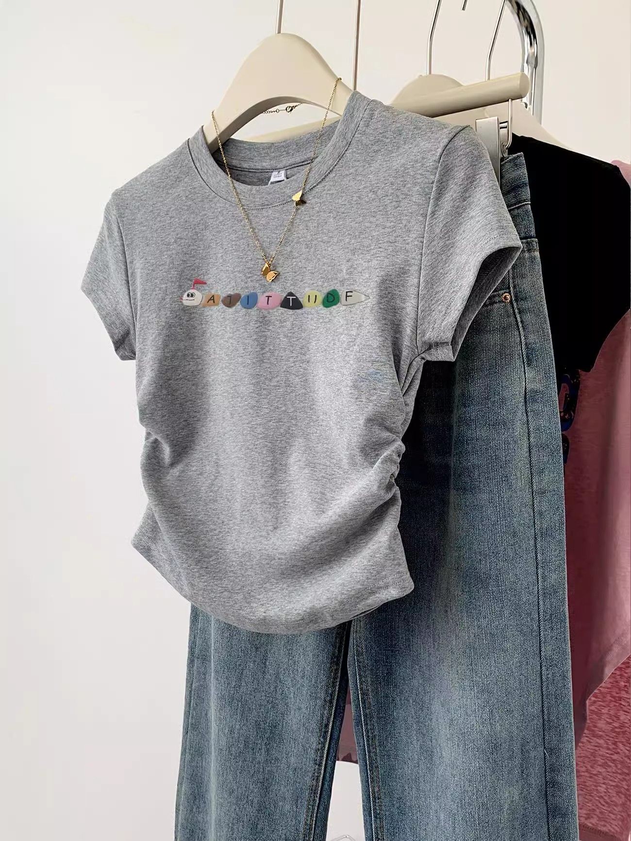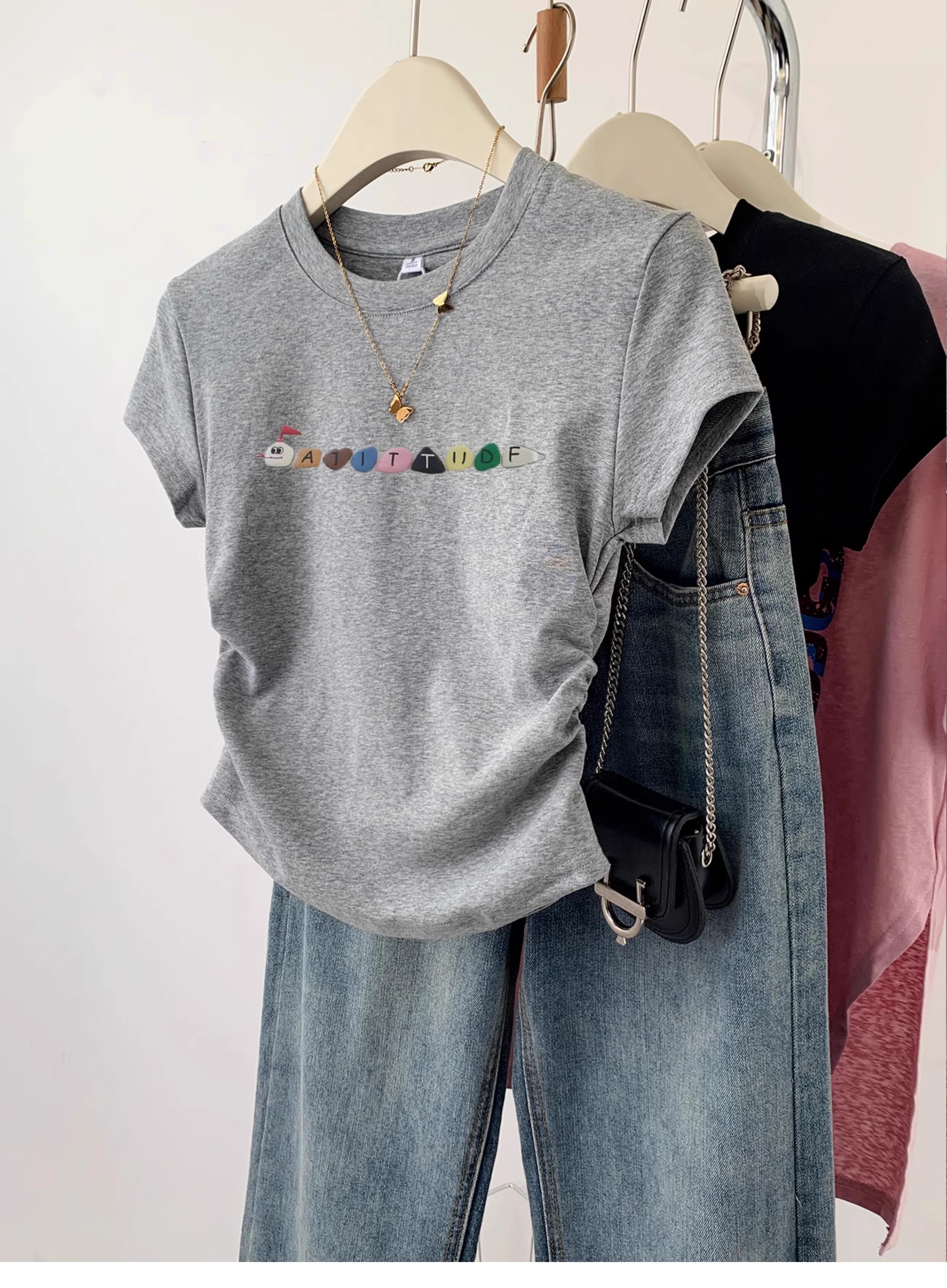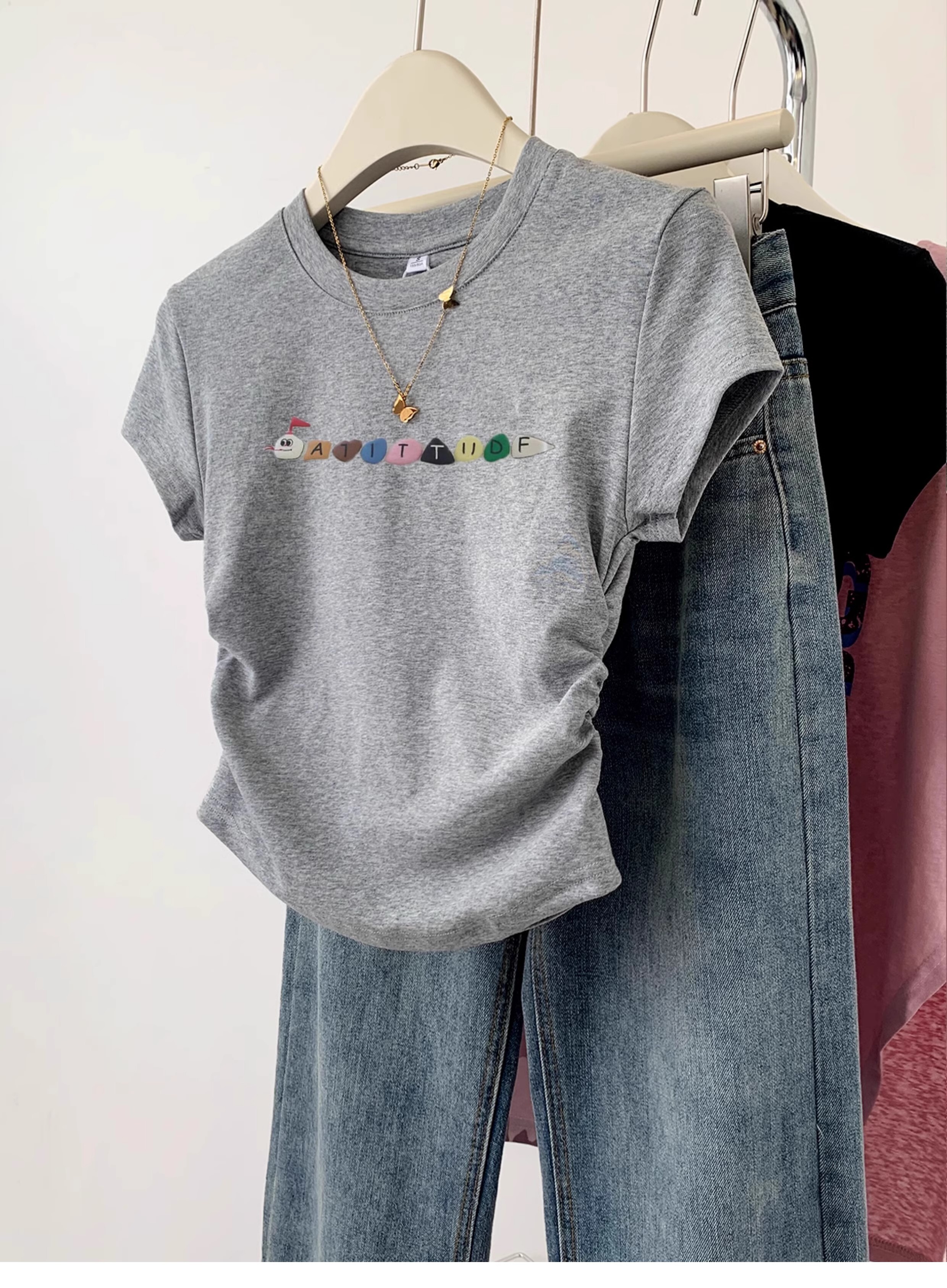 • 1*1纯棉 高弹力】褶皱收腰小飞袖短袖t恤女夏季新款修身T恤