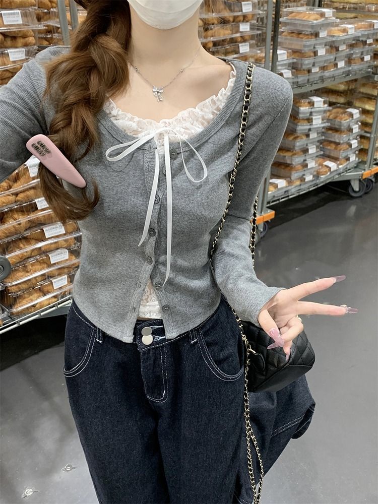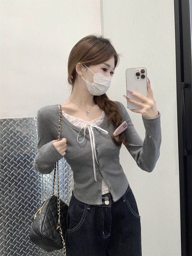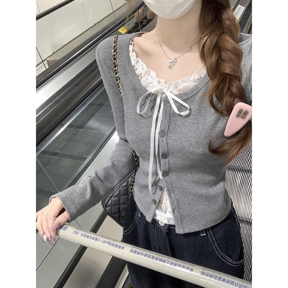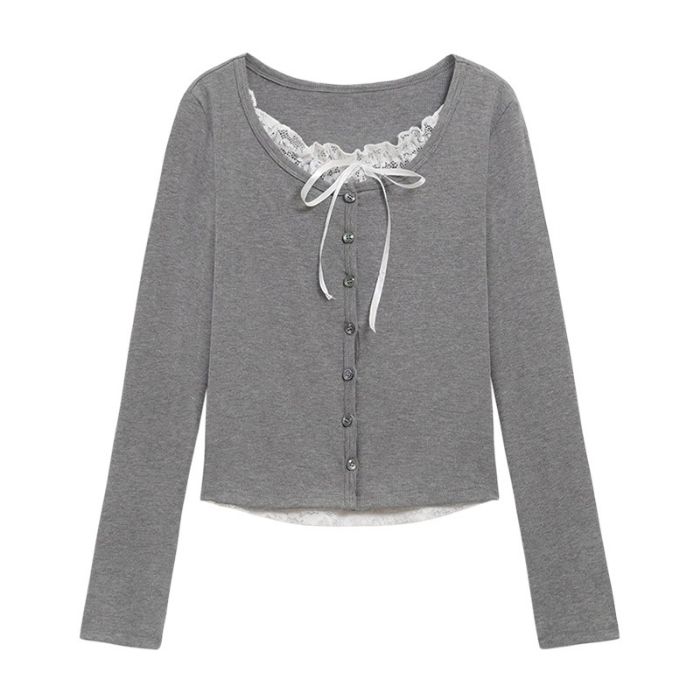 • MR【原版做法】纯欲蕾丝拼接T恤春季修身显瘦假两件长袖打底衫