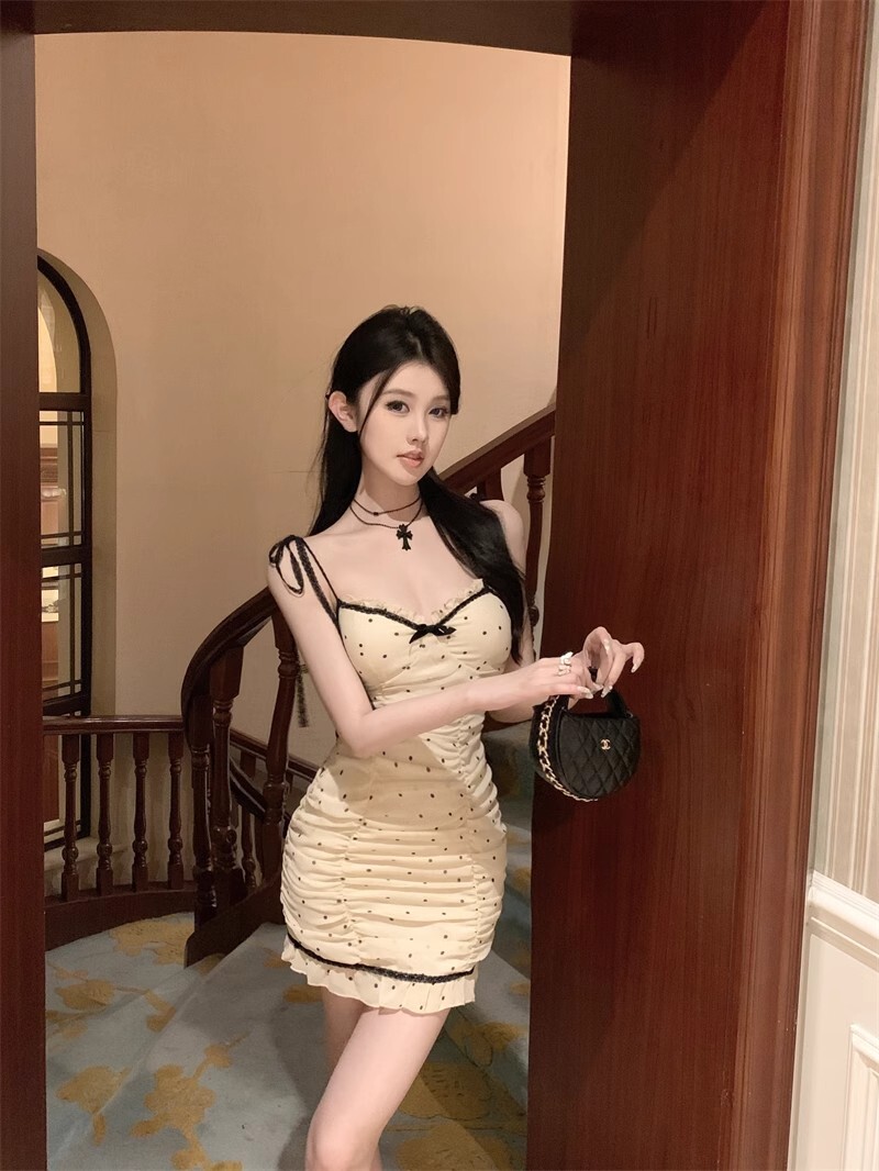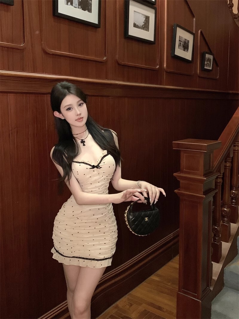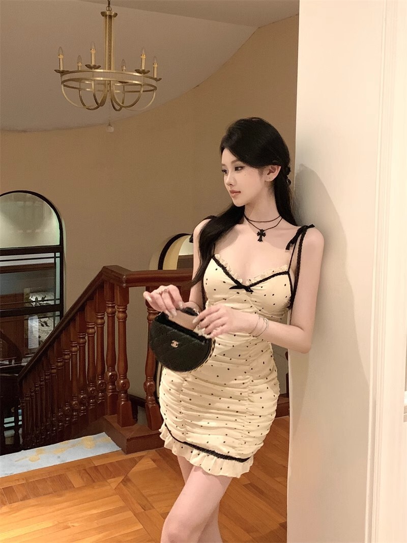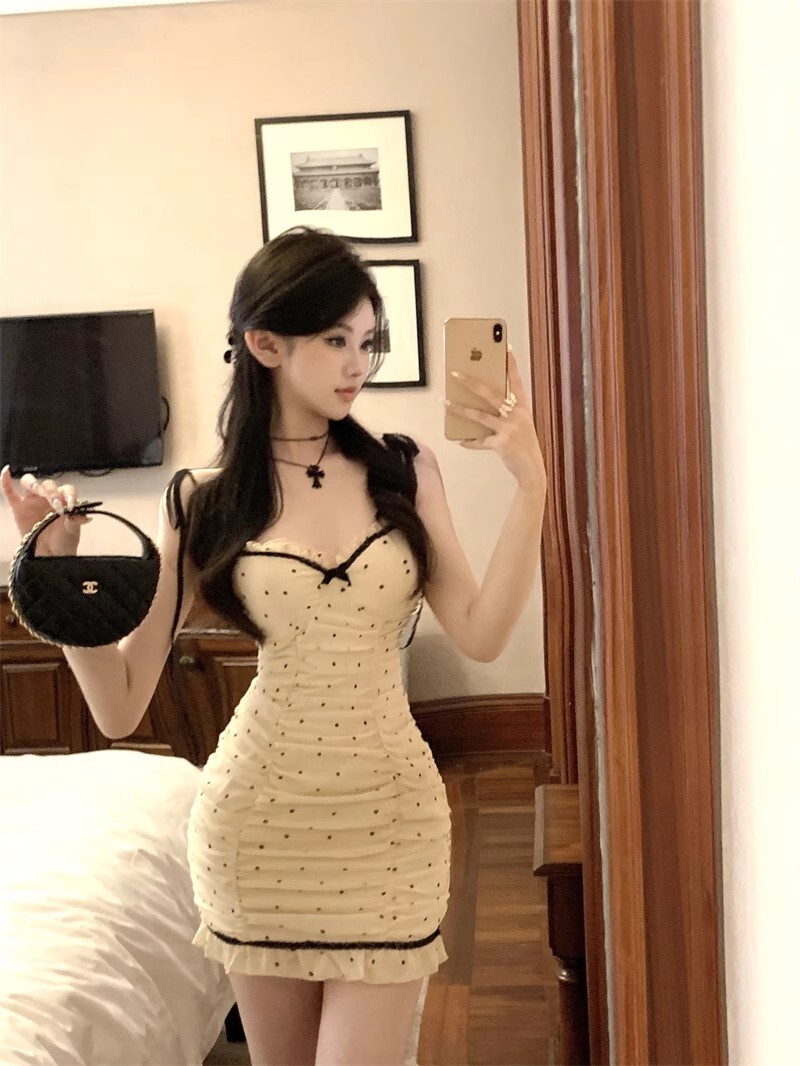 • 纯欲风紧身包臀吊带裙夏季新款抹胸性感波点拼色系带木耳边连衣裙