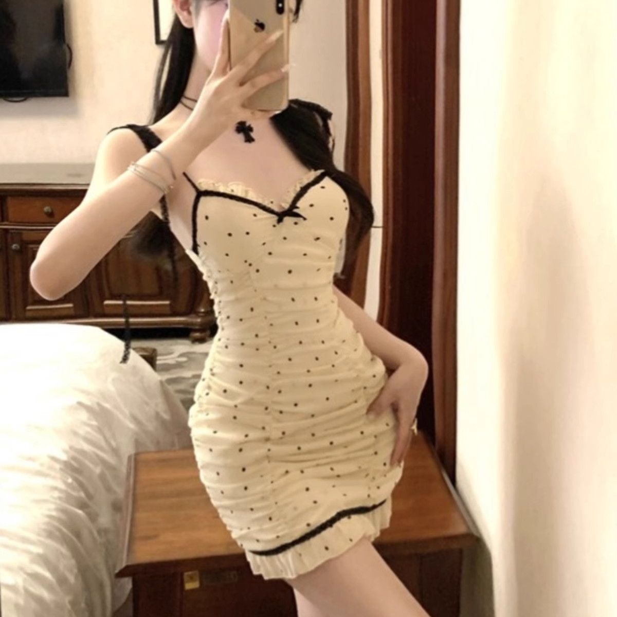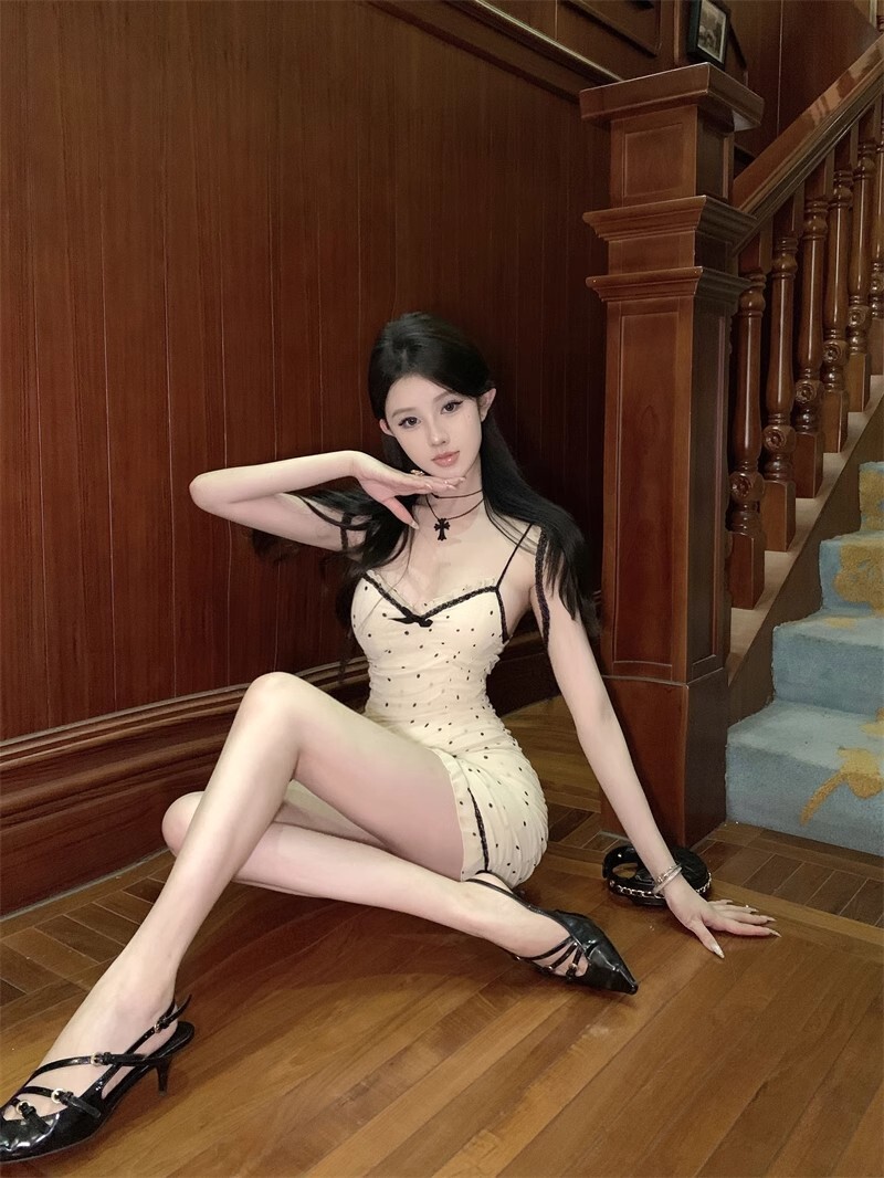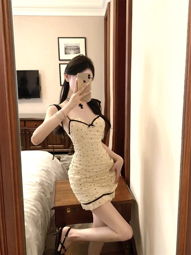 • 纯欲风紧身包臀吊带裙夏季新款抹胸性感波点拼色系带木耳边连衣裙