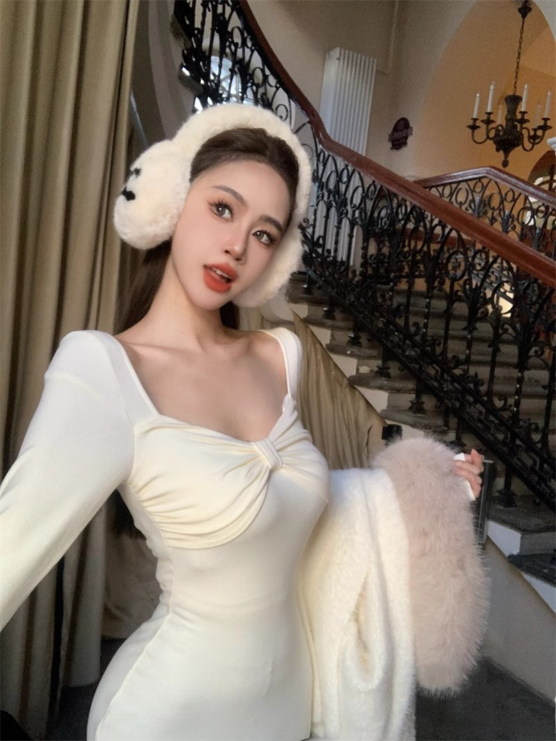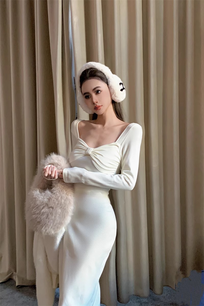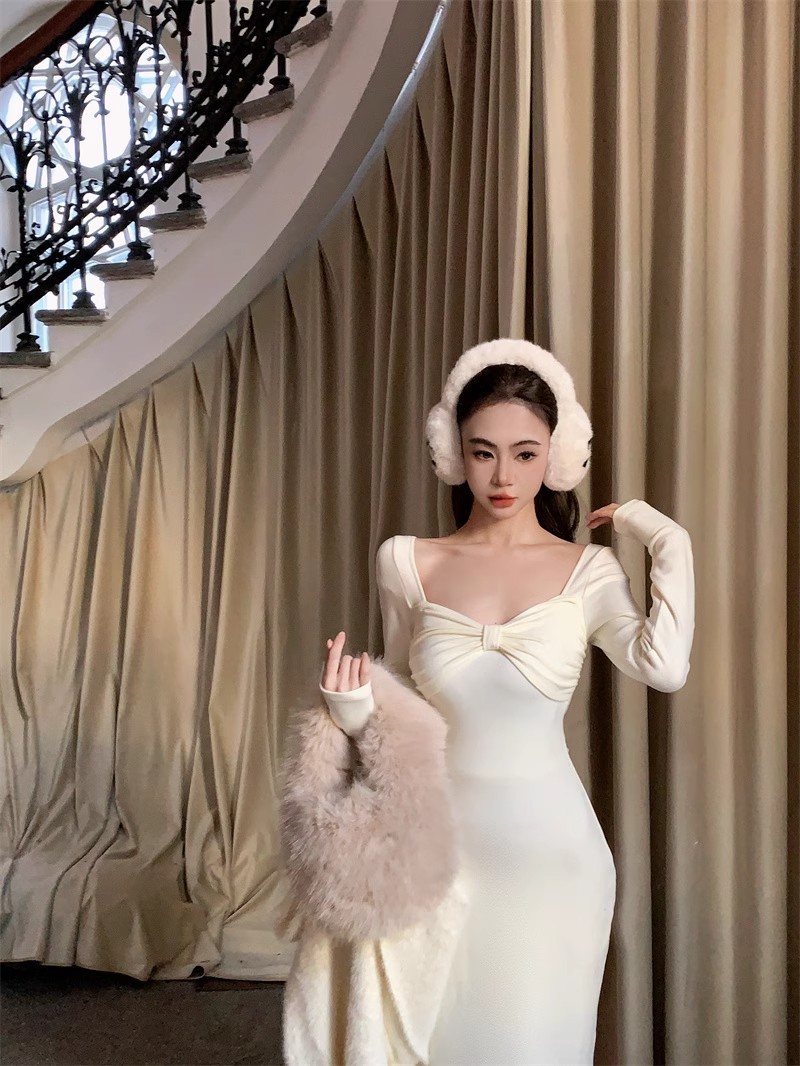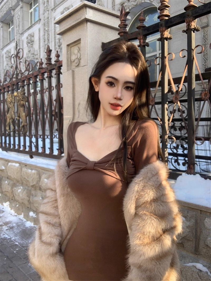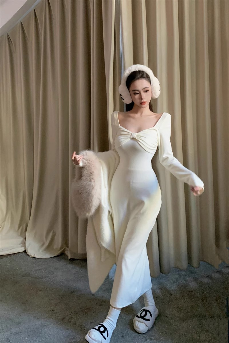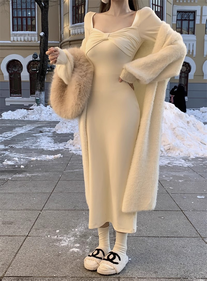 • 咖色蝴蝶结方领连衣裙女秋冬季长袖内搭裙子修身收腰中长款包臀裙