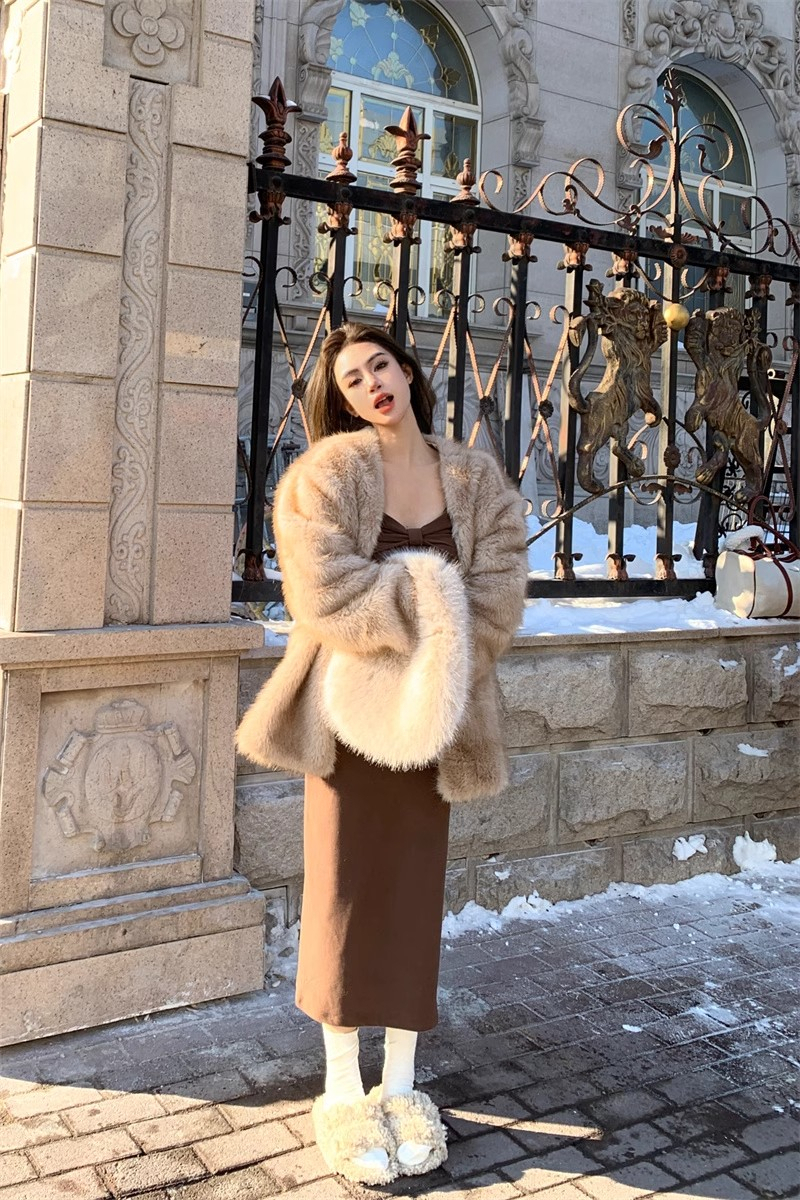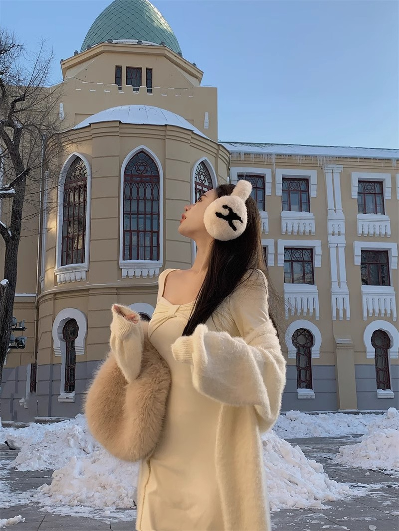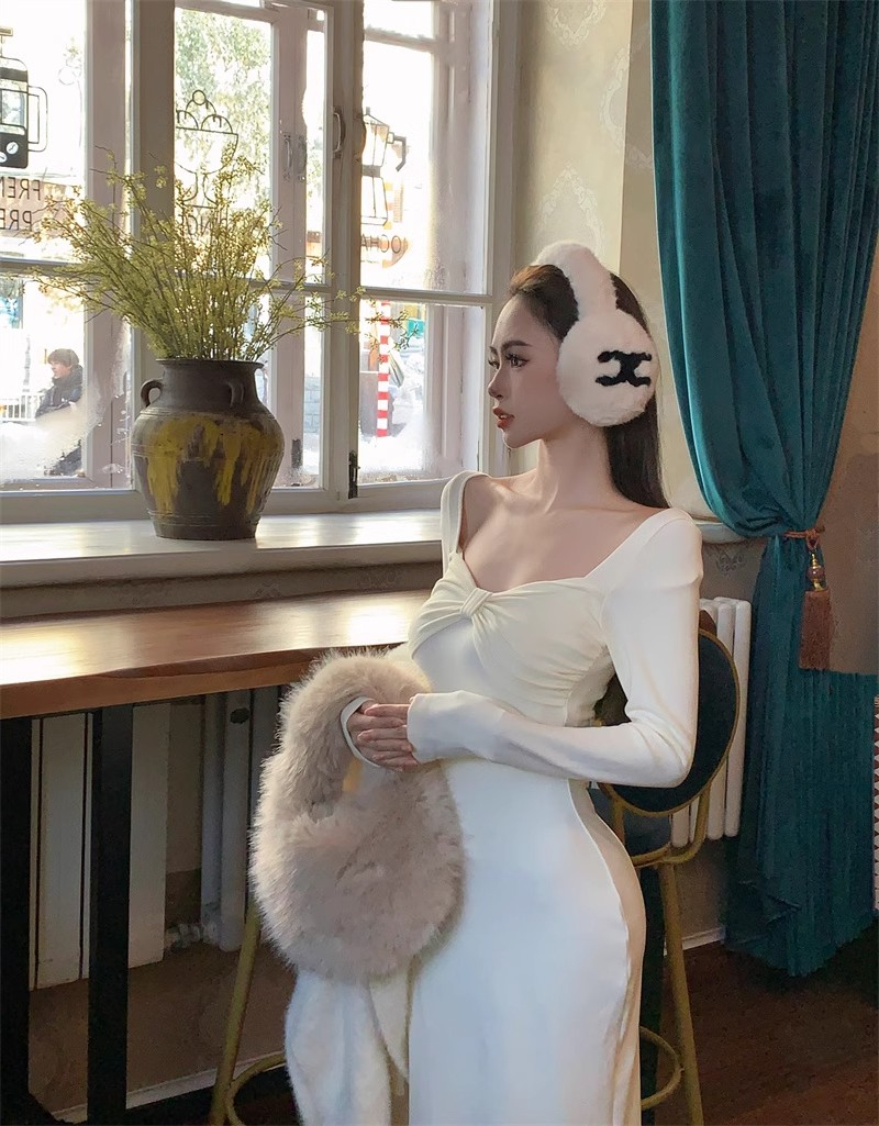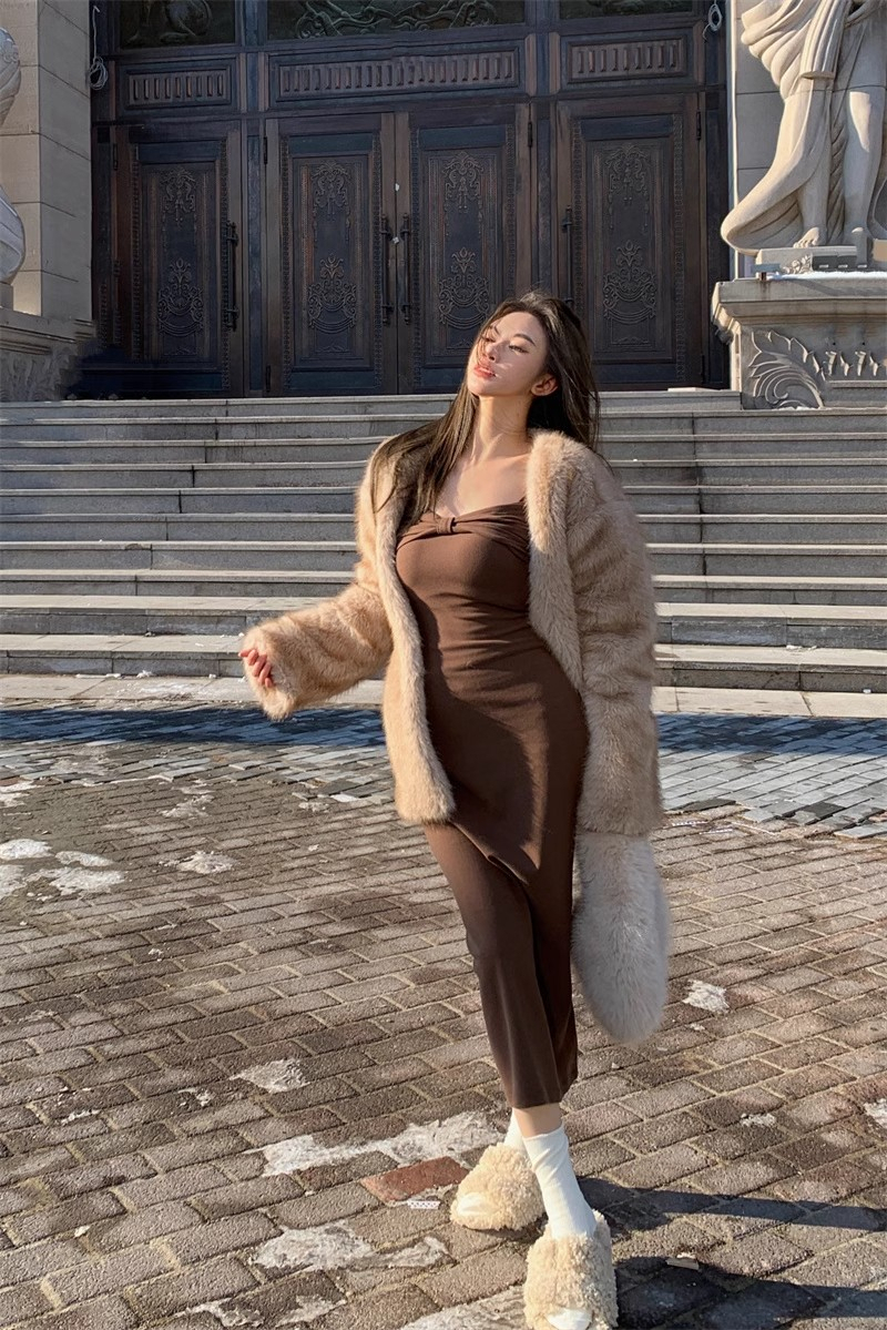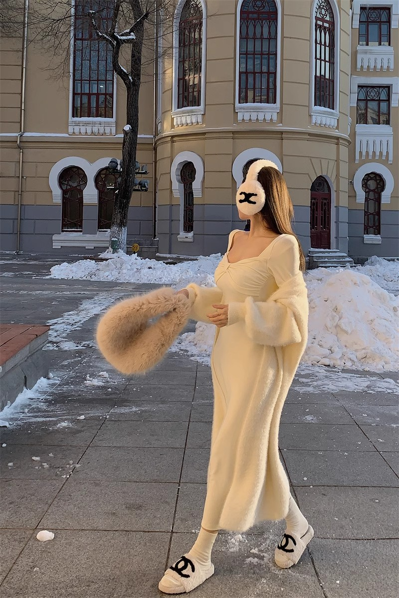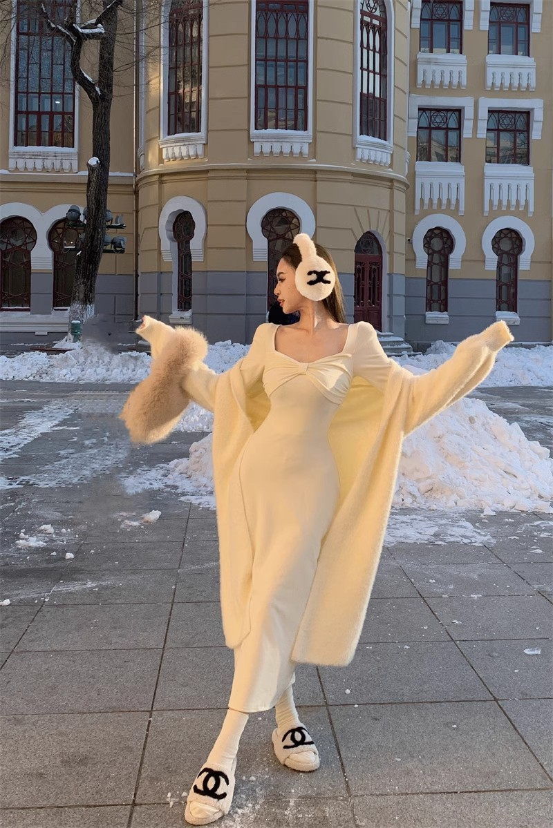 • 咖色蝴蝶结方领连衣裙女秋冬季长袖内搭裙子修身收腰中长款包臀裙