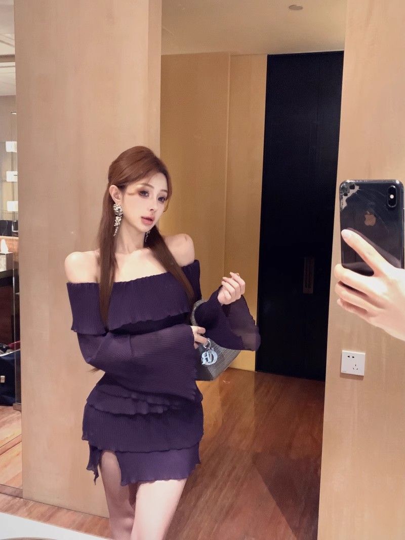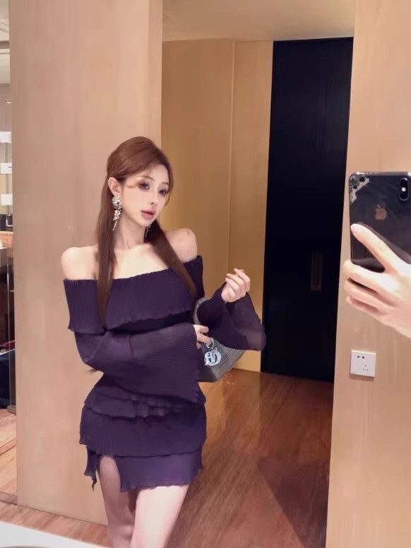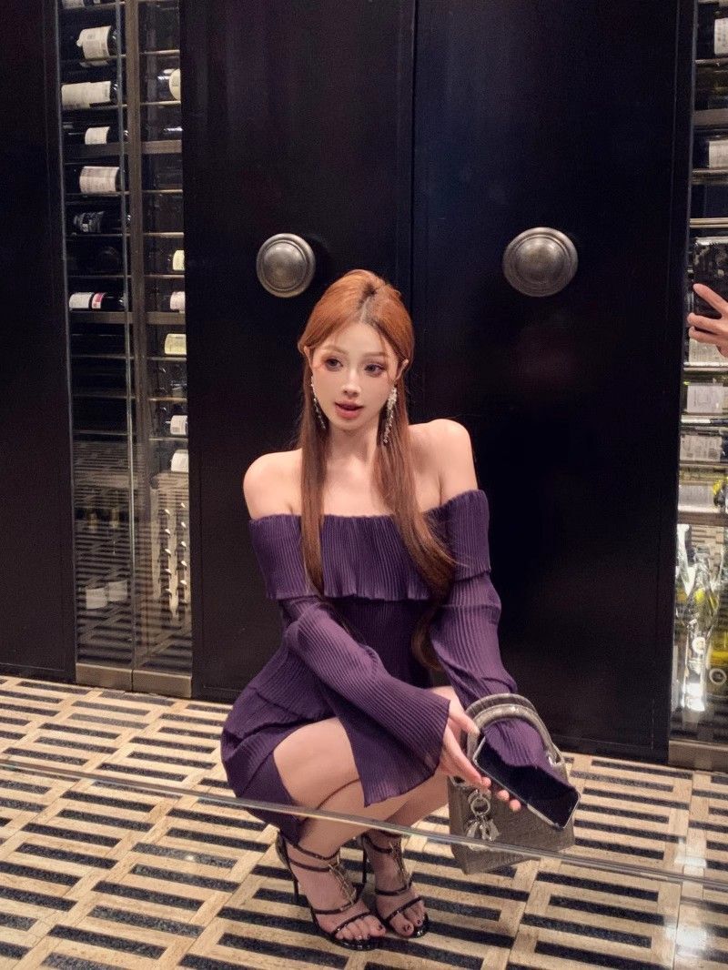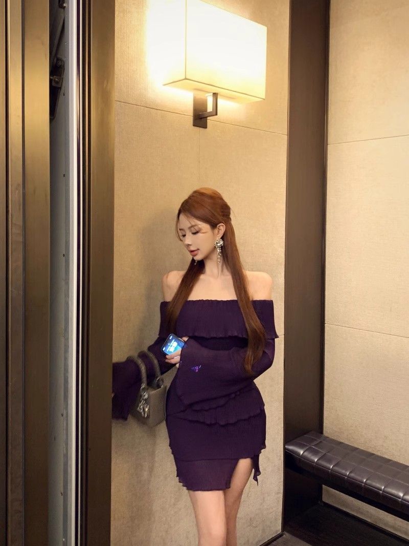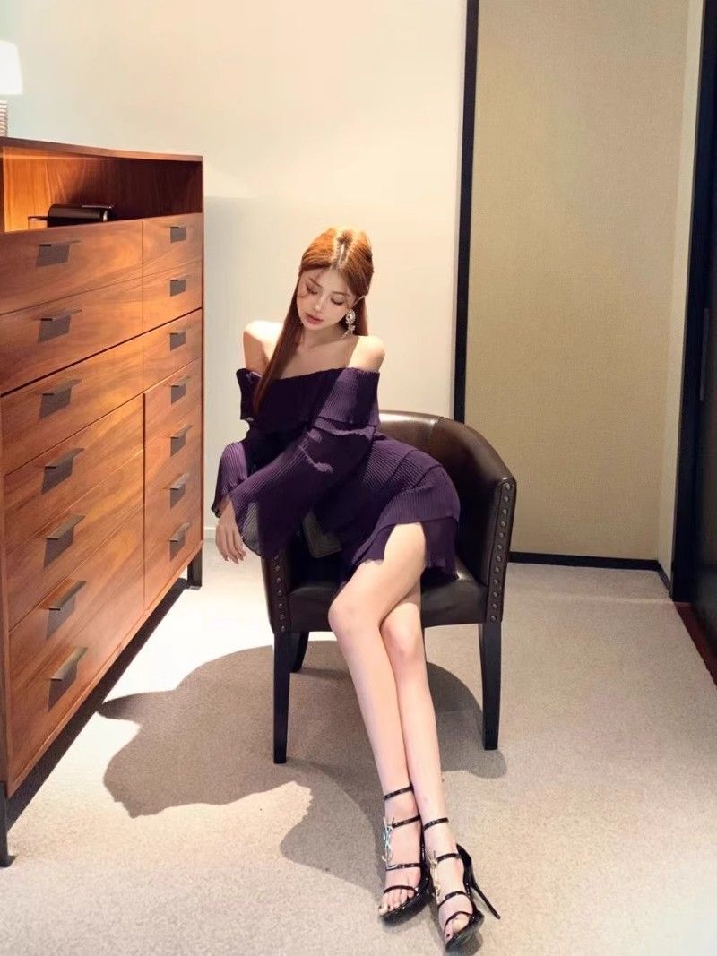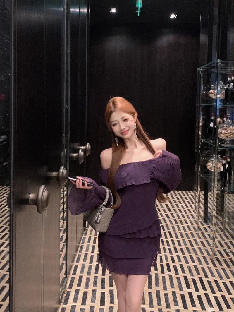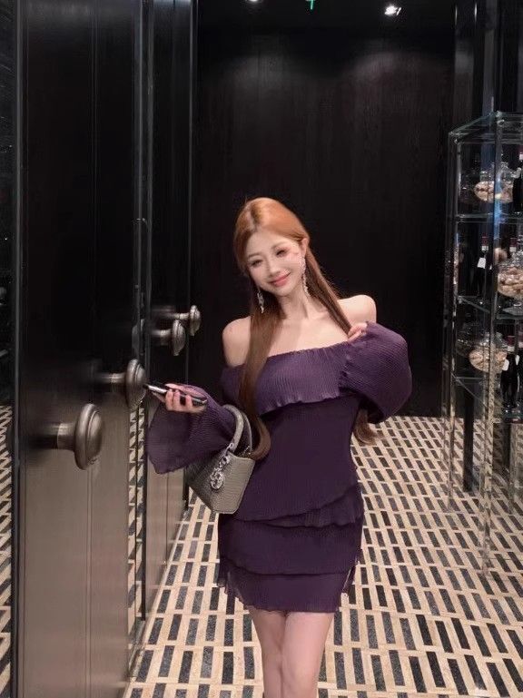 - 法式印花网纱紫色吊带连衣裙女夏季修身显瘦包臀短裙