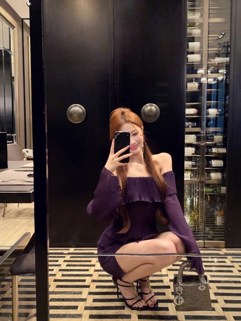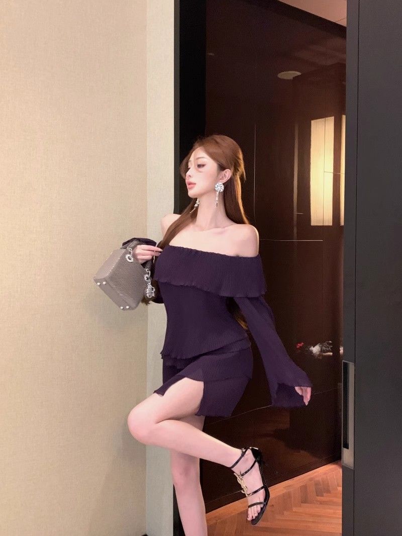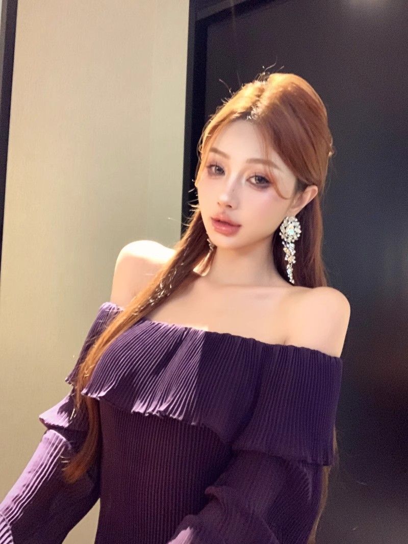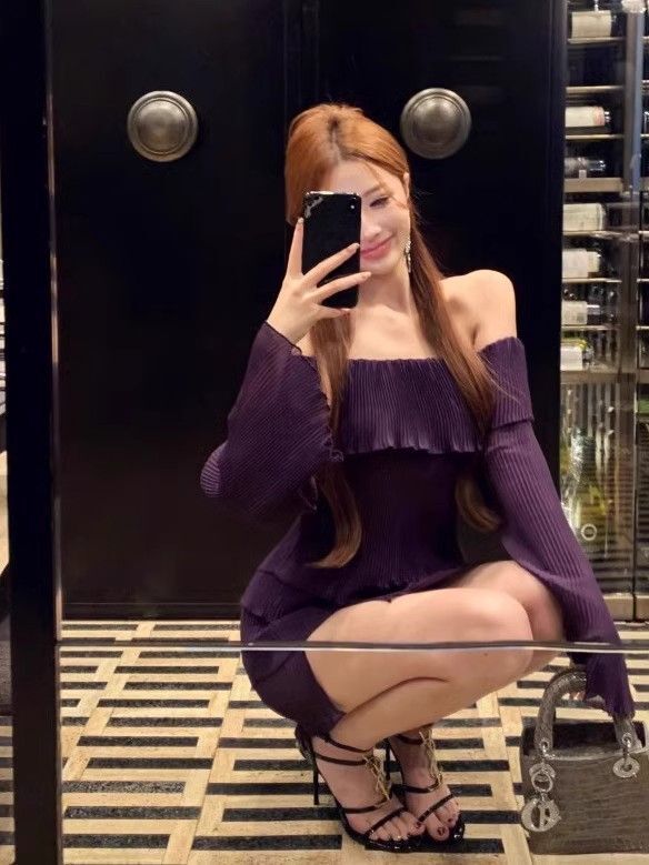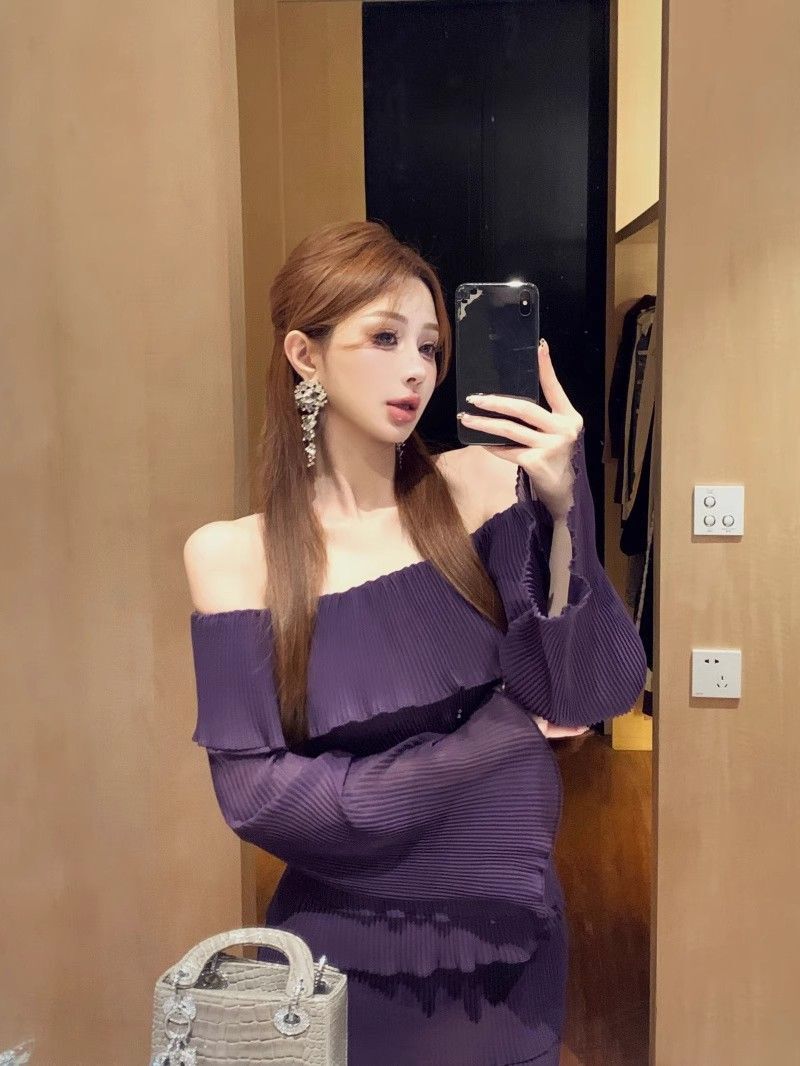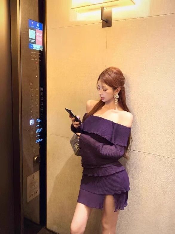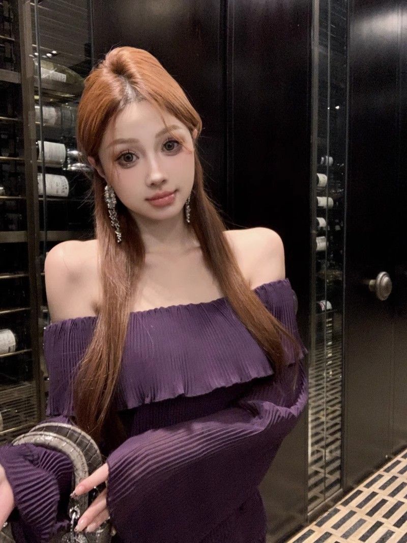 - 法式印花网纱紫色吊带连衣裙女夏季修身显瘦包臀短裙