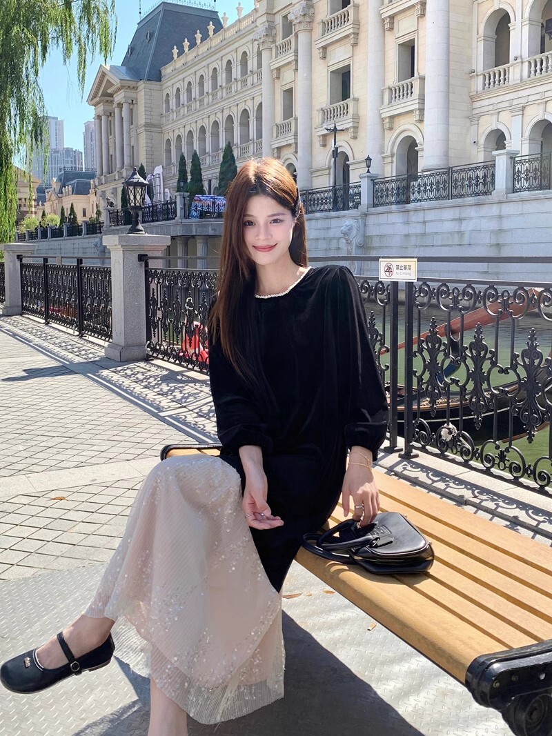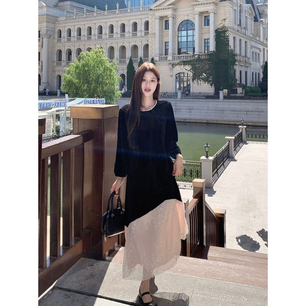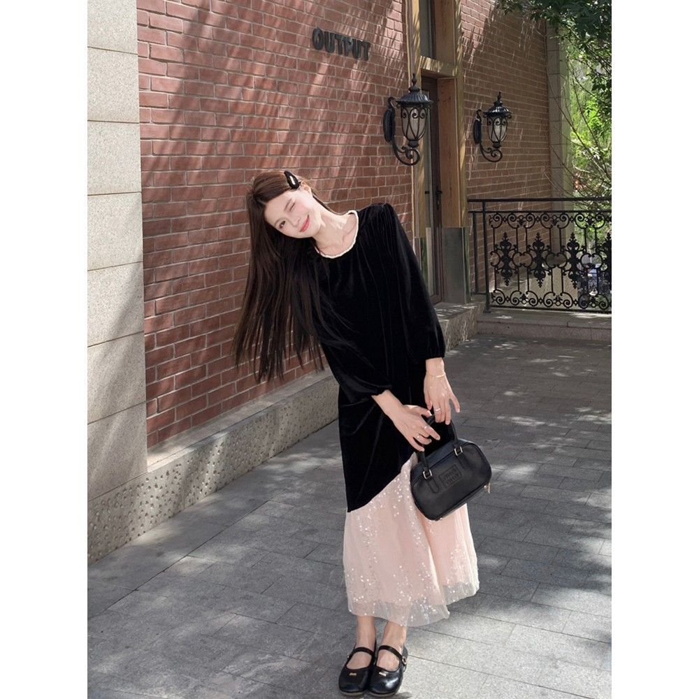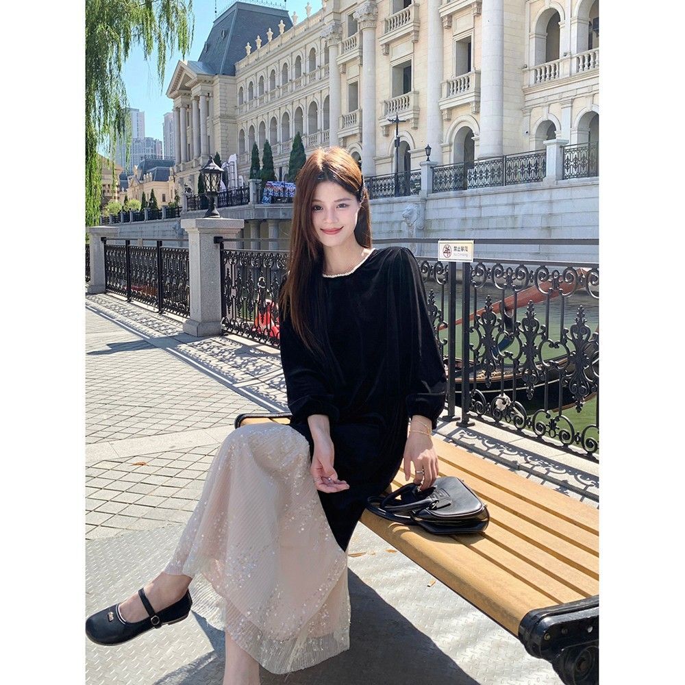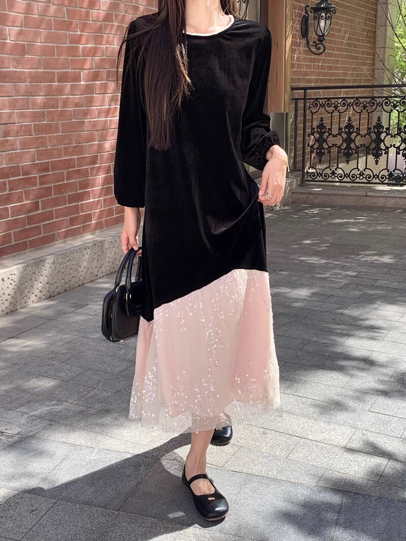 • 赫本风假两件拼接亮片黑色丝绒连衣裙不规则宽松显瘦遮肉网纱长裙