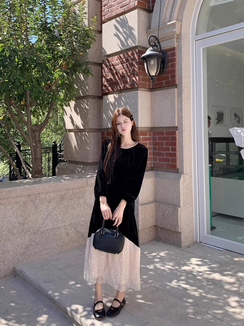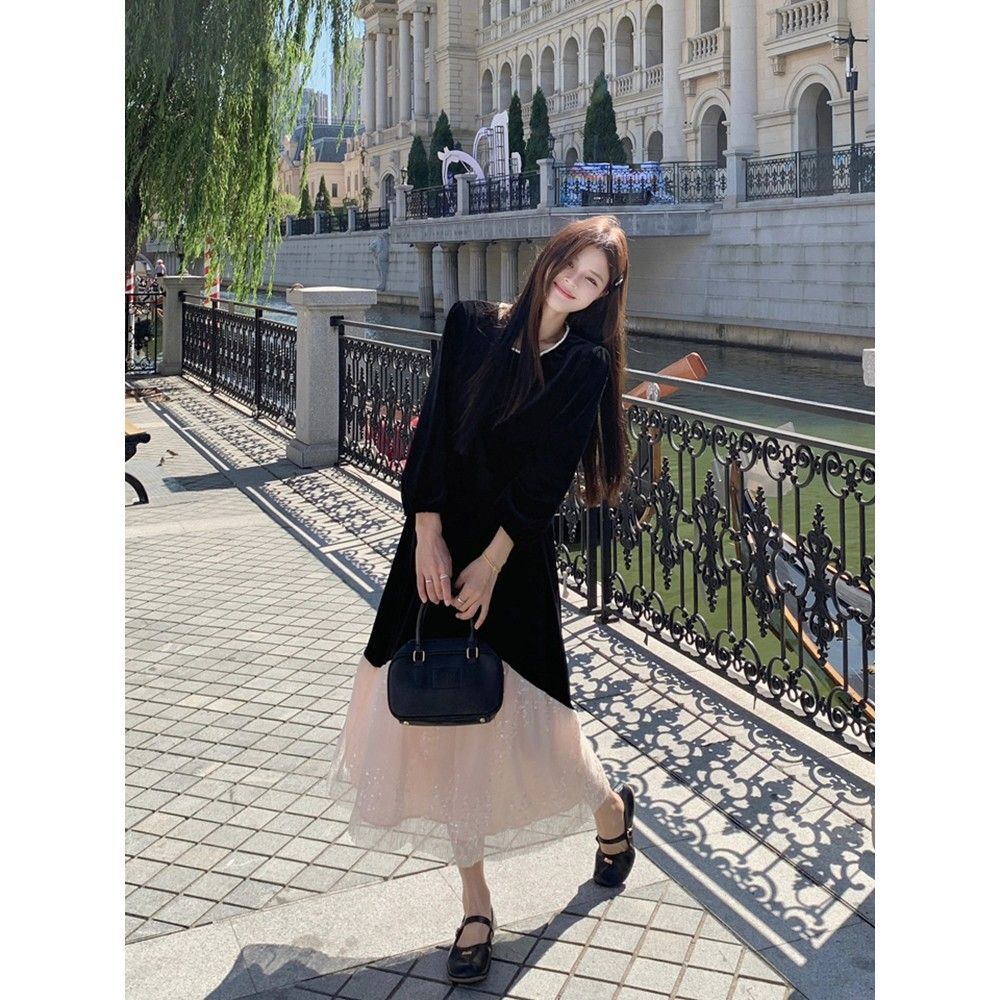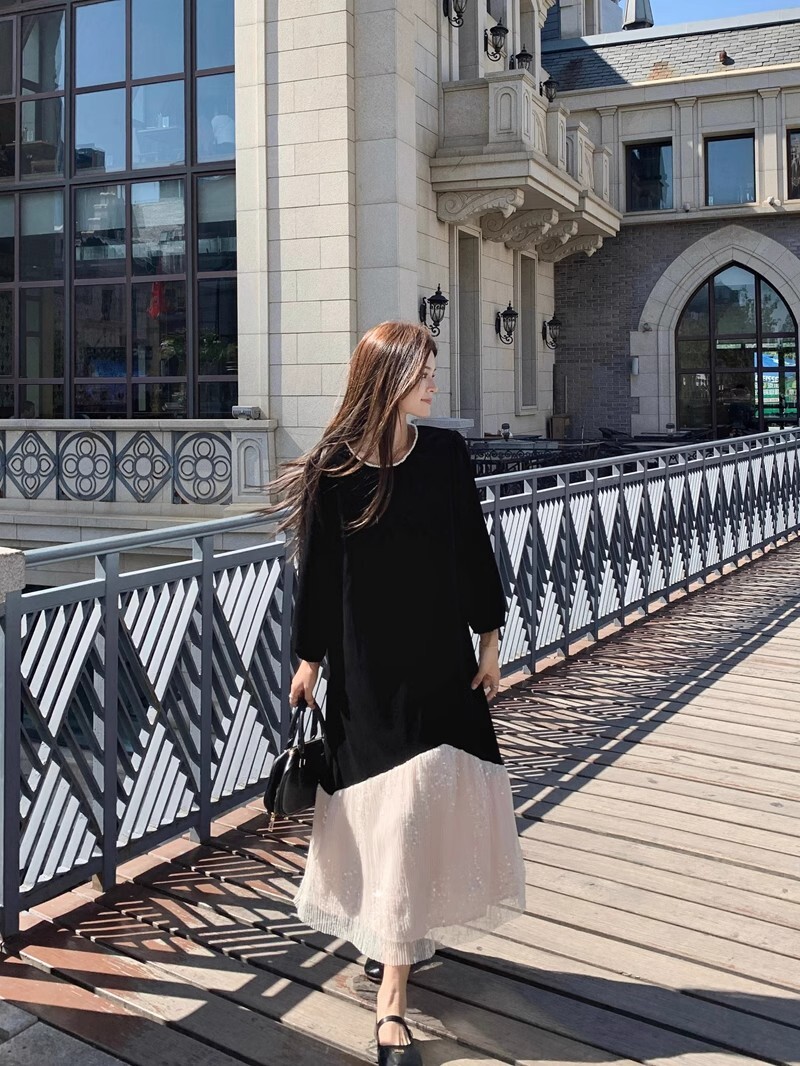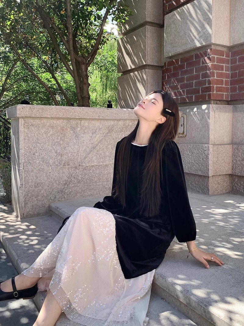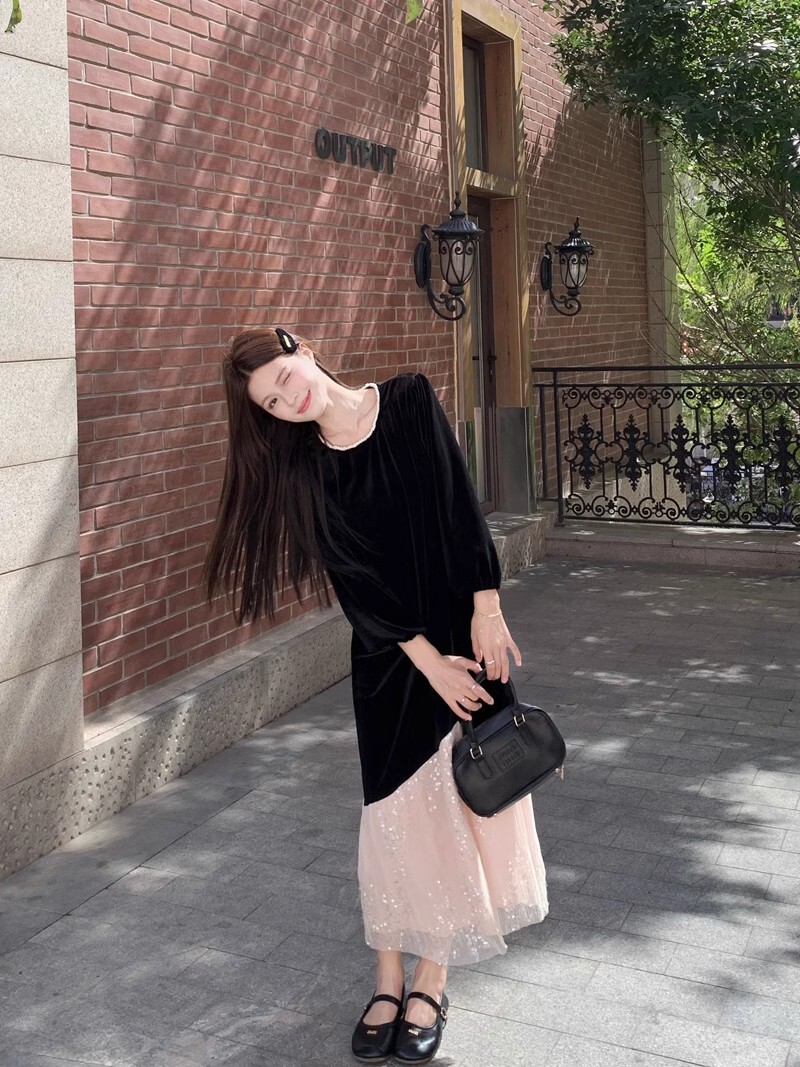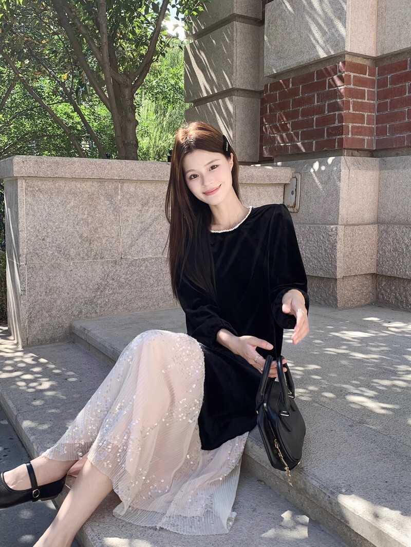 • 赫本风假两件拼接亮片黑色丝绒连衣裙不规则宽松显瘦遮肉网纱长裙