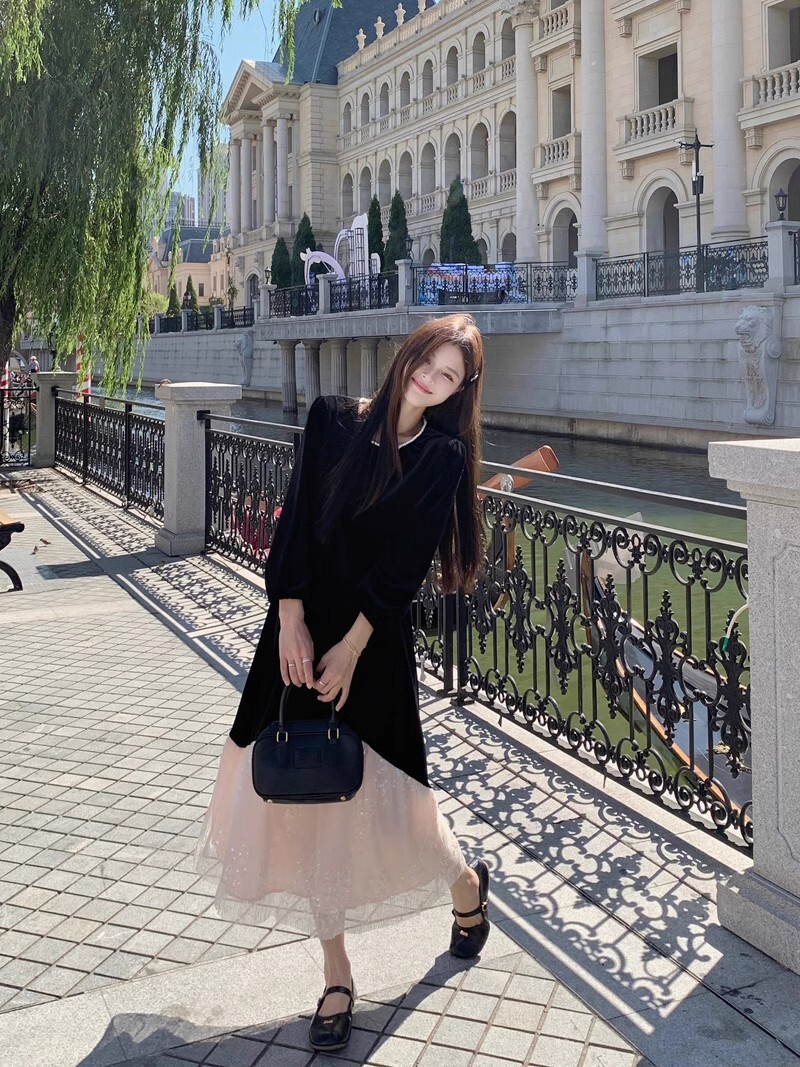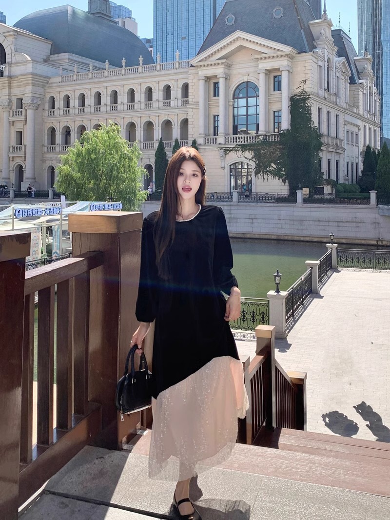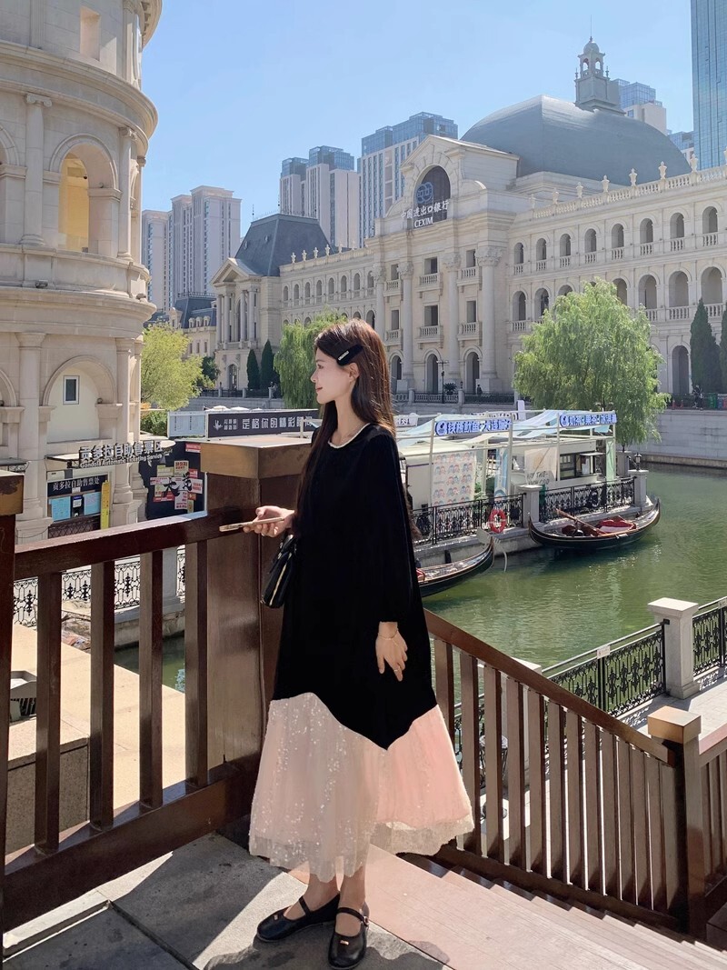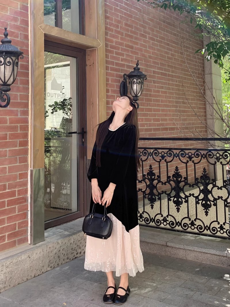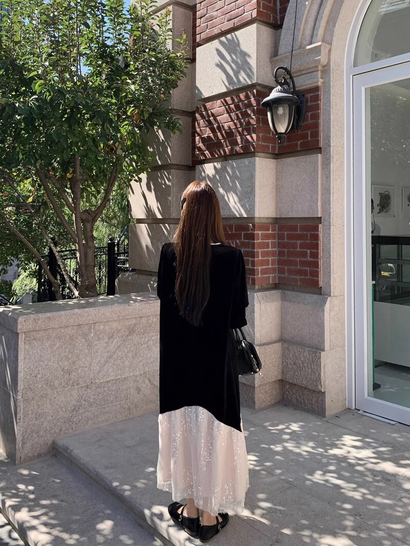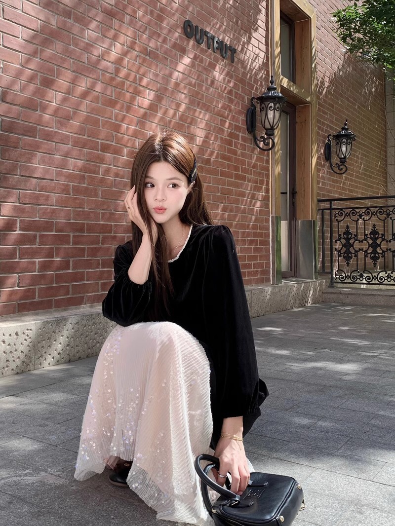 • 赫本风假两件拼接亮片黑色丝绒连衣裙不规则宽松显瘦遮肉网纱长裙