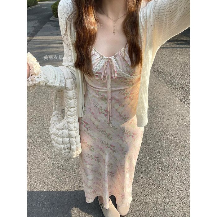 2024春夏新款拼接减龄碎花吊带连衣裙法式气质收腰A字裙