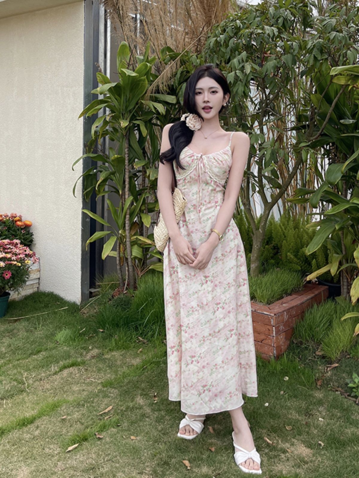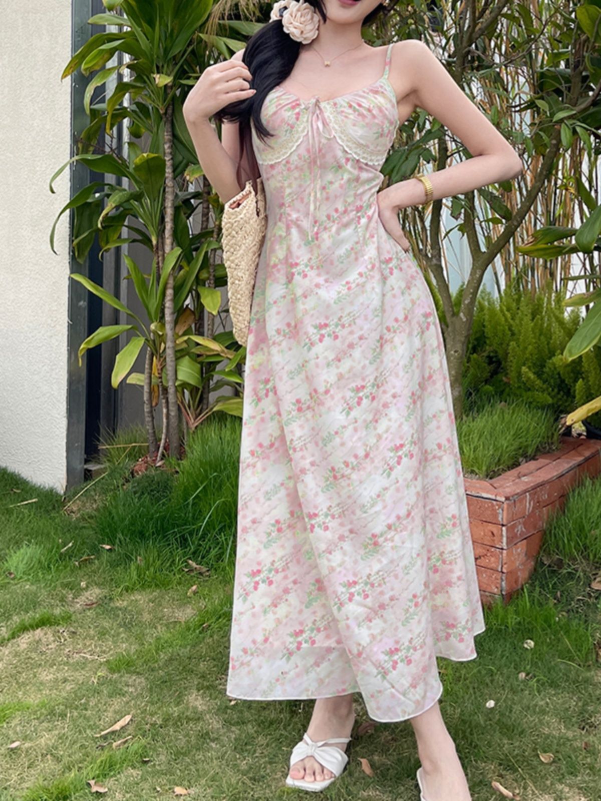 • 2024春夏新款拼接减龄碎花吊带连衣裙法式气质收腰A字裙