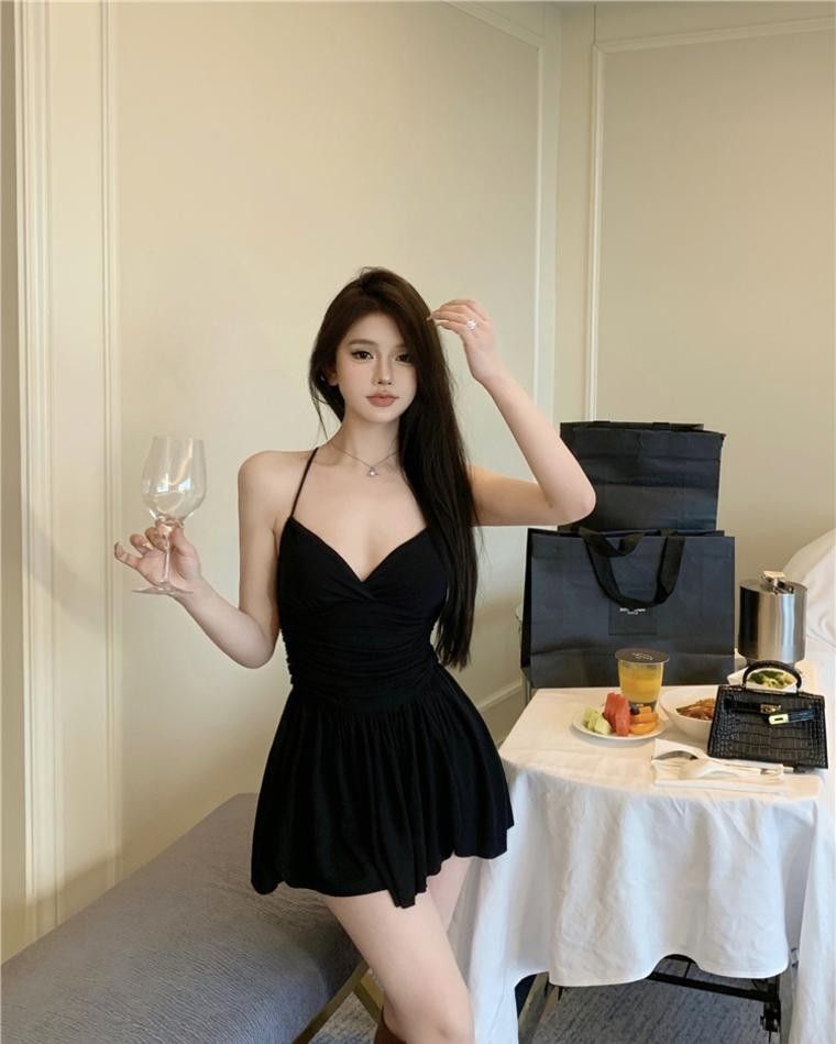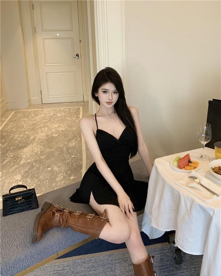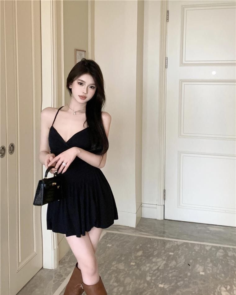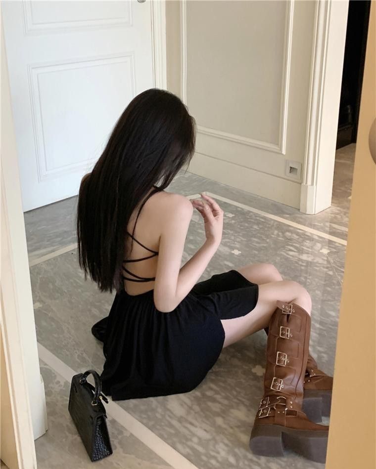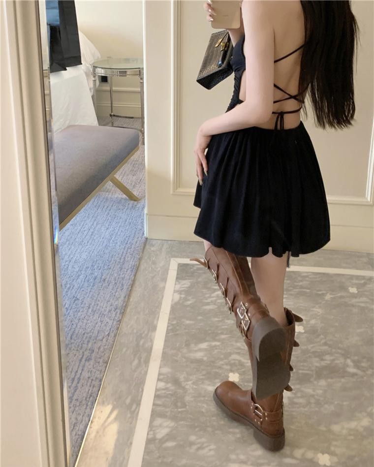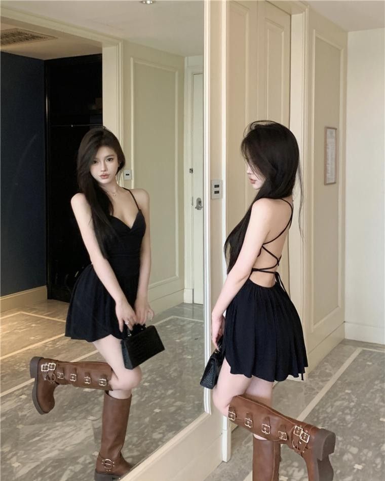 • 辣妹露背吊带连衣裙女夏季无袖高腰开叉芭蕾风性感绑带百褶短裙子