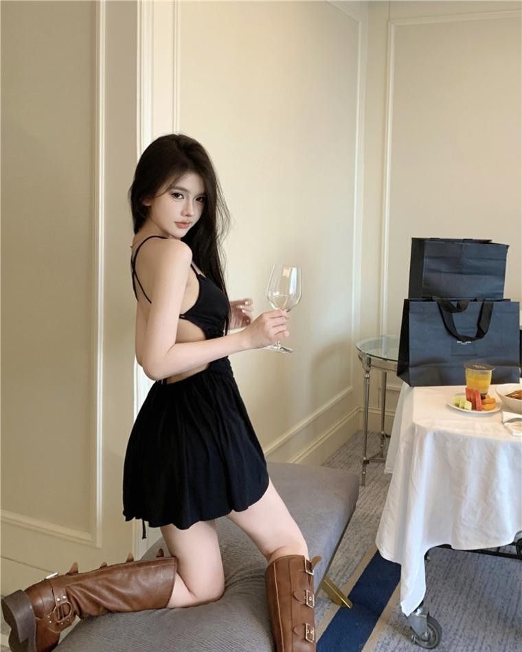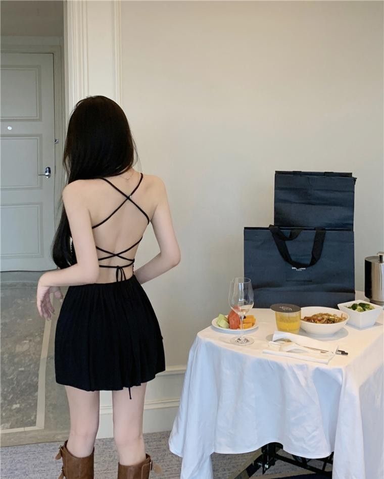 辣妹露背吊带连衣裙女夏季无袖高腰开叉芭蕾风性感绑带百褶短裙子