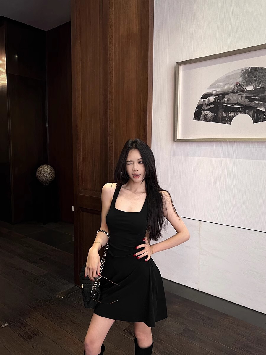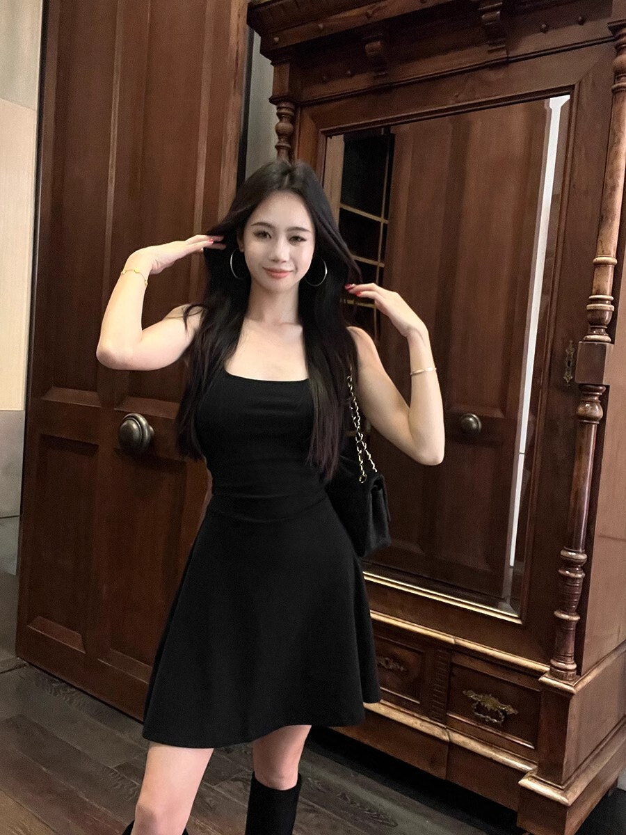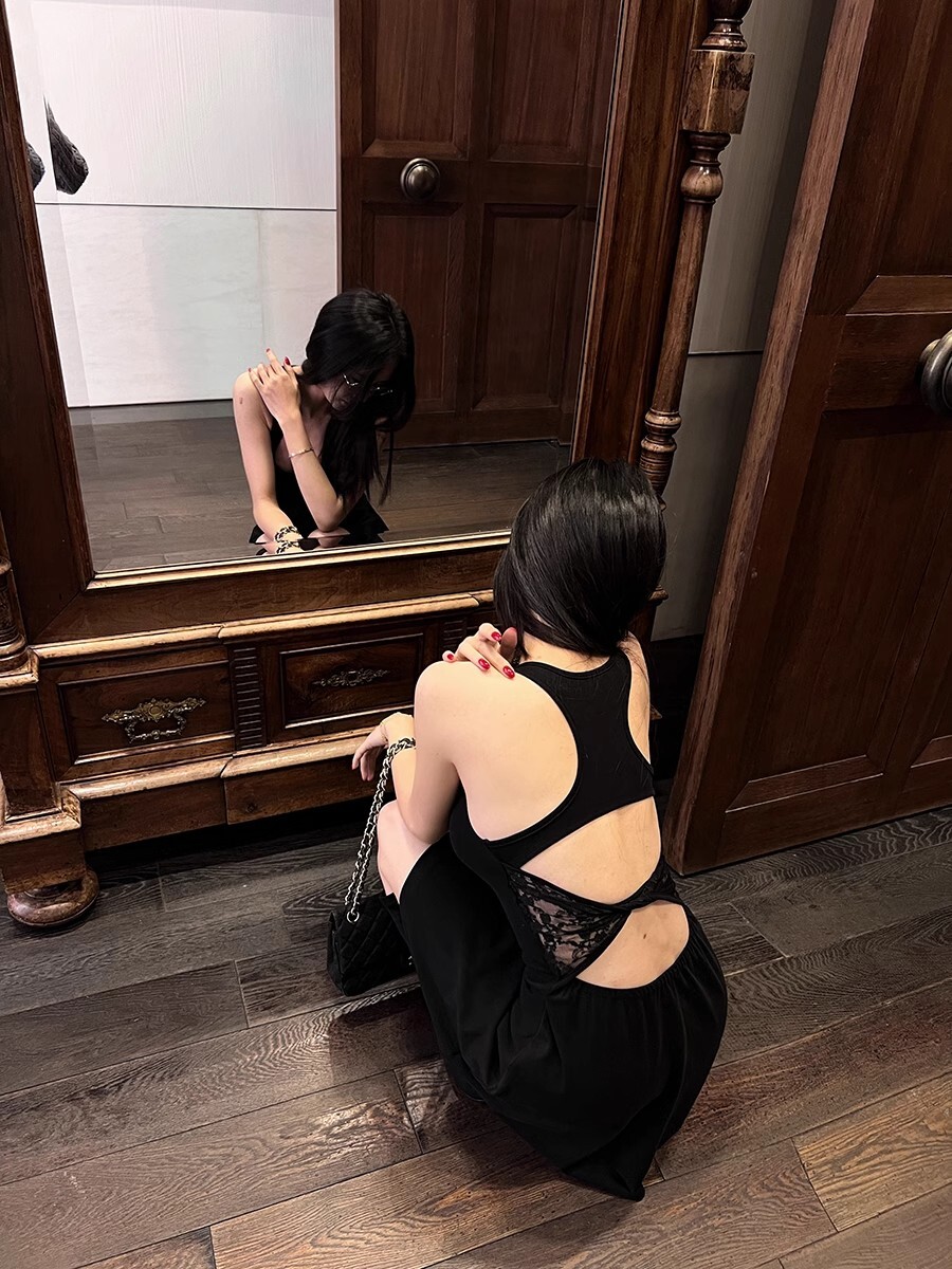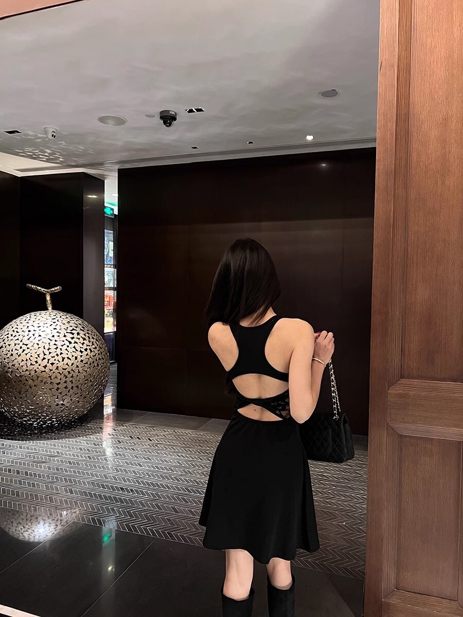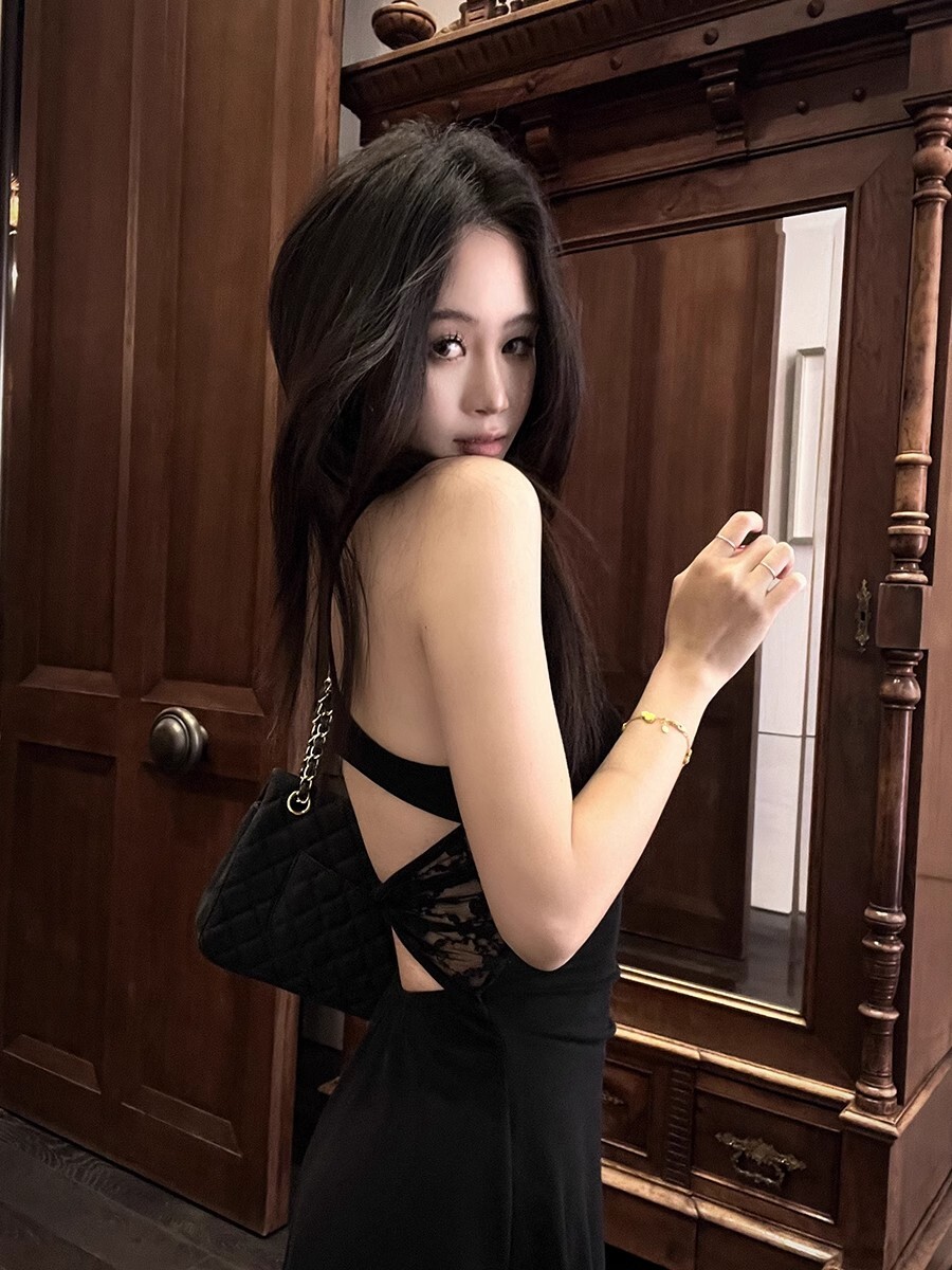 • 蕾丝拼接露背吊带连衣裙女夏季黑色修身裙子纯欲收腰显瘦a字短裙