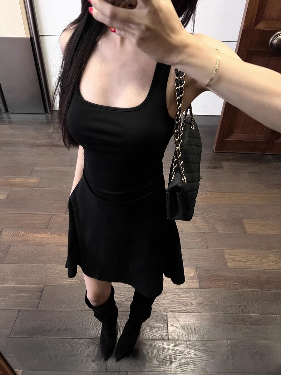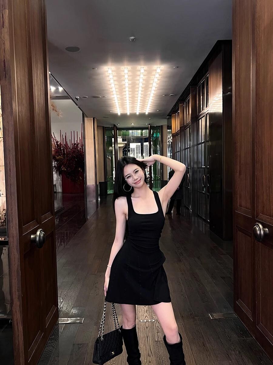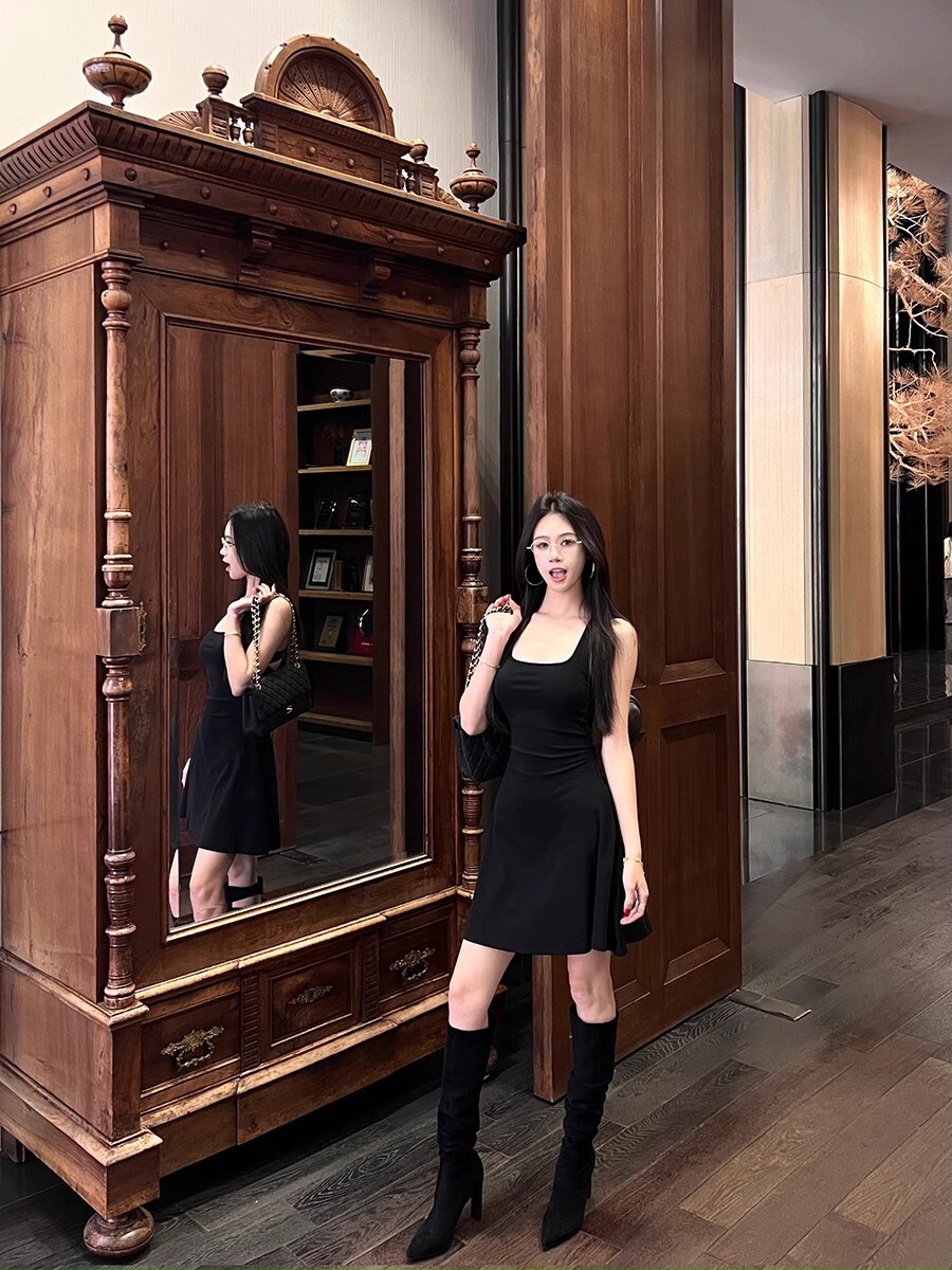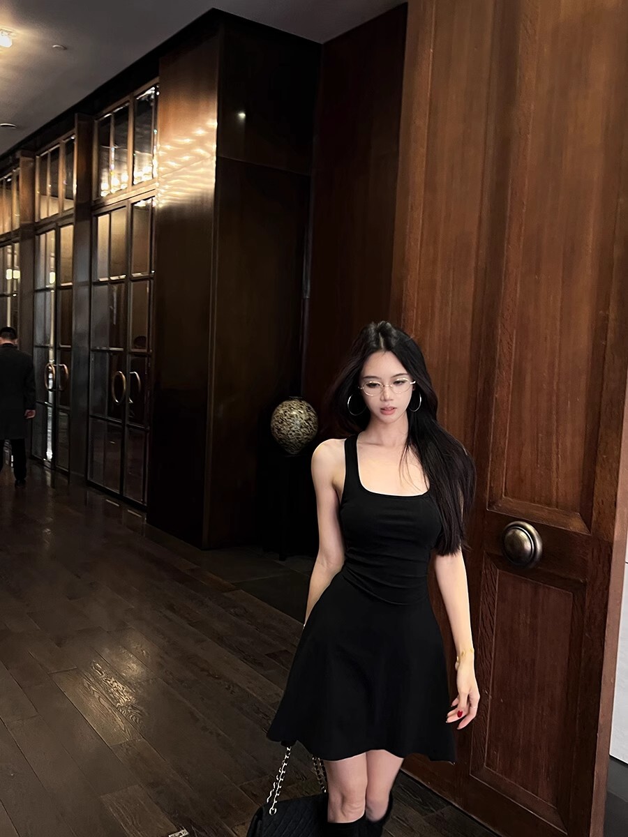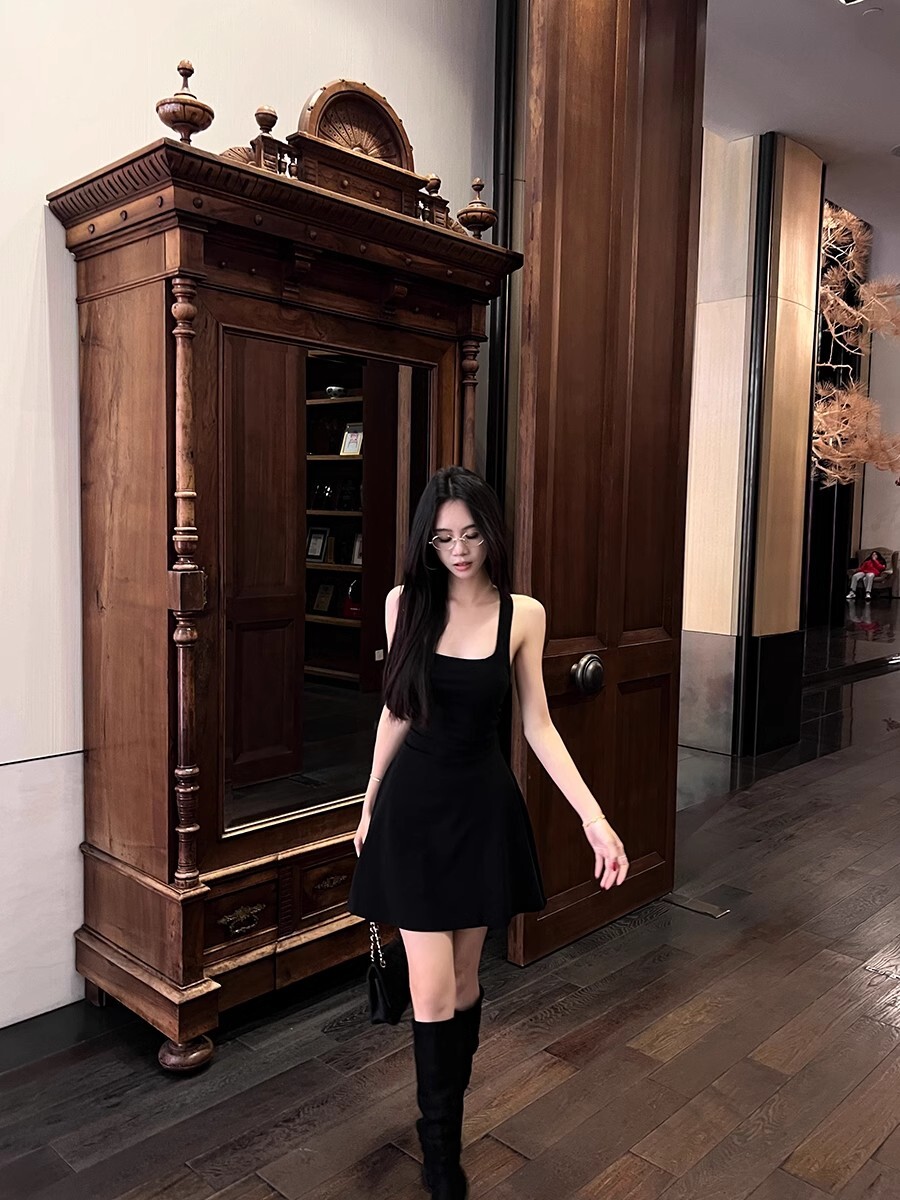 • 蕾丝拼接露背吊带连衣裙女夏季黑色修身裙子纯欲收腰显瘦a字短裙