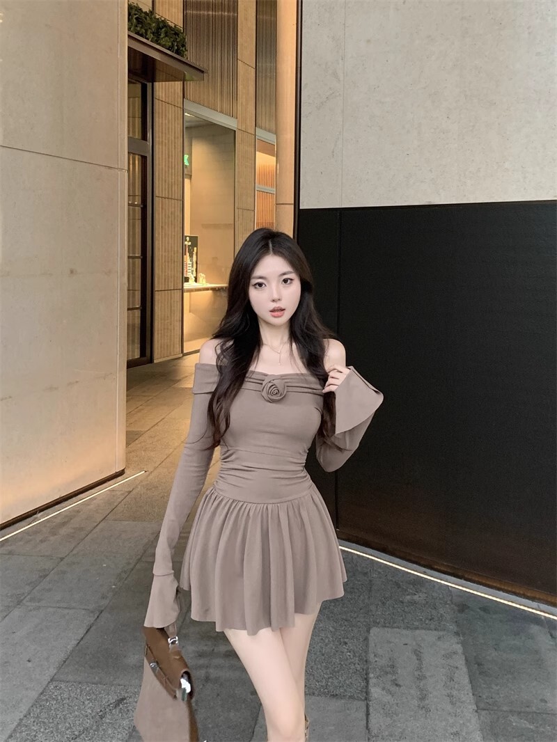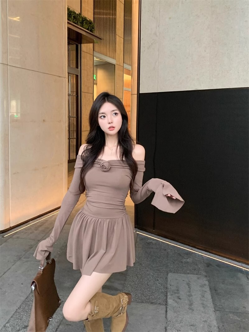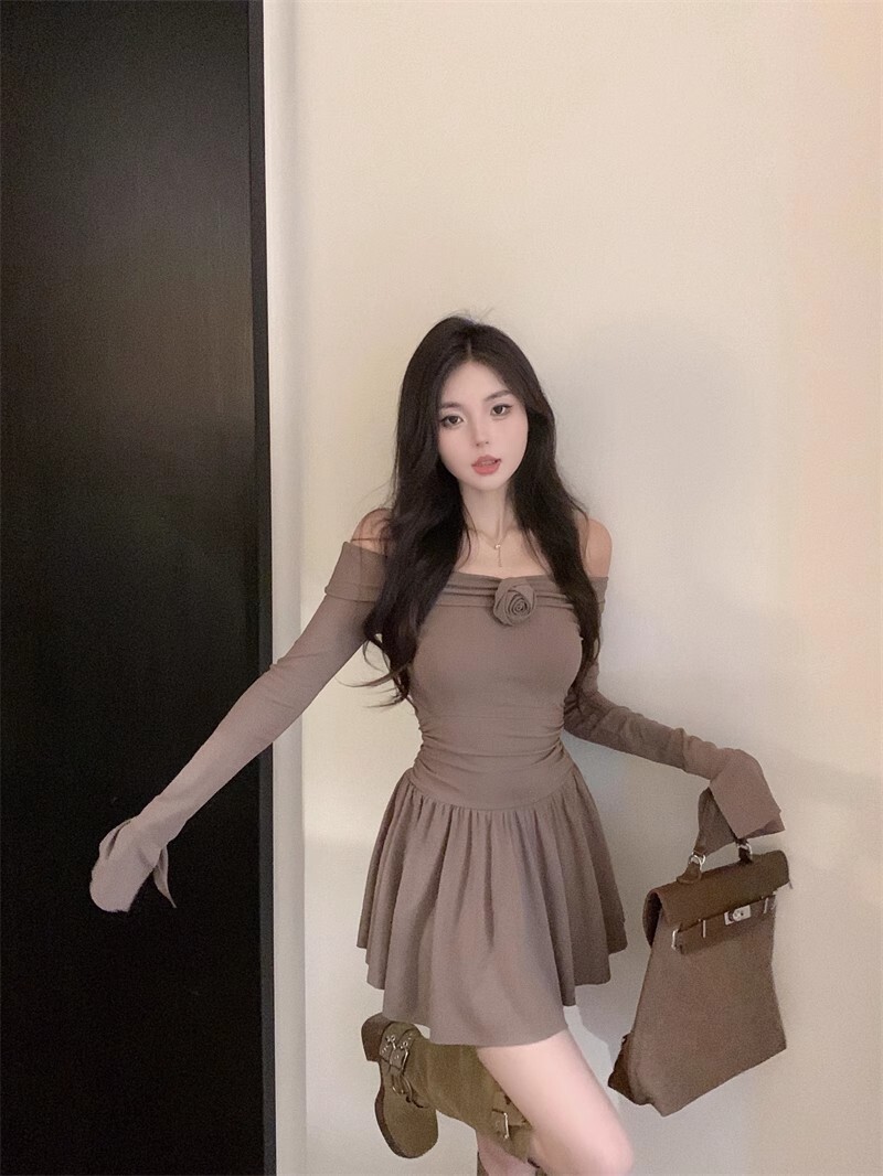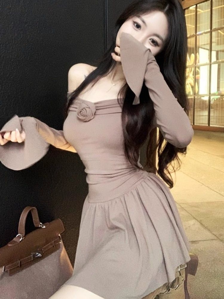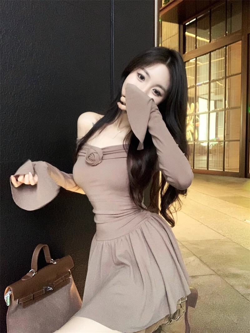 • 立体玫瑰花朵连衣裙秋装新款小个子洋气收腰显瘦性感一字肩A字裙