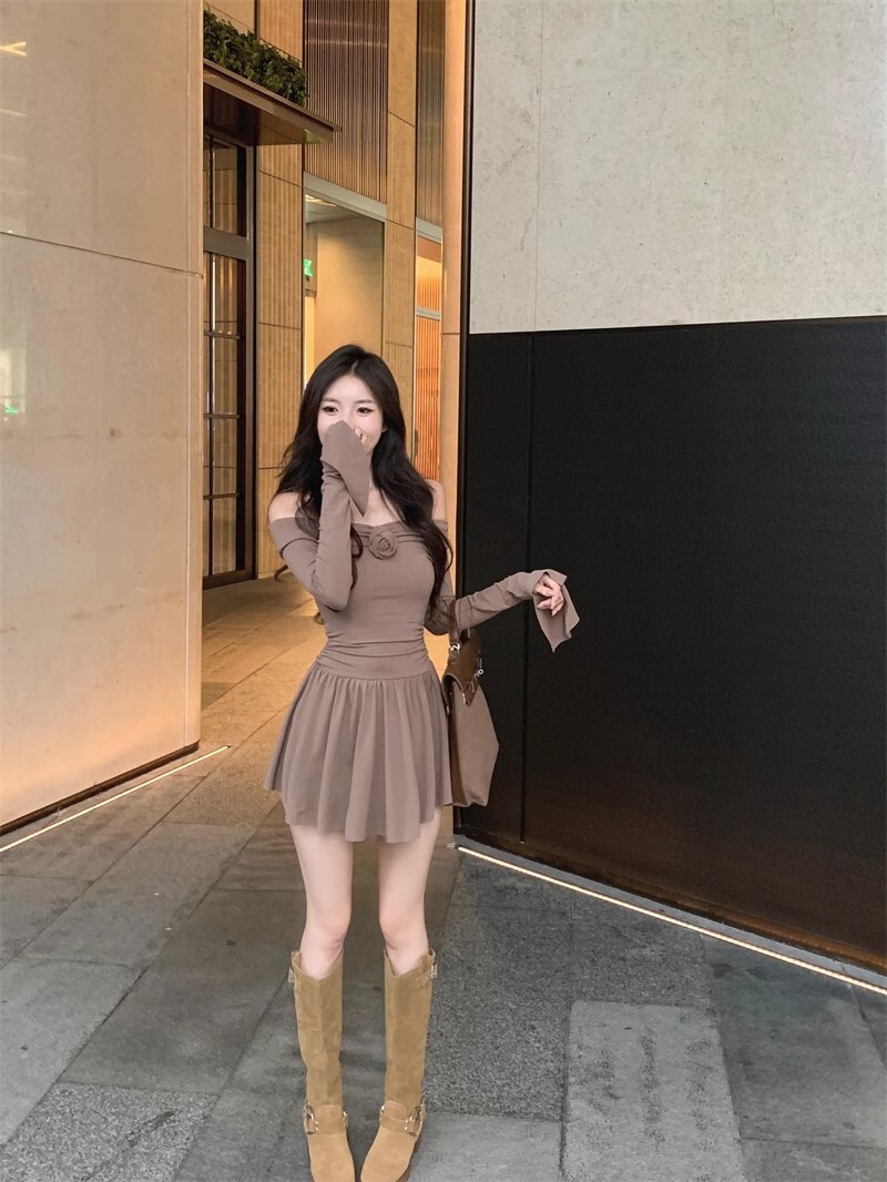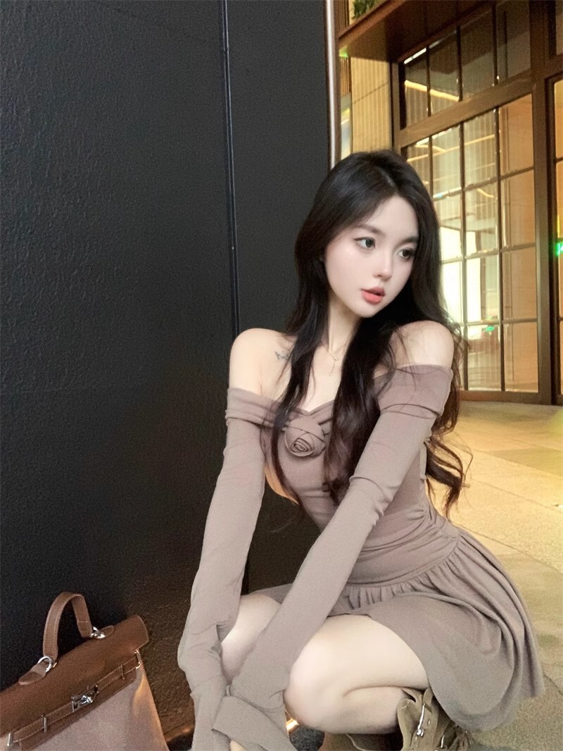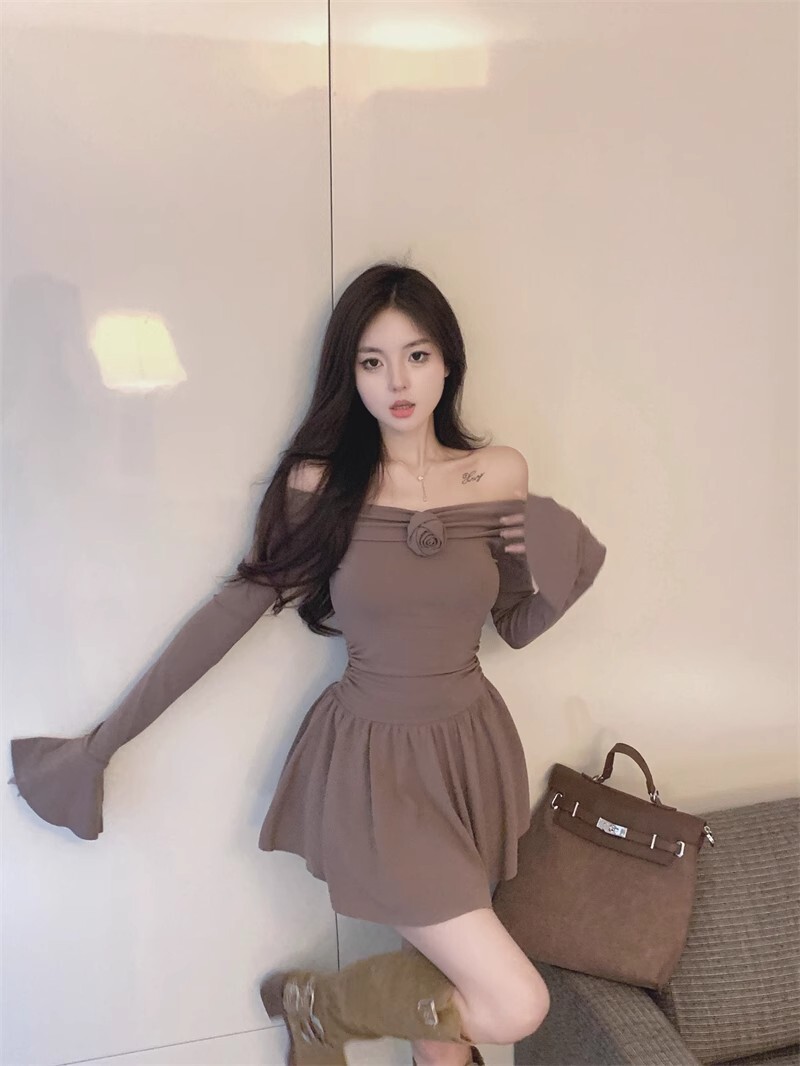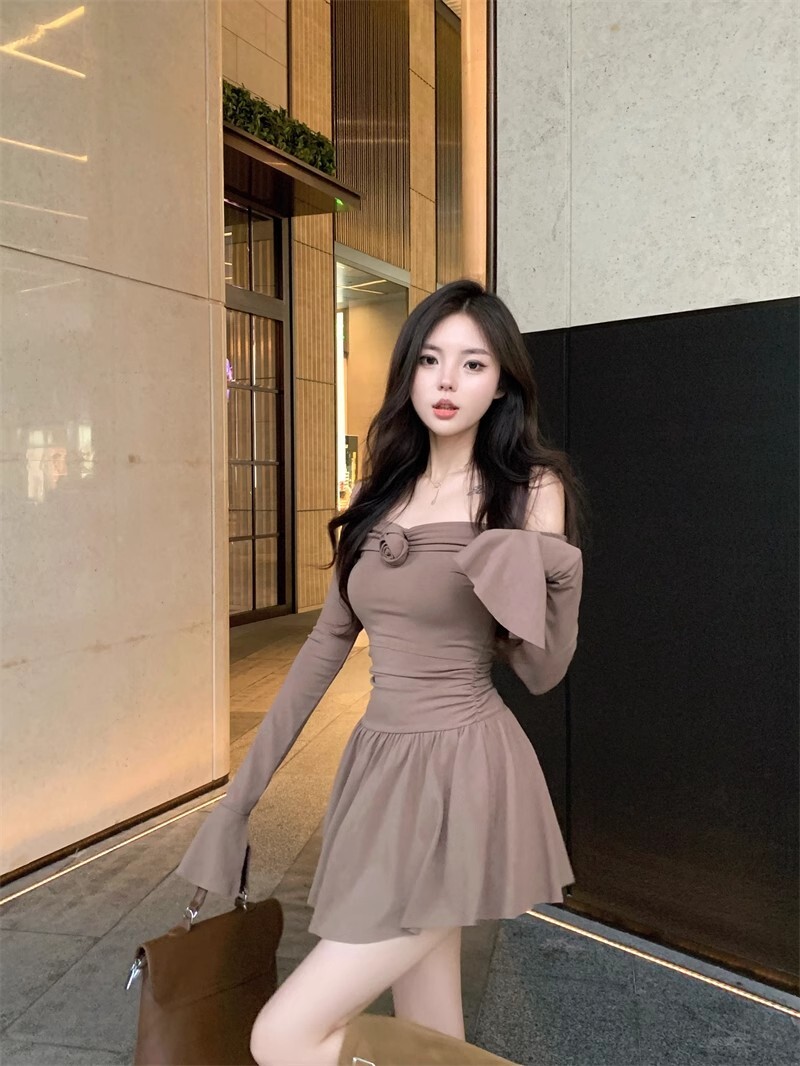 • 立体玫瑰花朵连衣裙秋装新款小个子洋气收腰显瘦性感一字肩A字裙