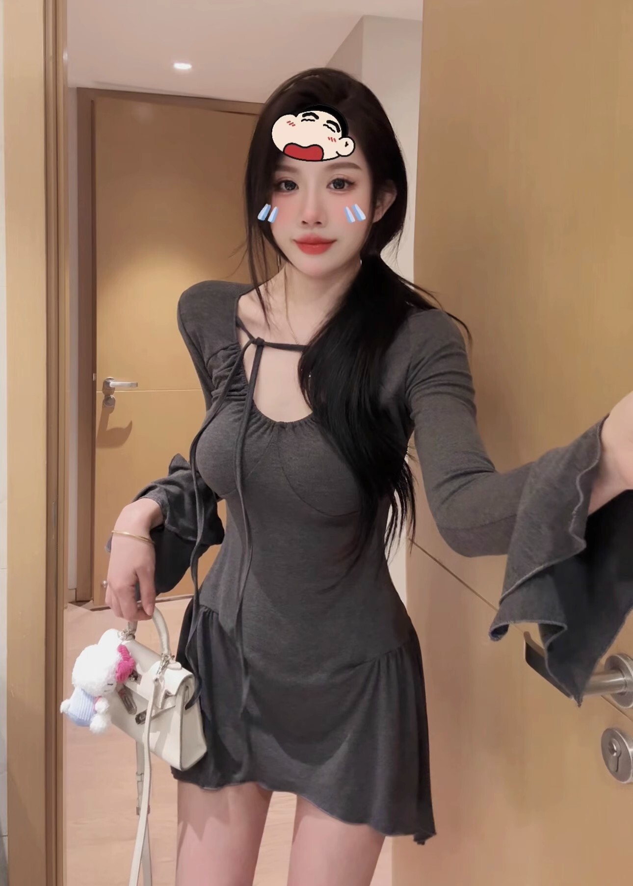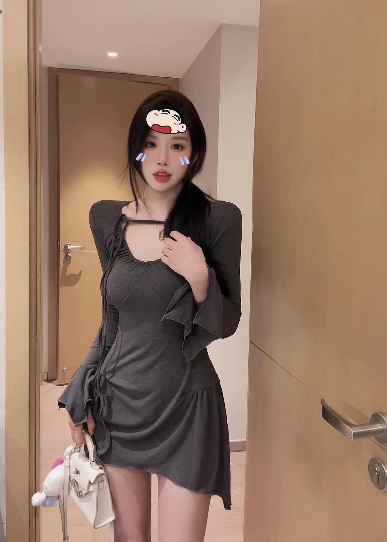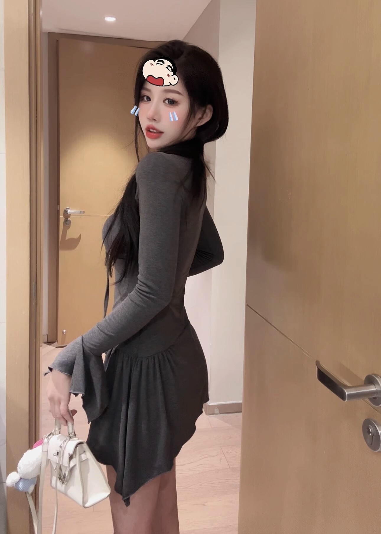 • 纯欲性感辣妹不规则长袖收腰连衣裙显瘦喇叭袖包臀短裙打底a字裙