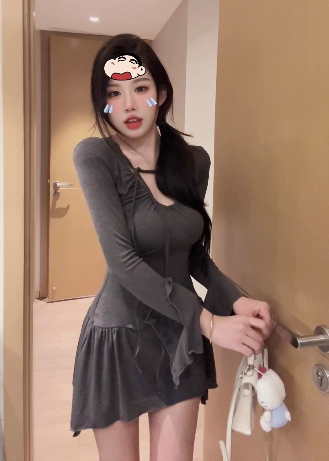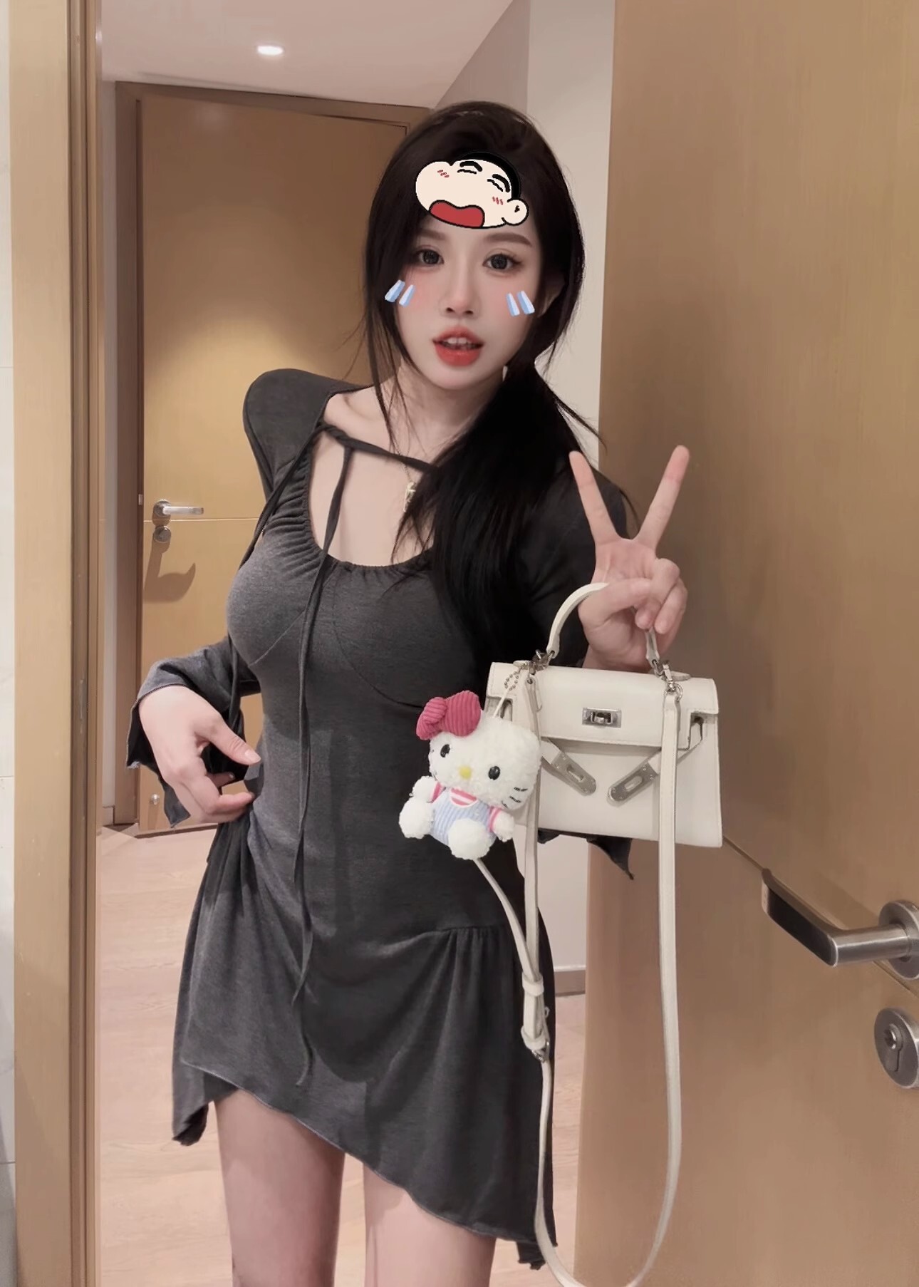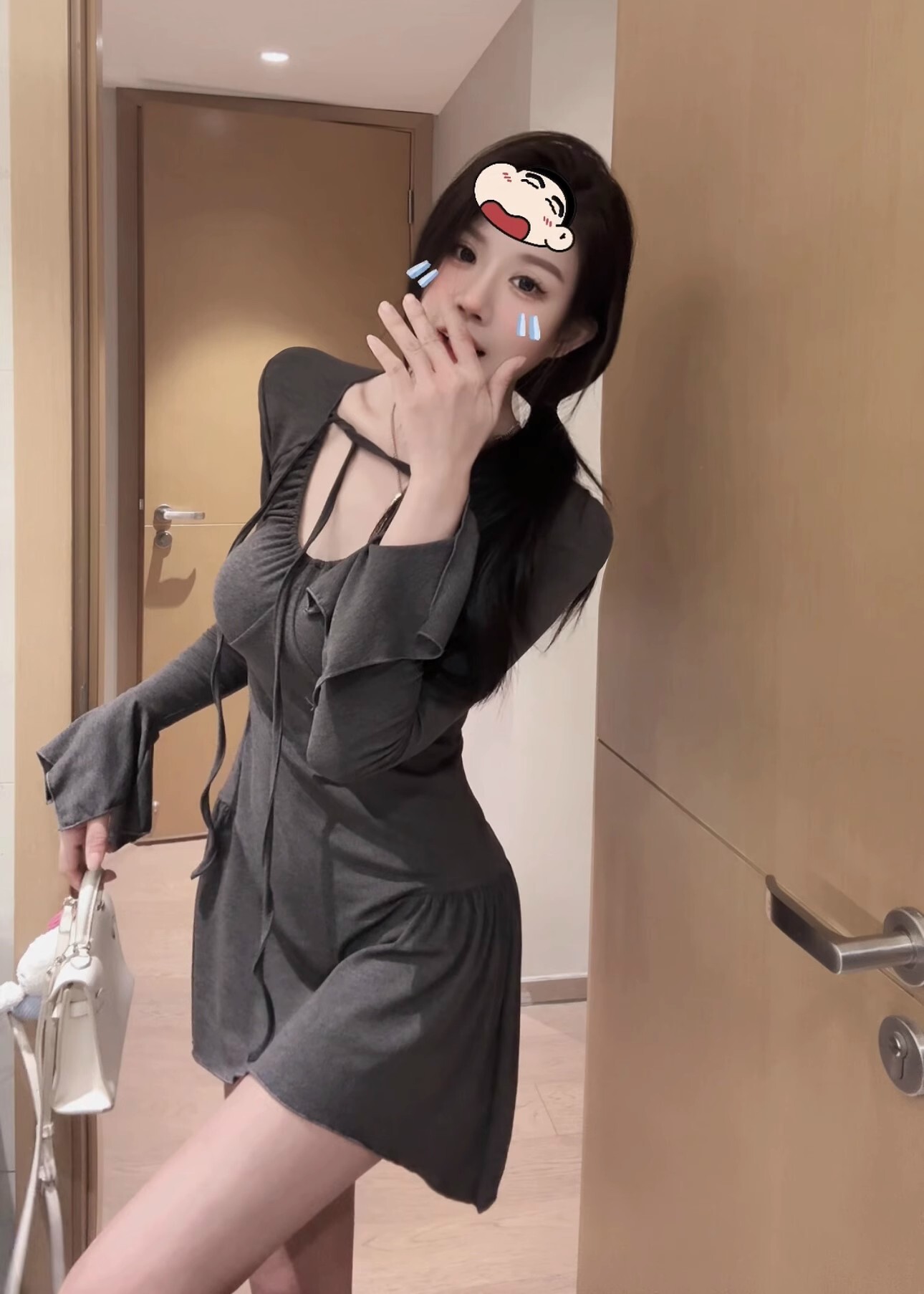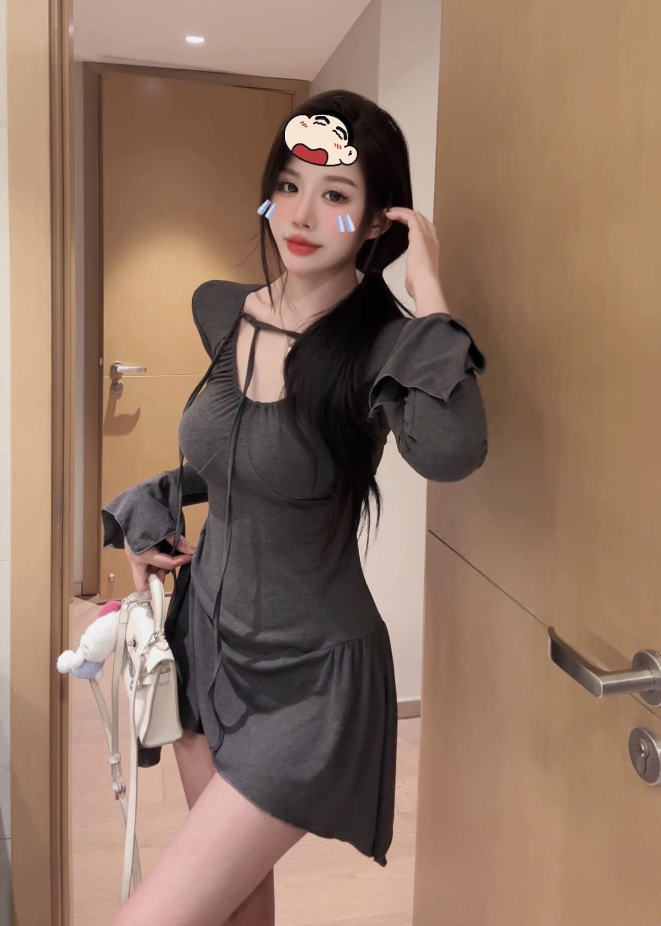 • 纯欲性感辣妹不规则长袖收腰连衣裙显瘦喇叭袖包臀短裙打底a字裙