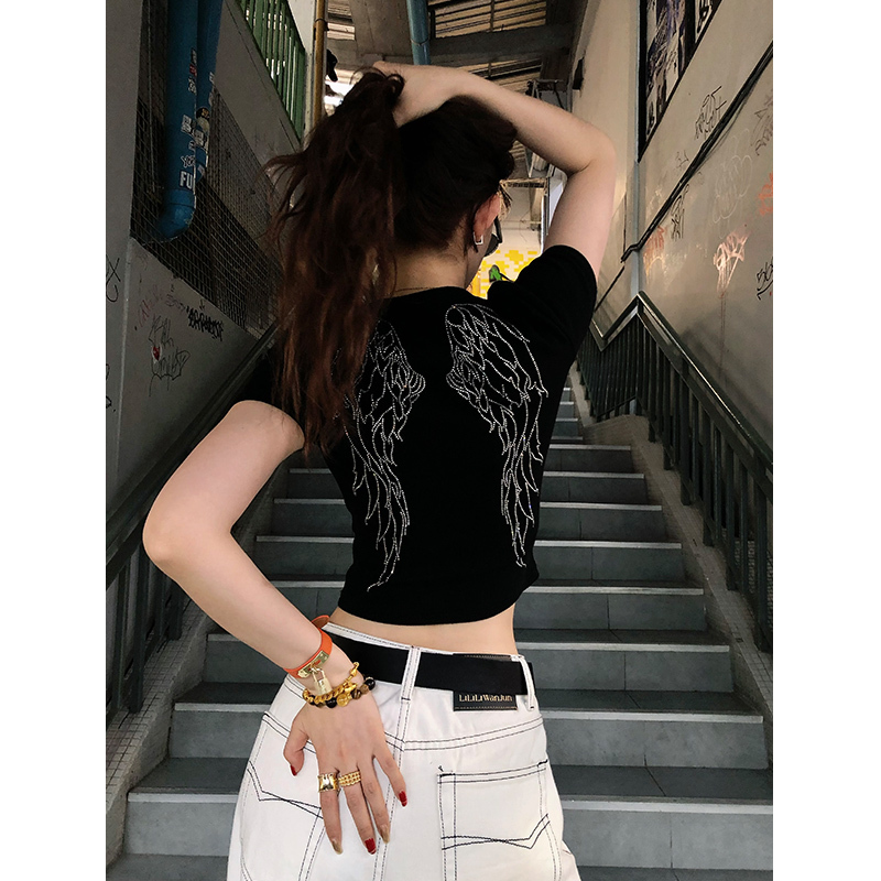 • 1*1纯棉 高弹力天使翅膀显瘦辣妹短款T恤上衣女碎钻打底衫