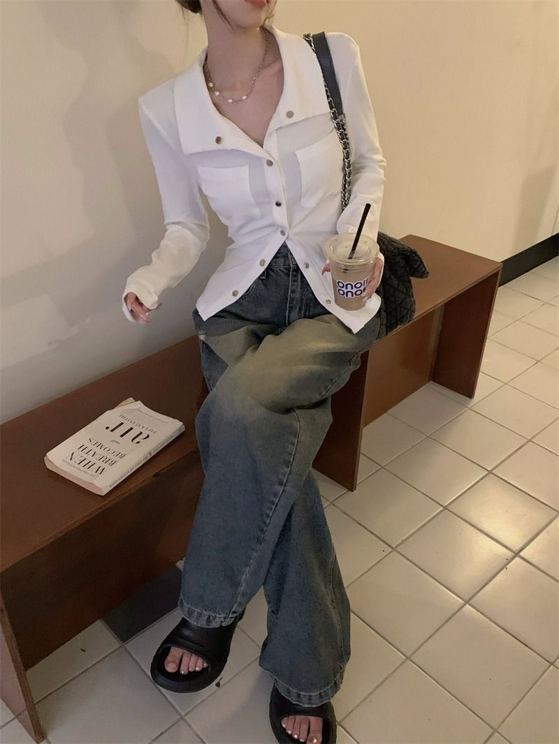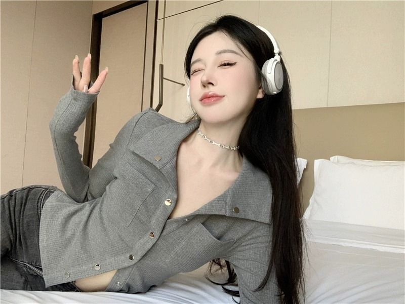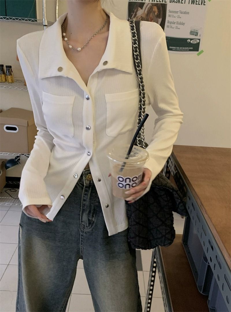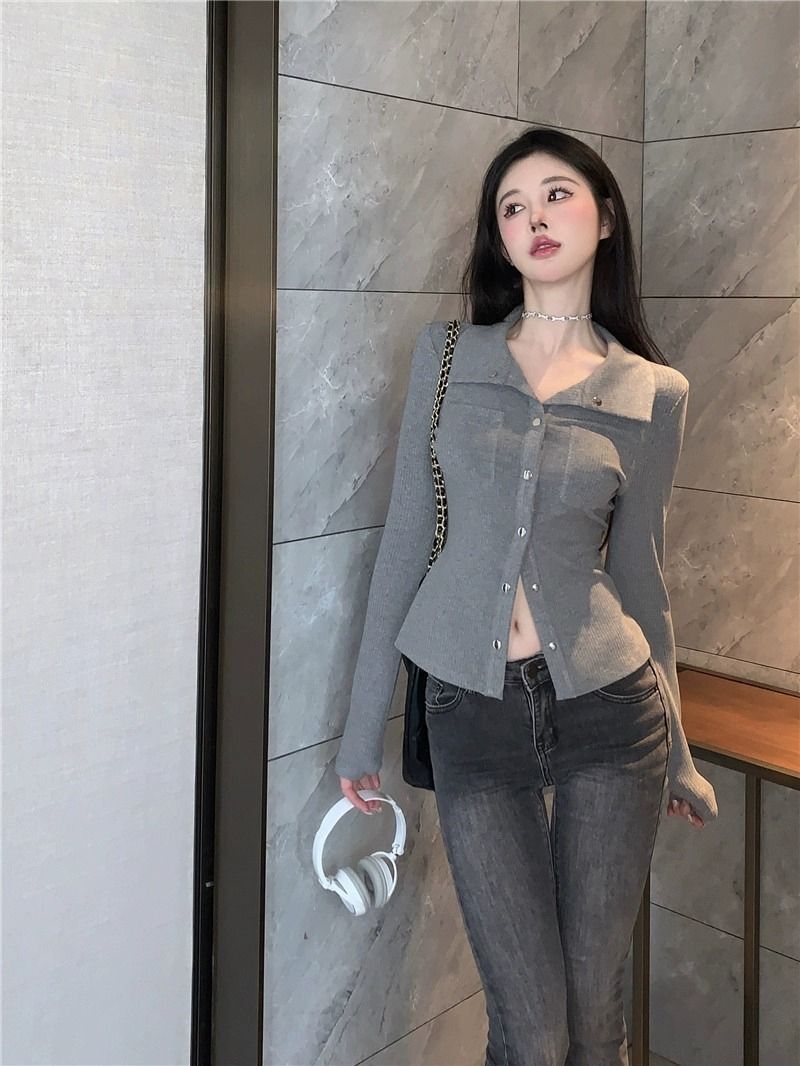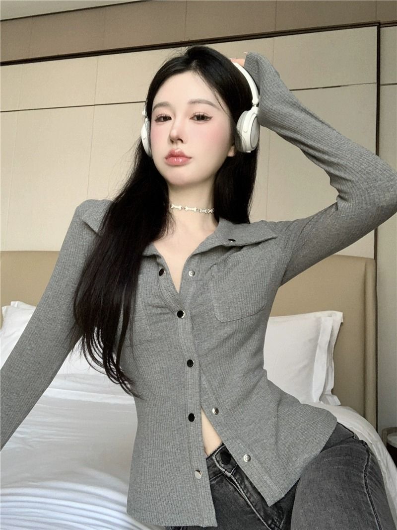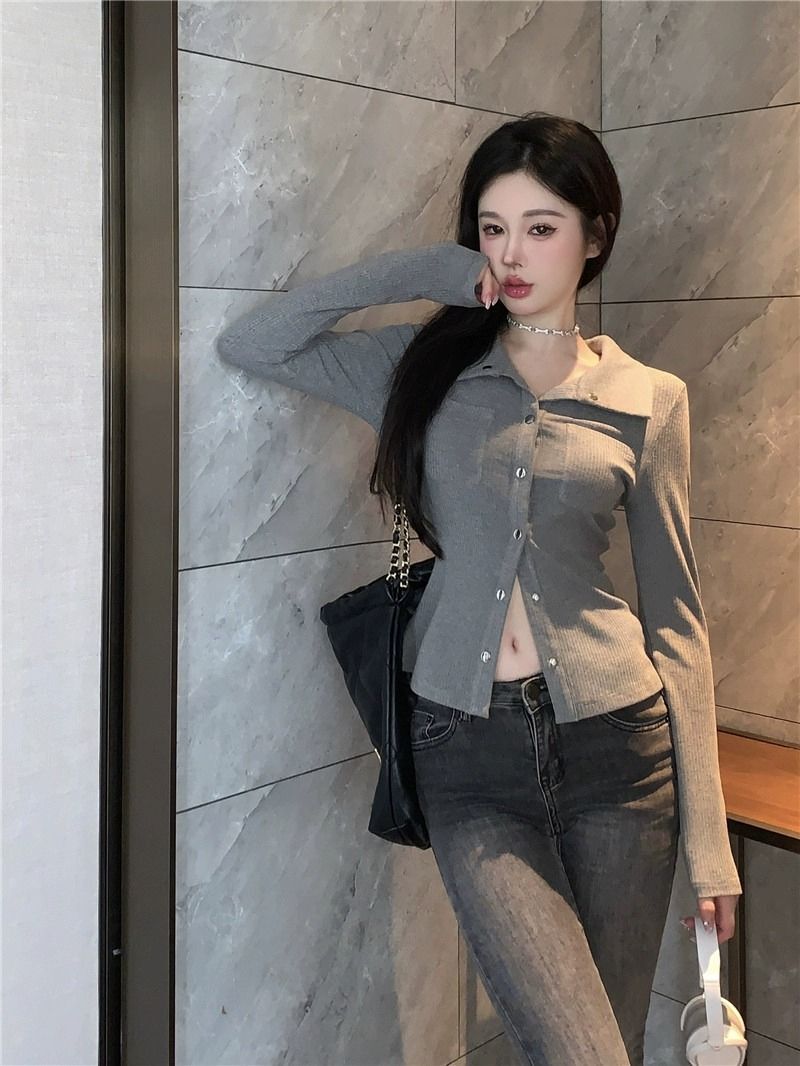 • MR 仿棉螺纹 POLO领短款女早秋薄款灰色长袖辣妹修身