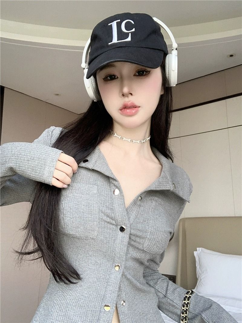MR 仿棉螺纹 POLO领短款女早秋薄款灰色长袖辣妹修身