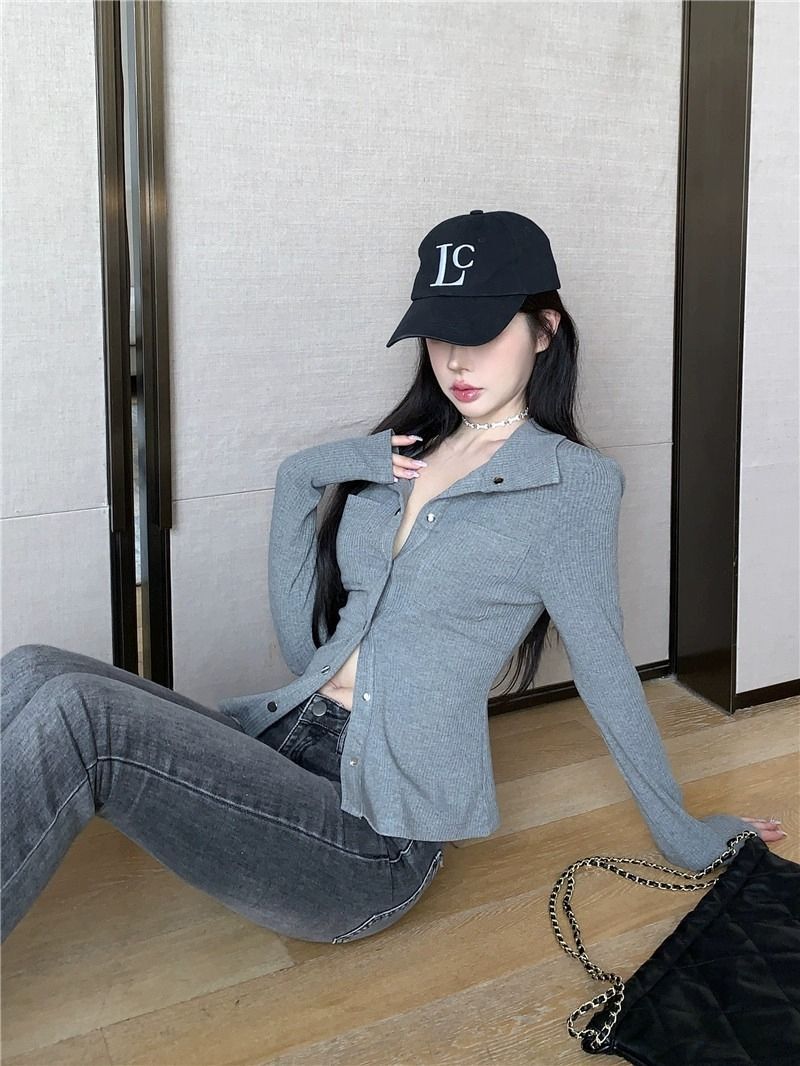 • MR  仿棉螺纹  POLO领短款女早秋薄款灰色长袖辣妹修身