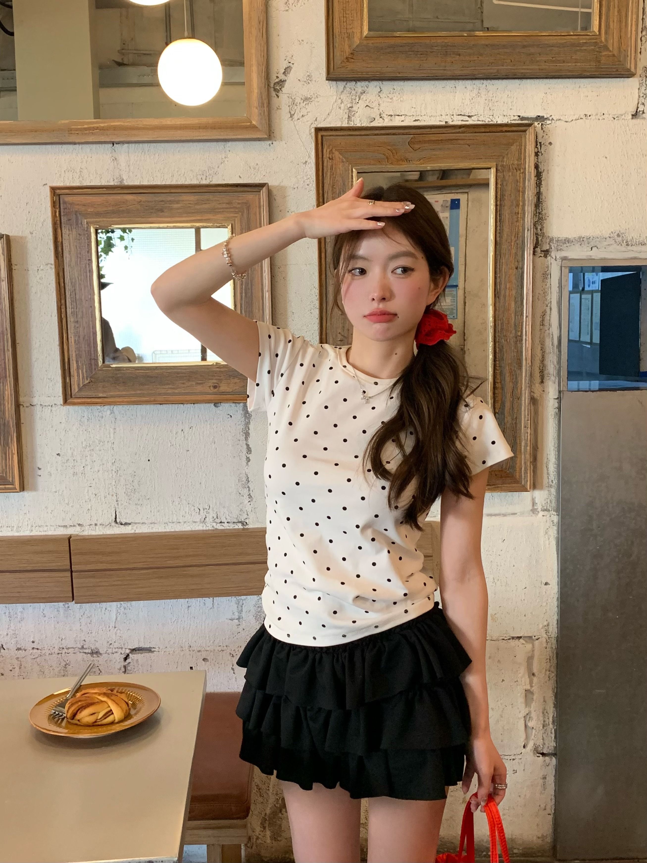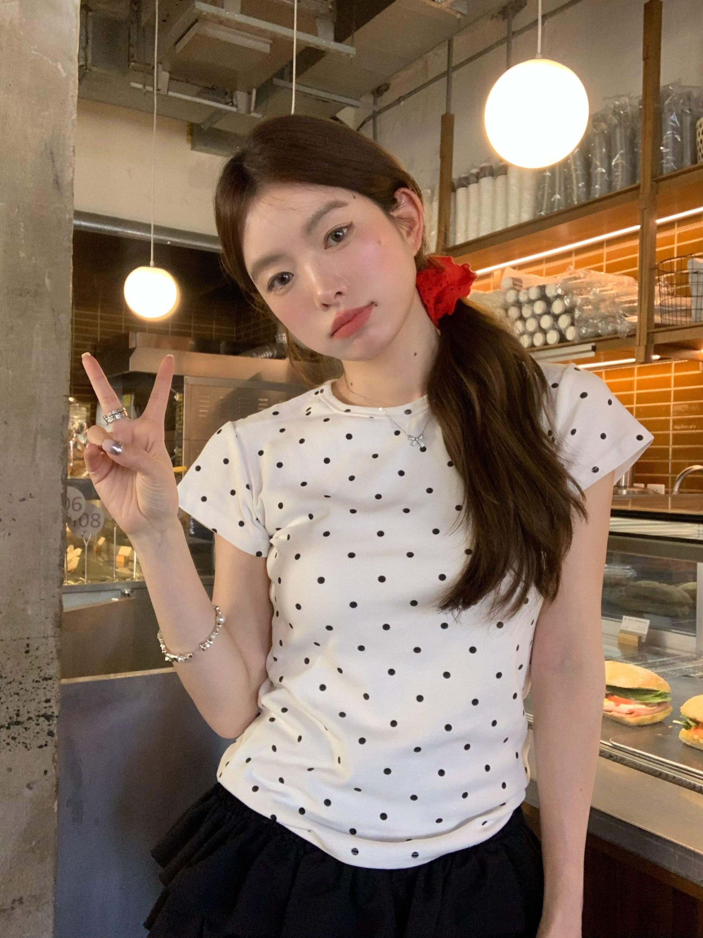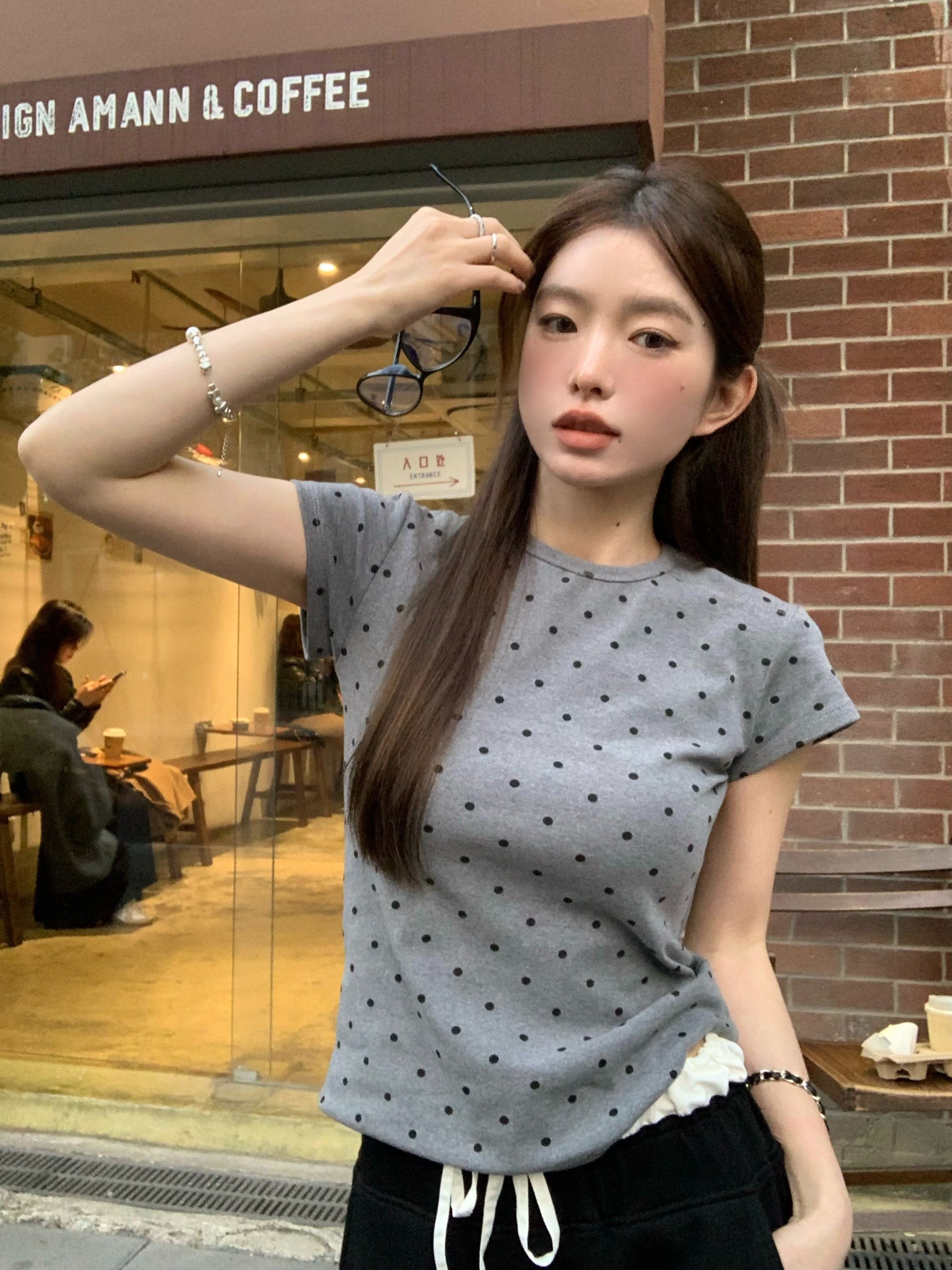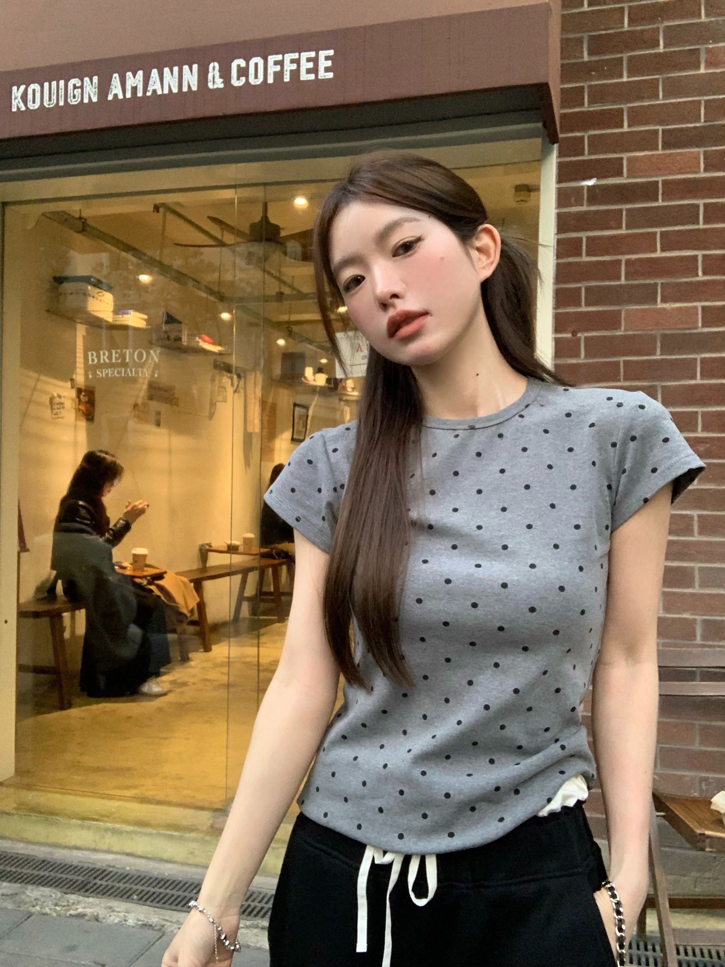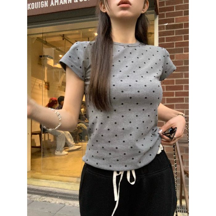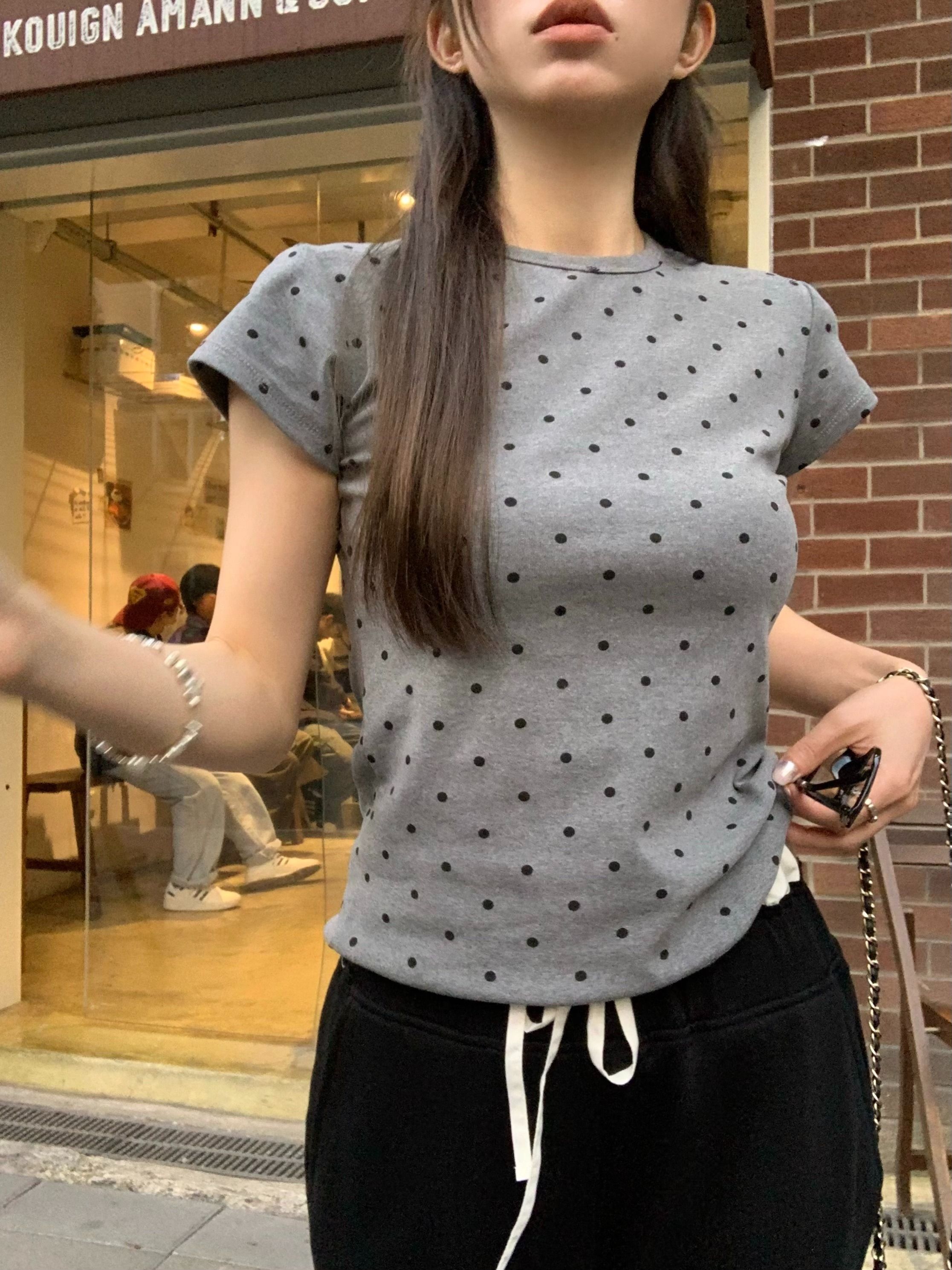 灰漫甜心~正肩波点短袖T恤女夏季基础百搭显瘦甜辣圆领上衣