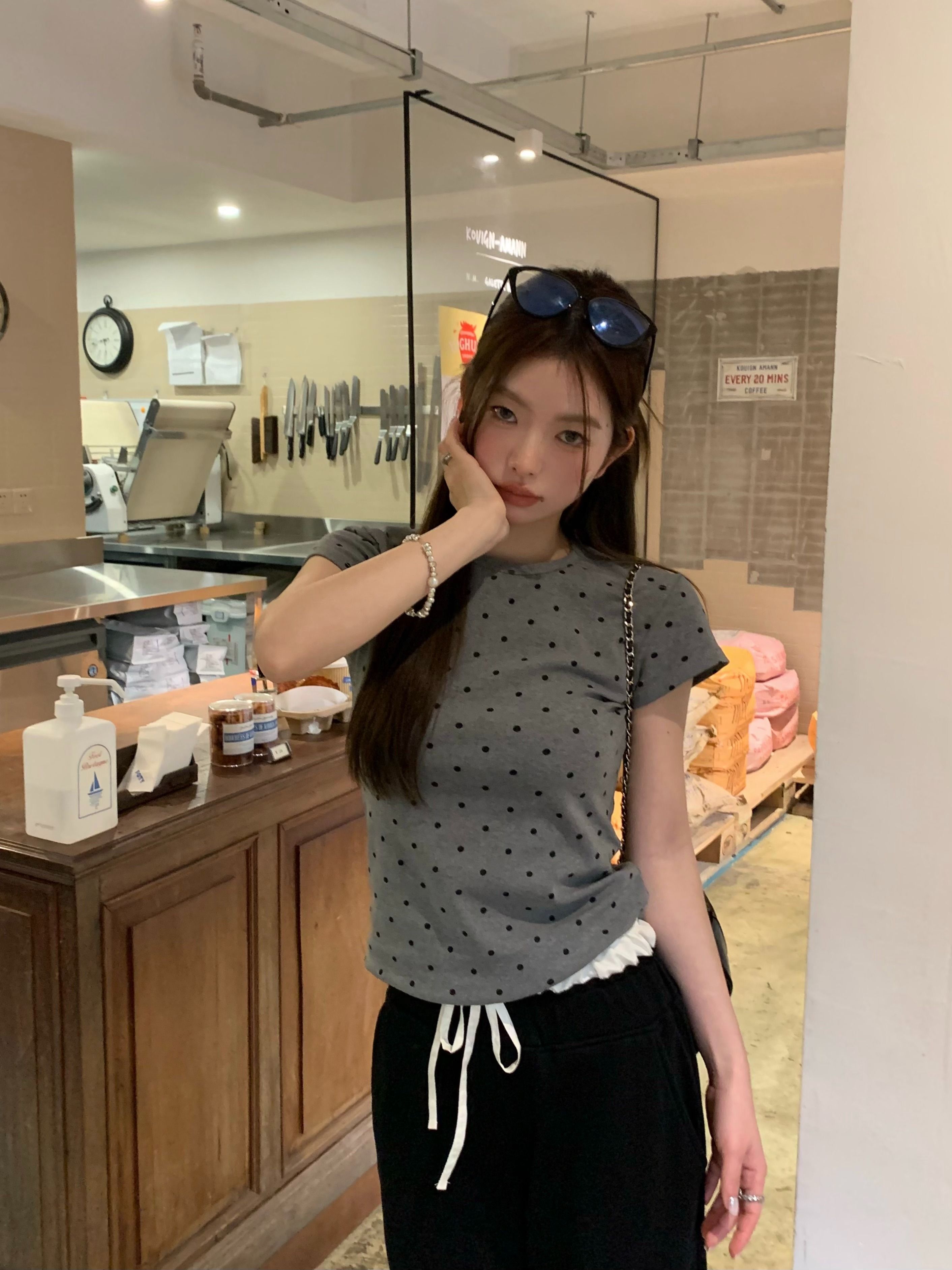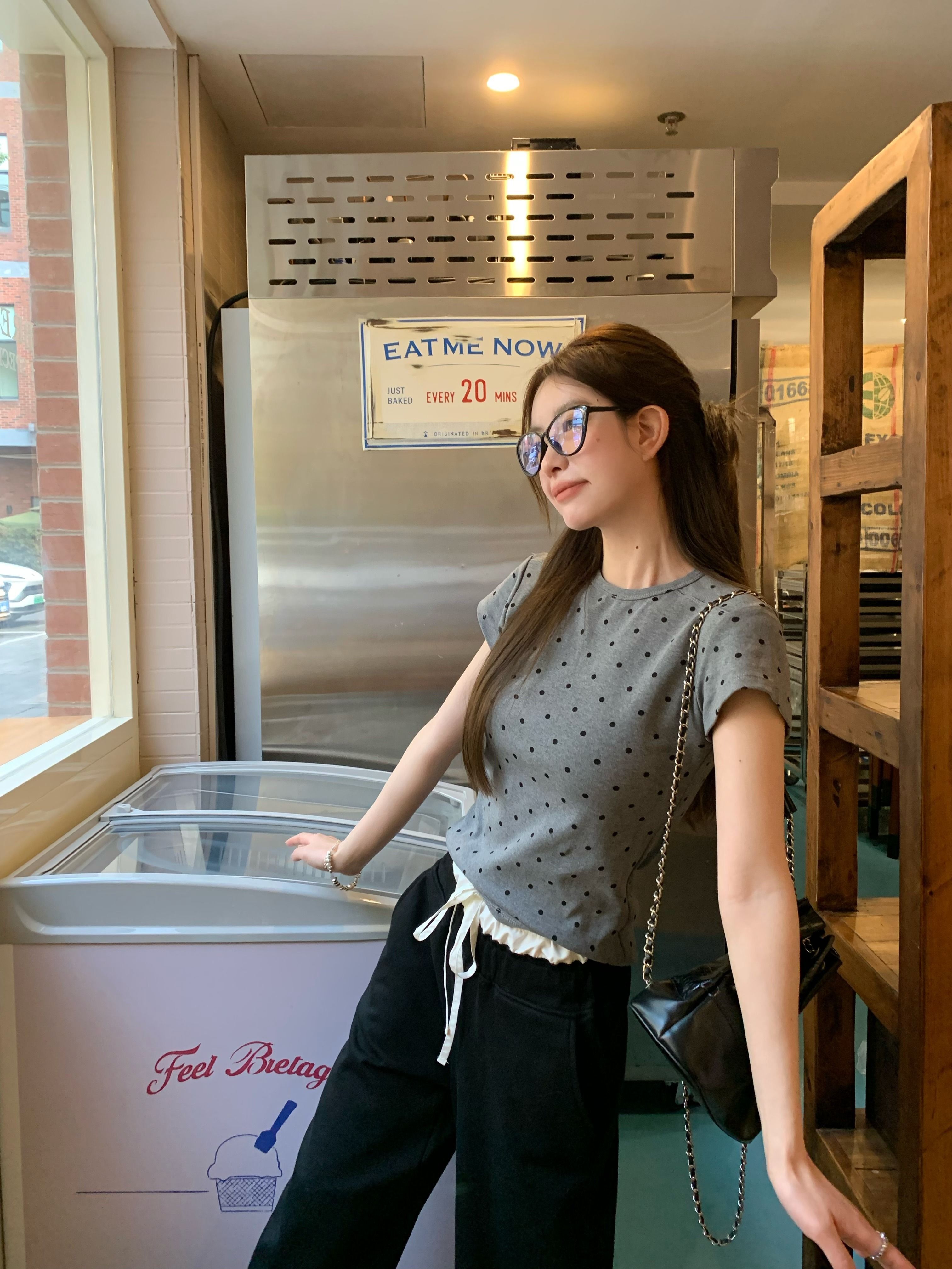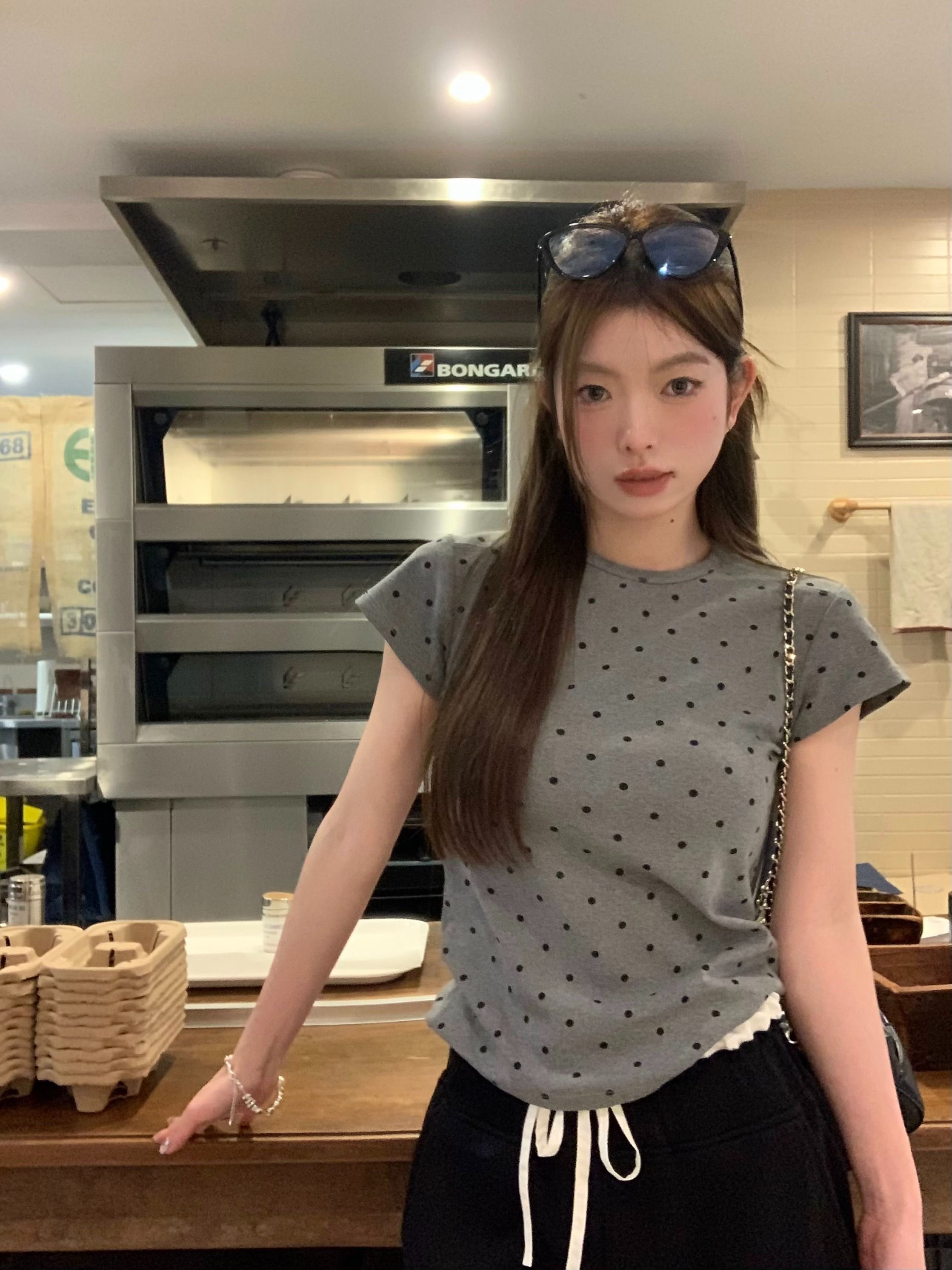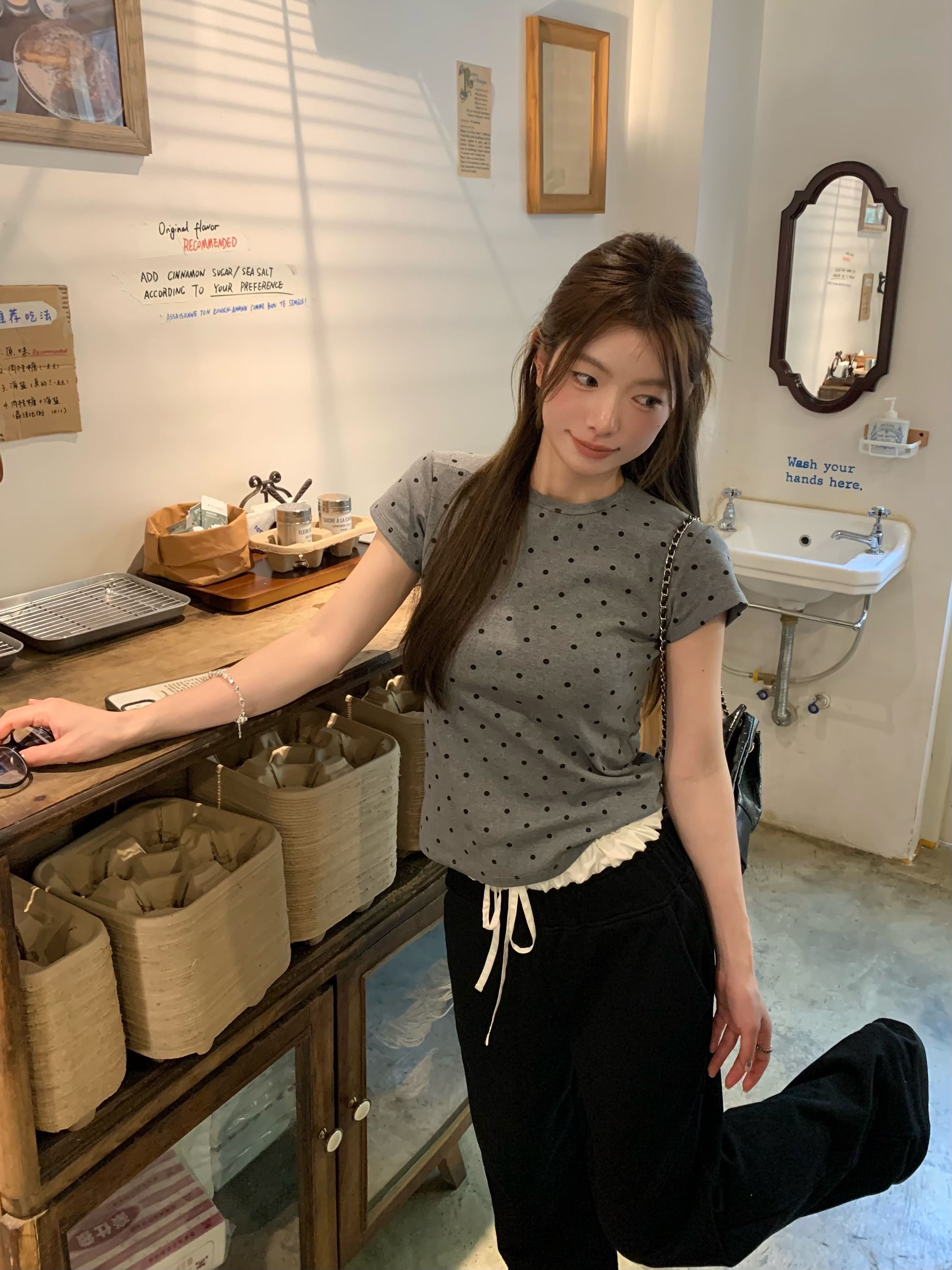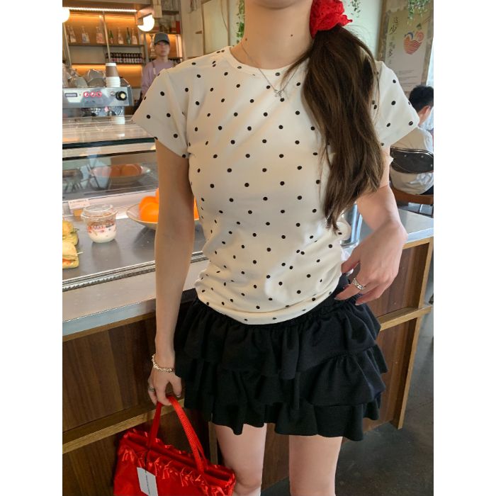 灰漫甜心~正肩波点短袖T恤女夏季基础百搭显瘦甜辣圆领上衣