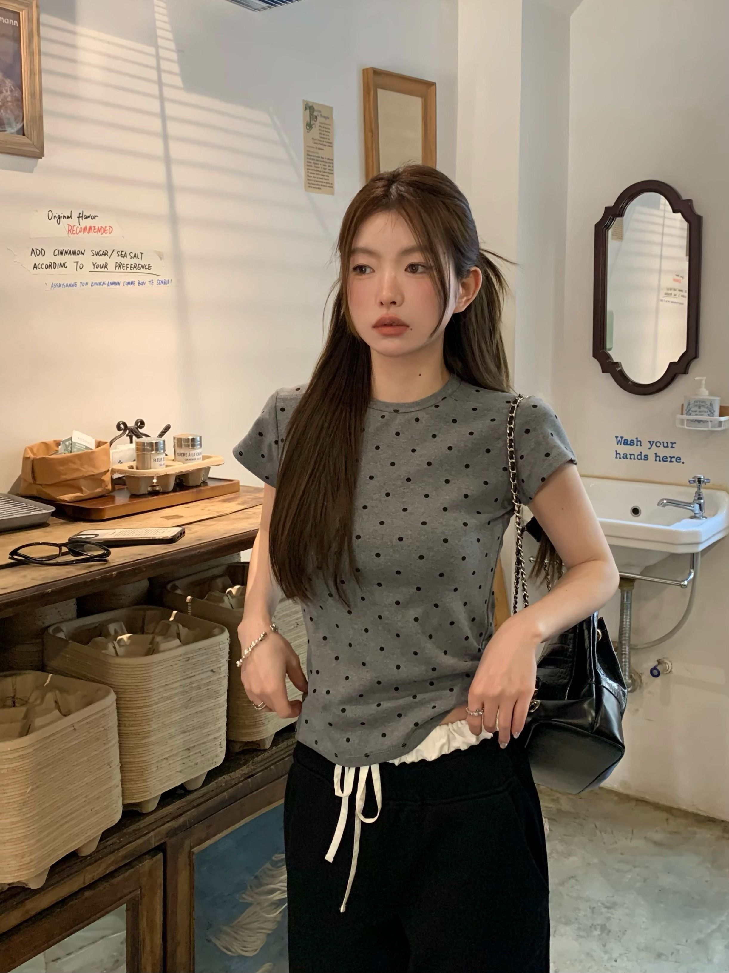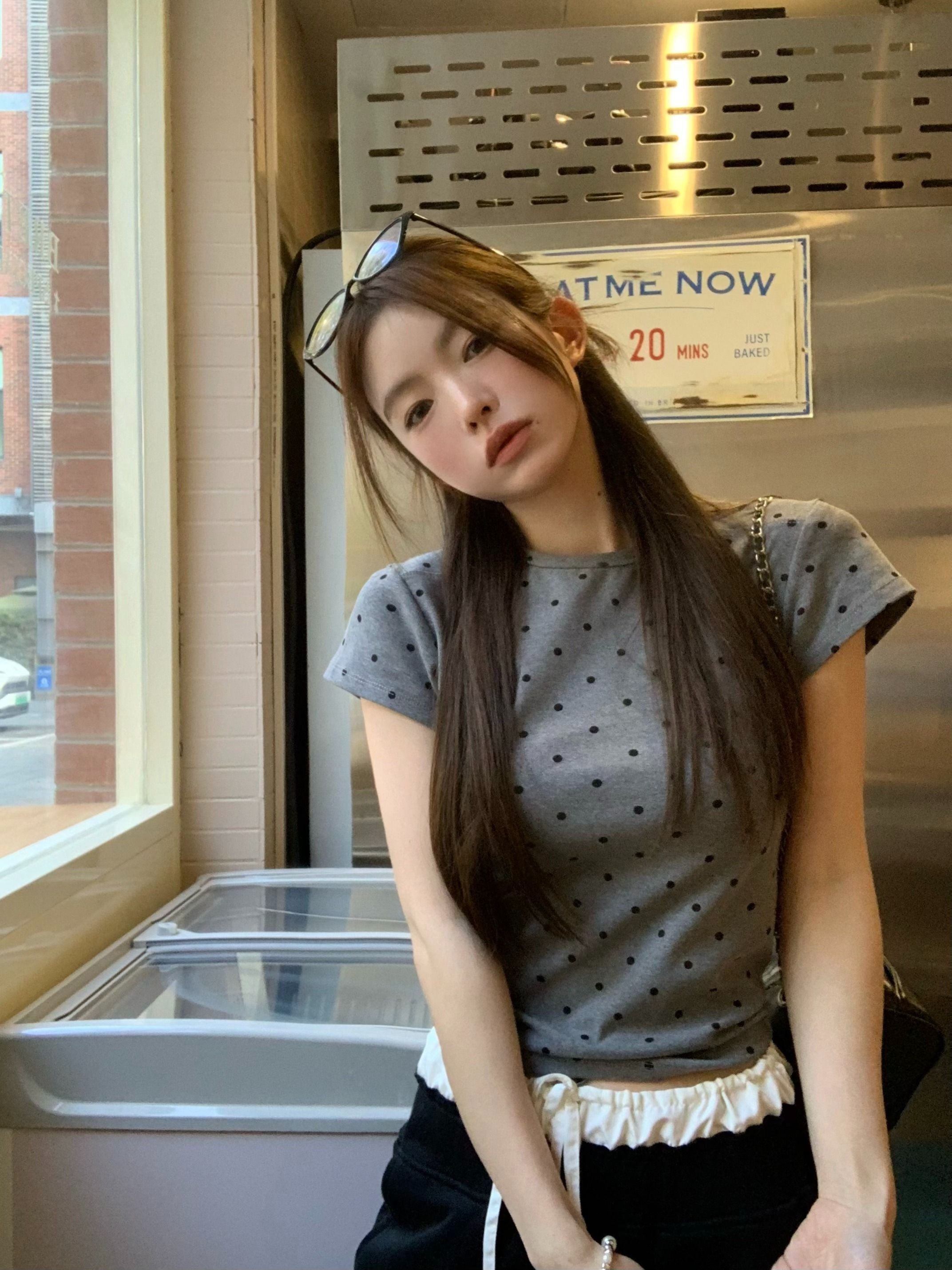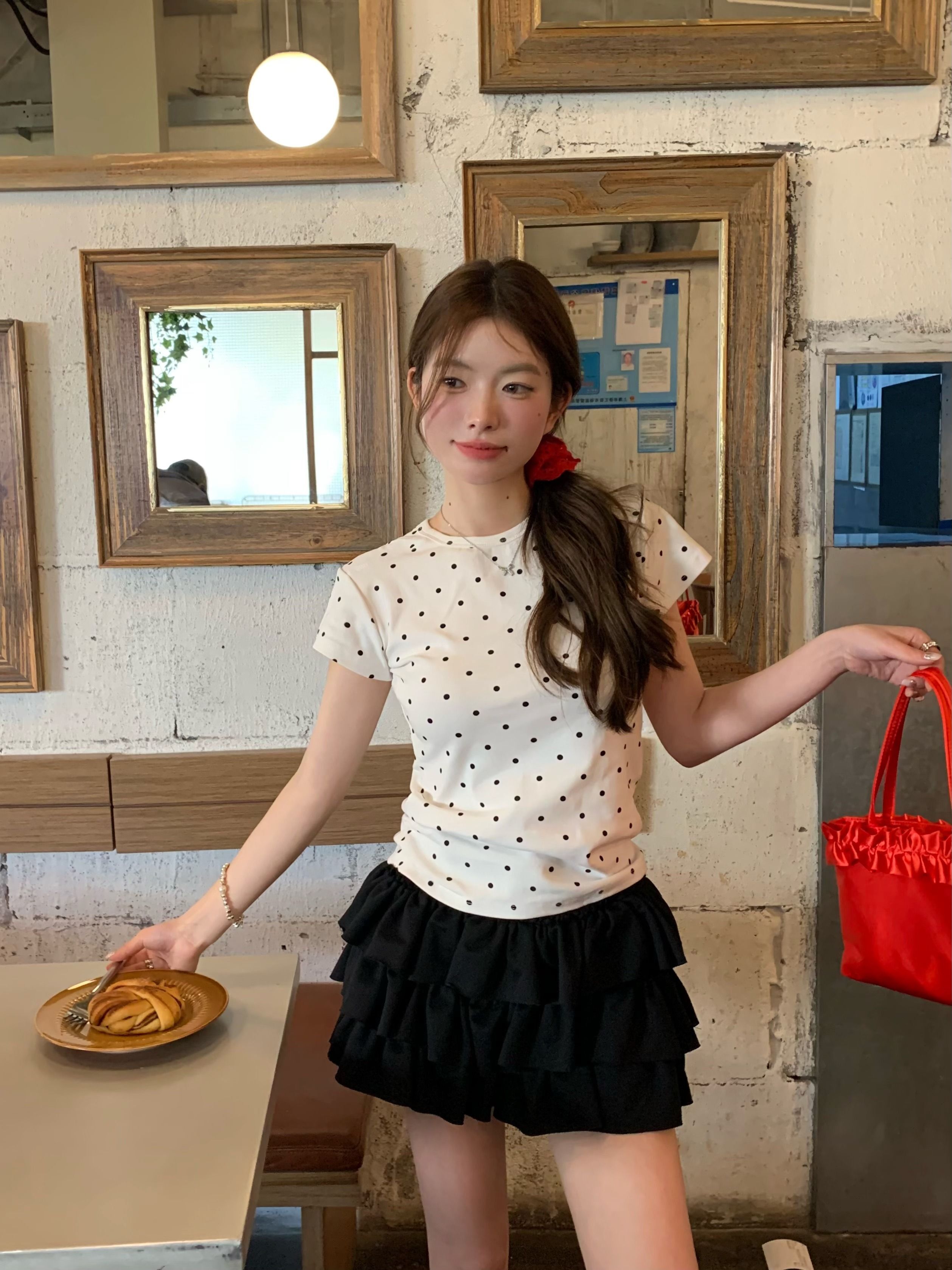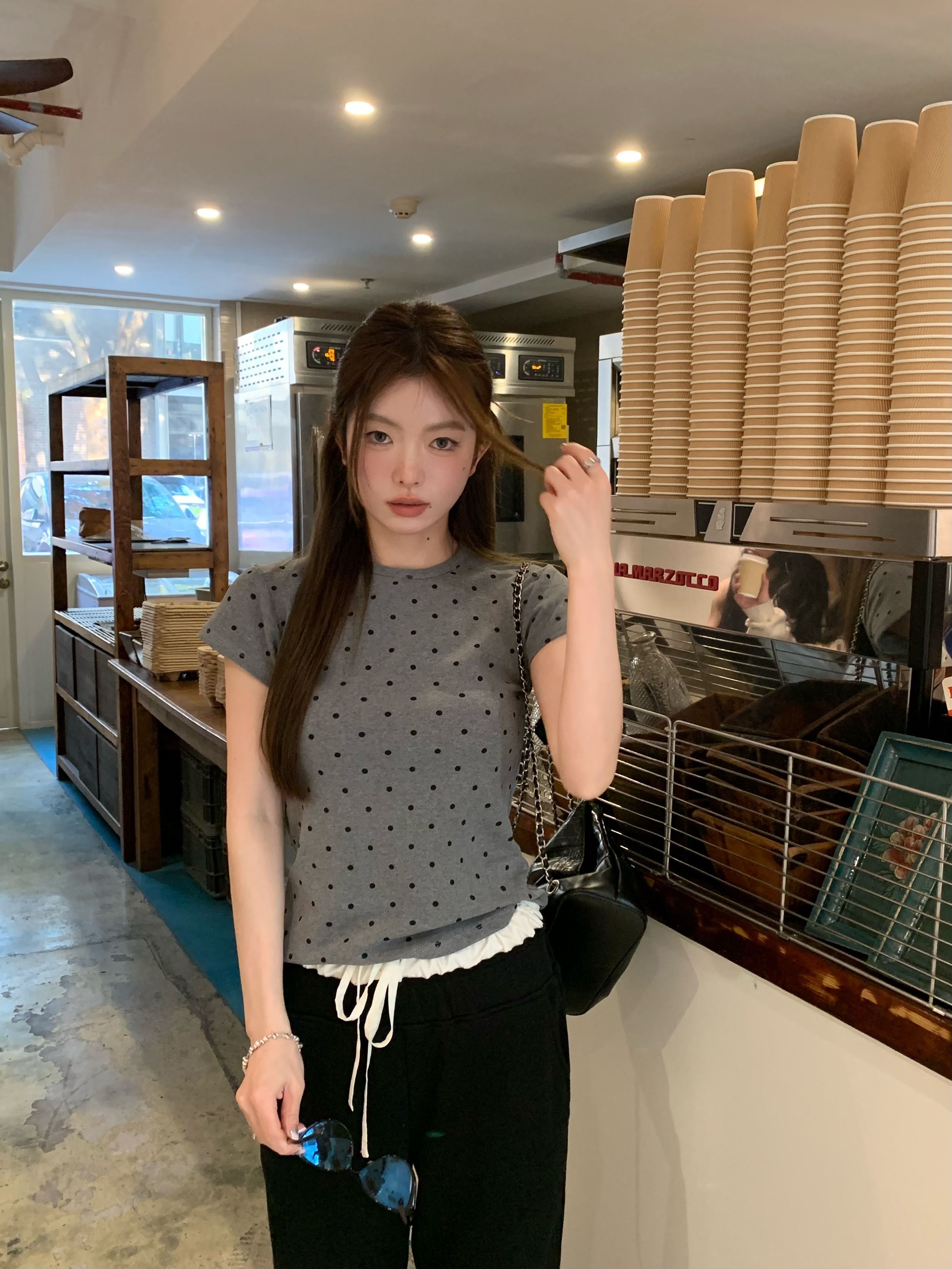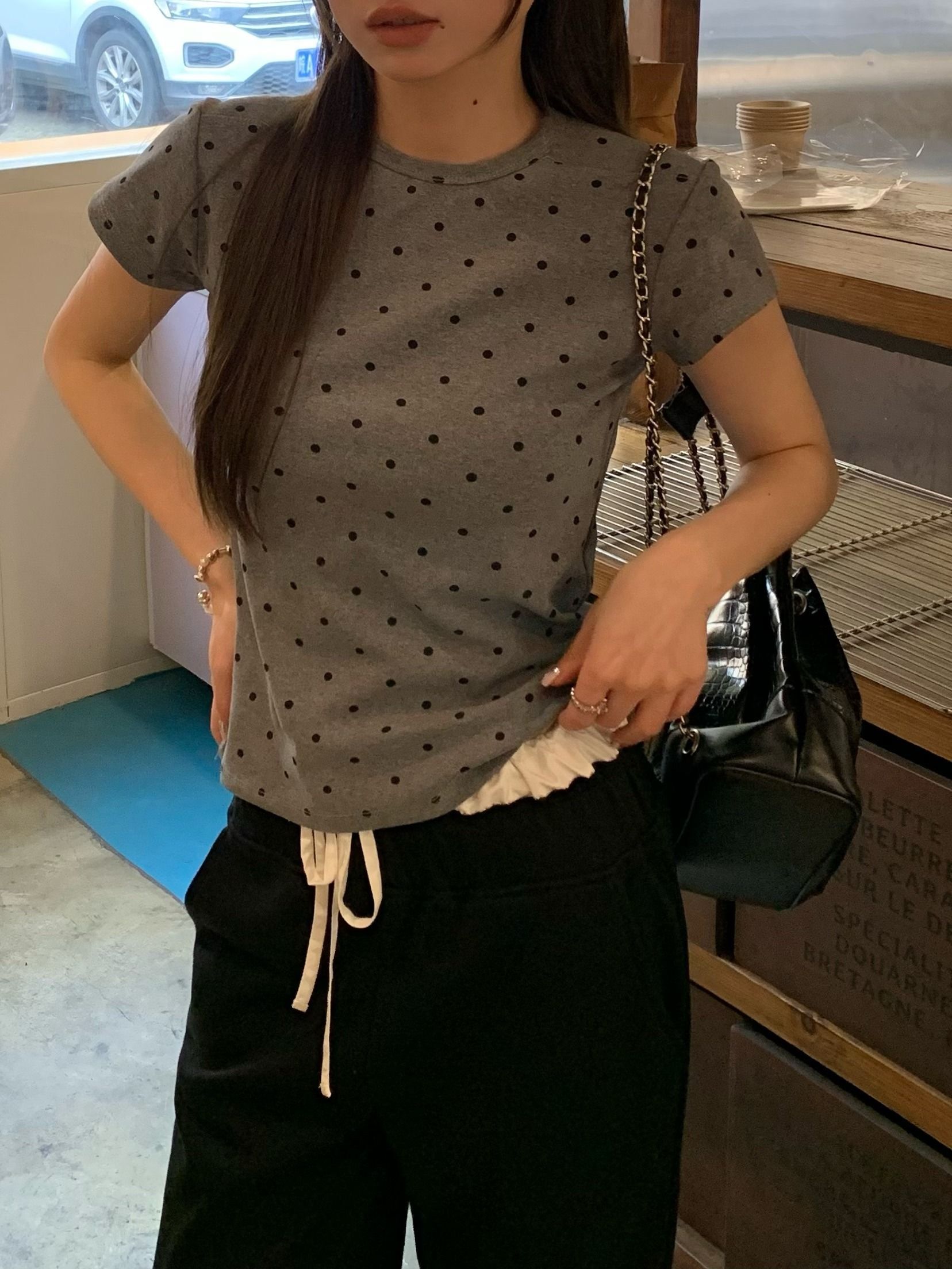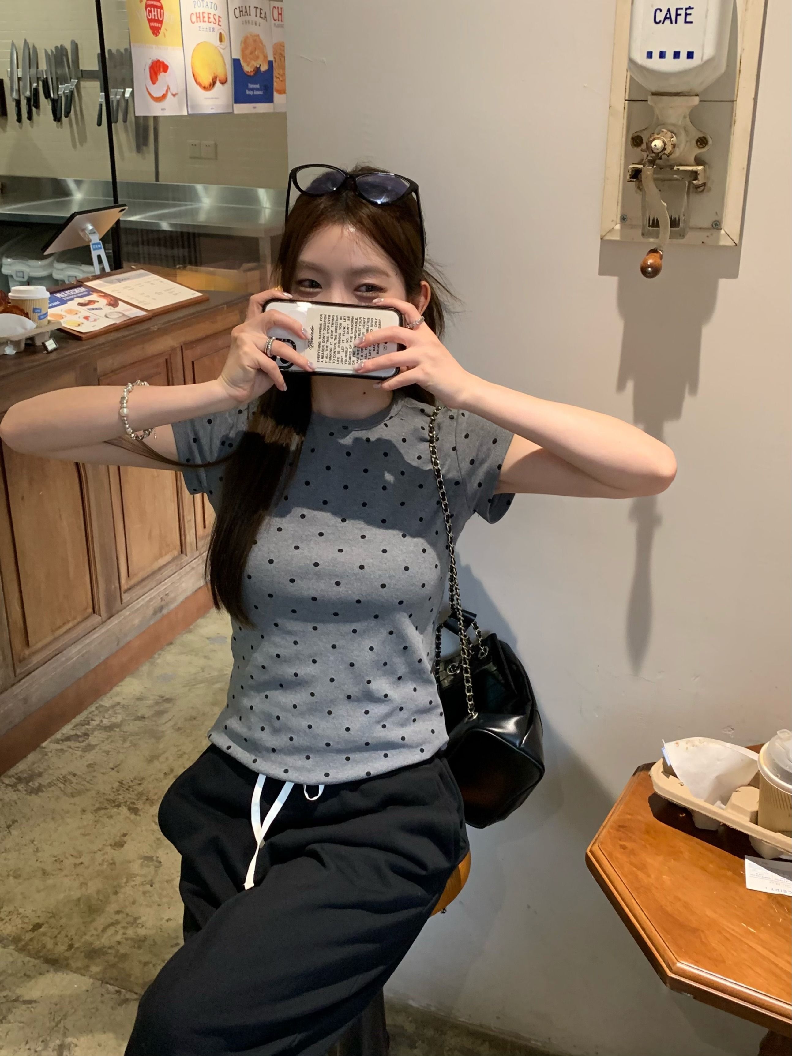 灰漫甜心~正肩波点短袖T恤女夏季基础百搭显瘦甜辣圆领上衣