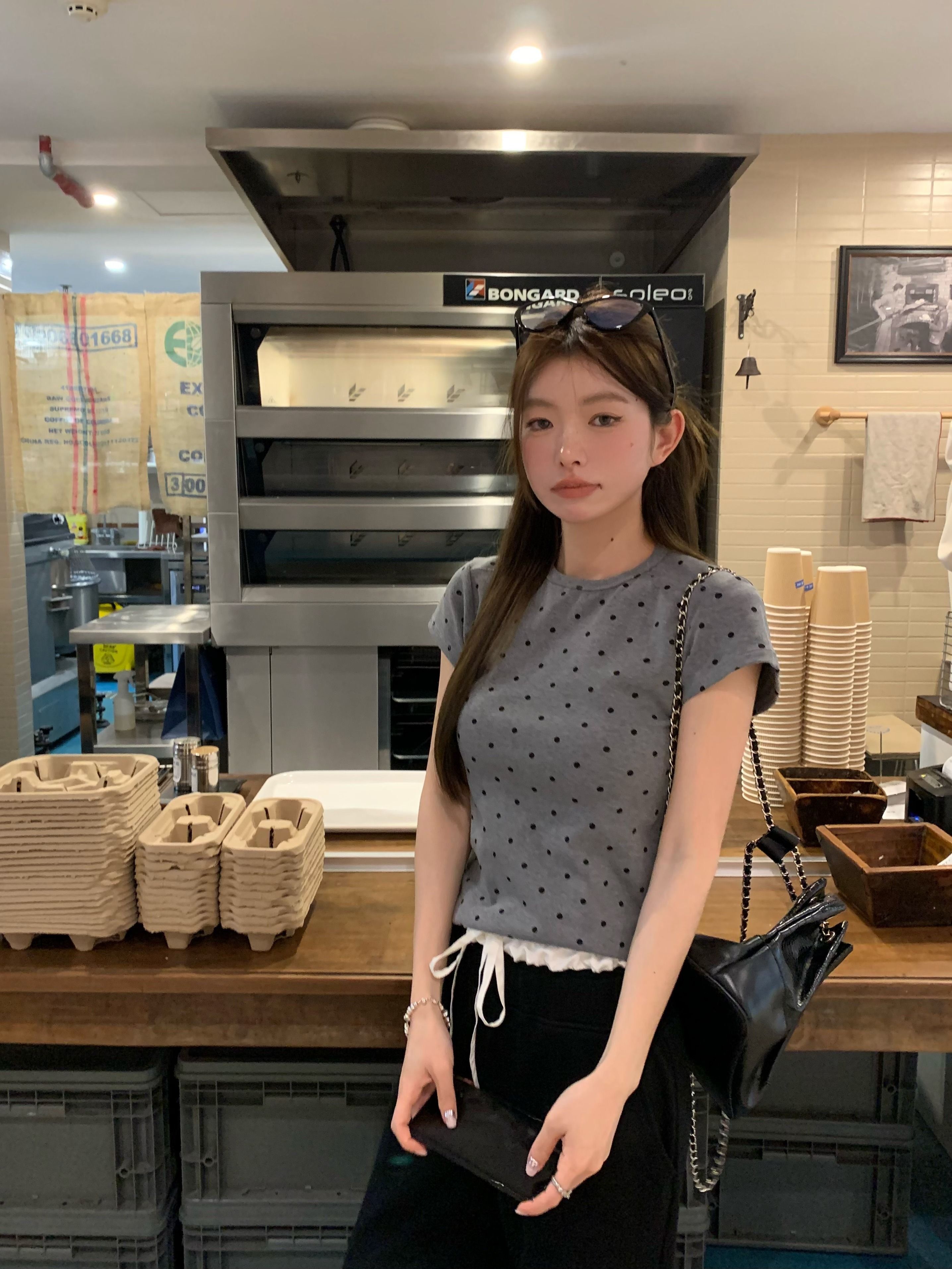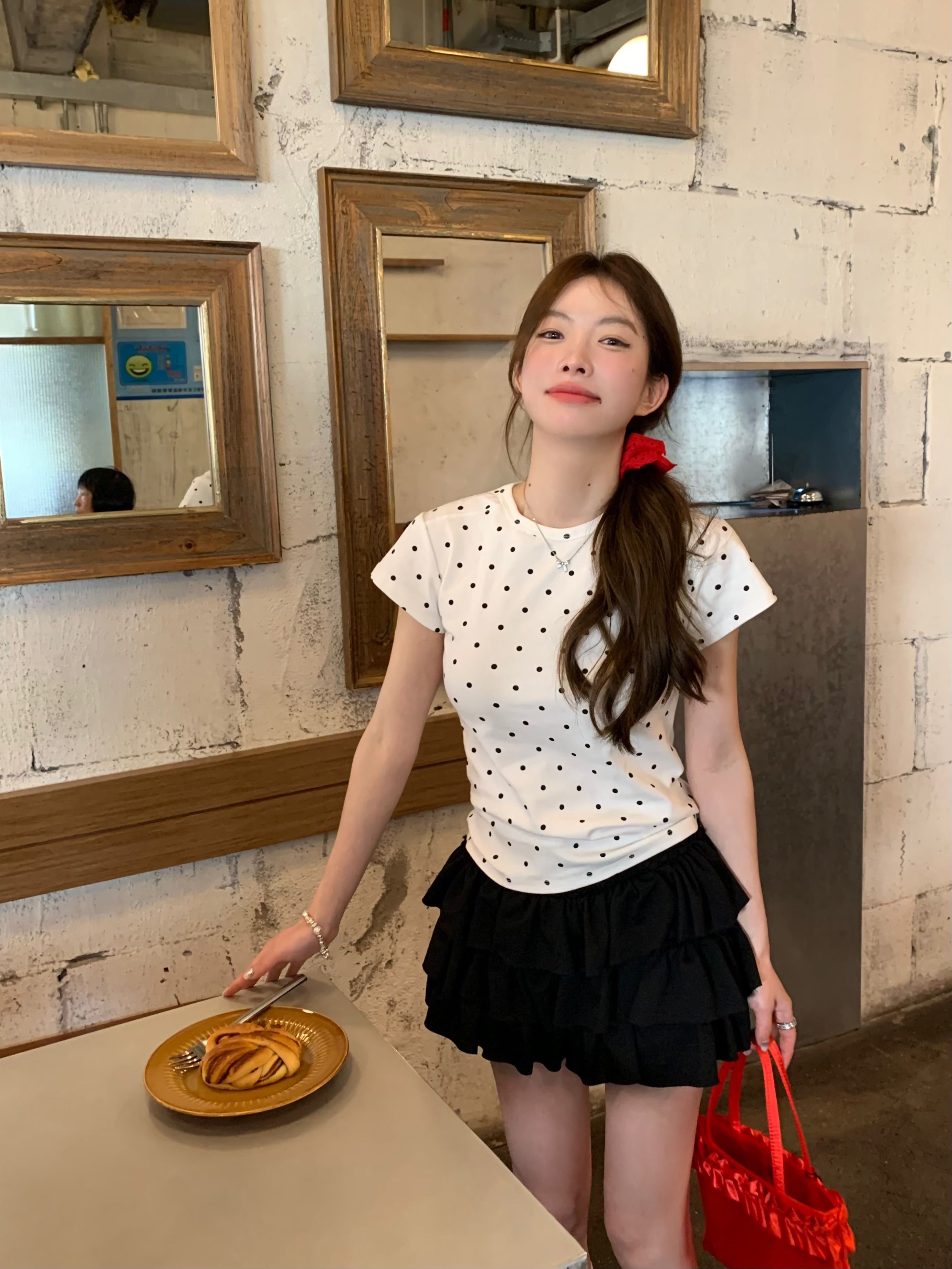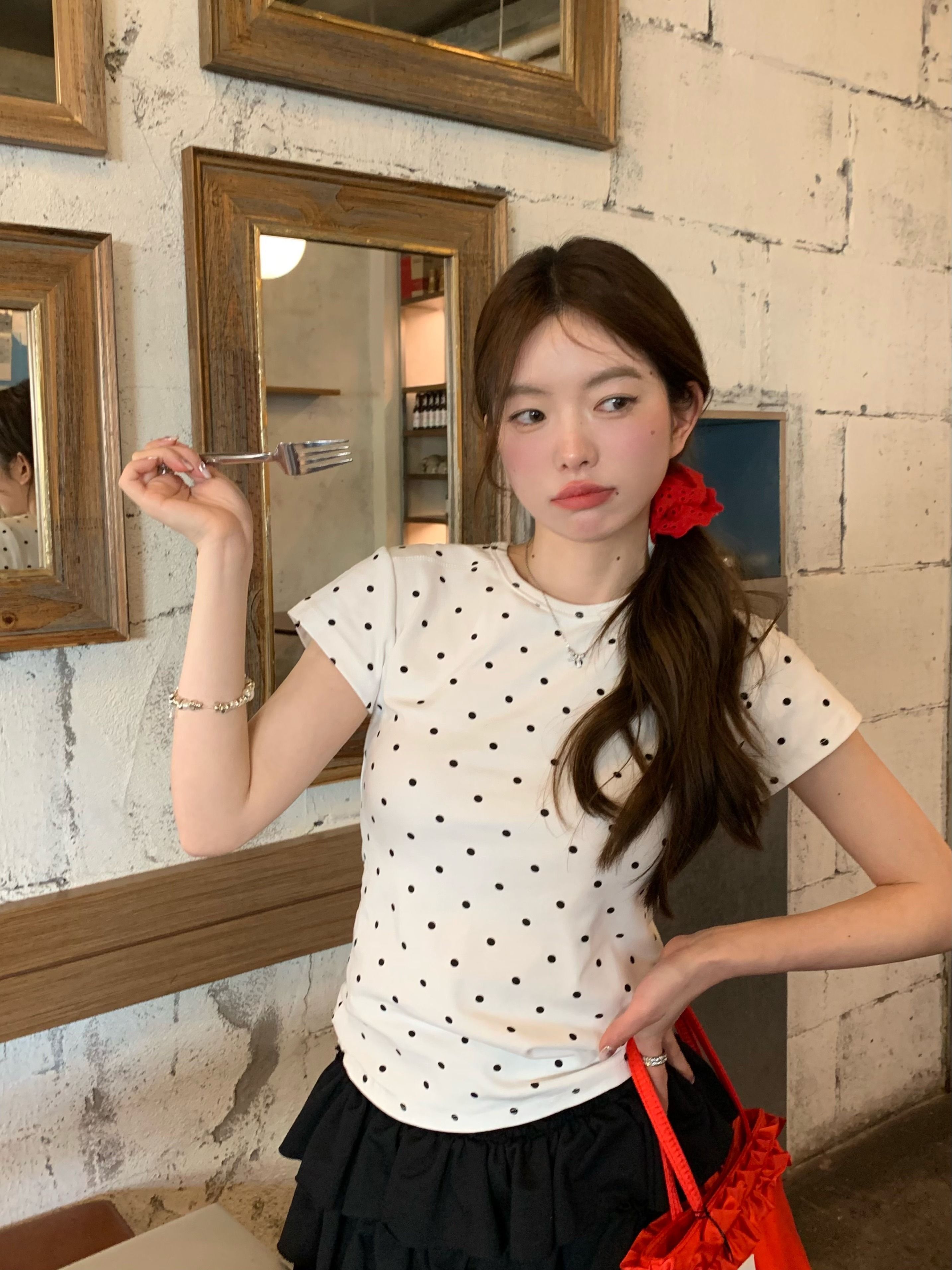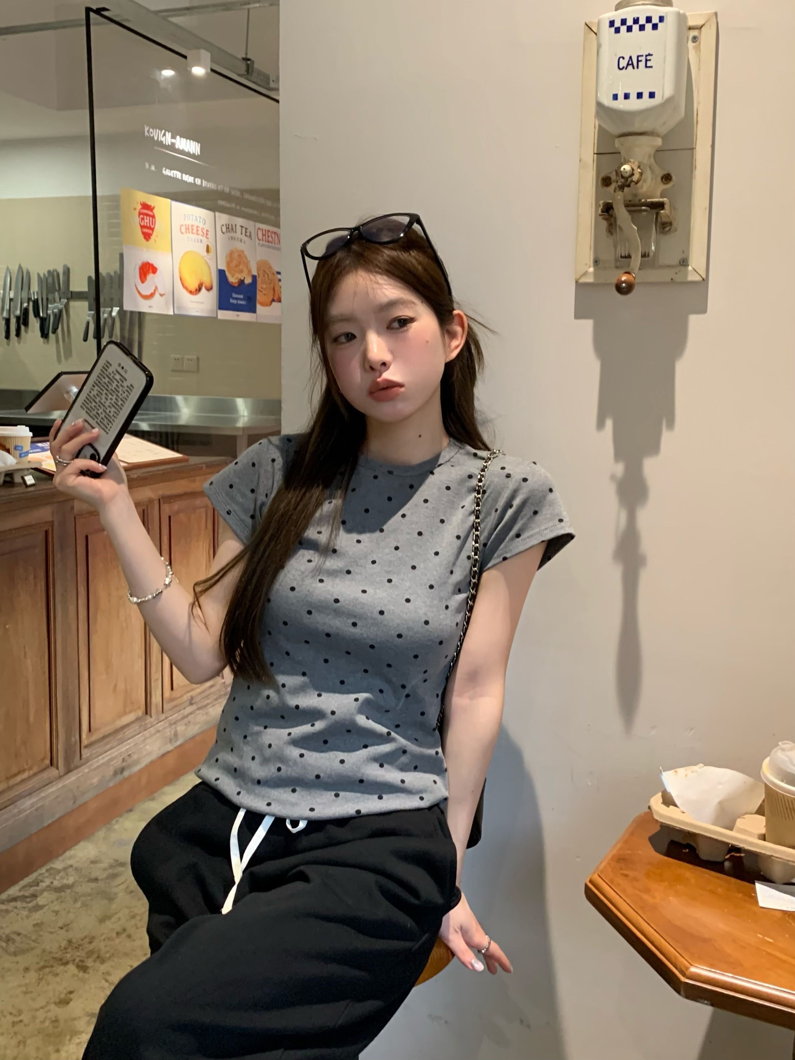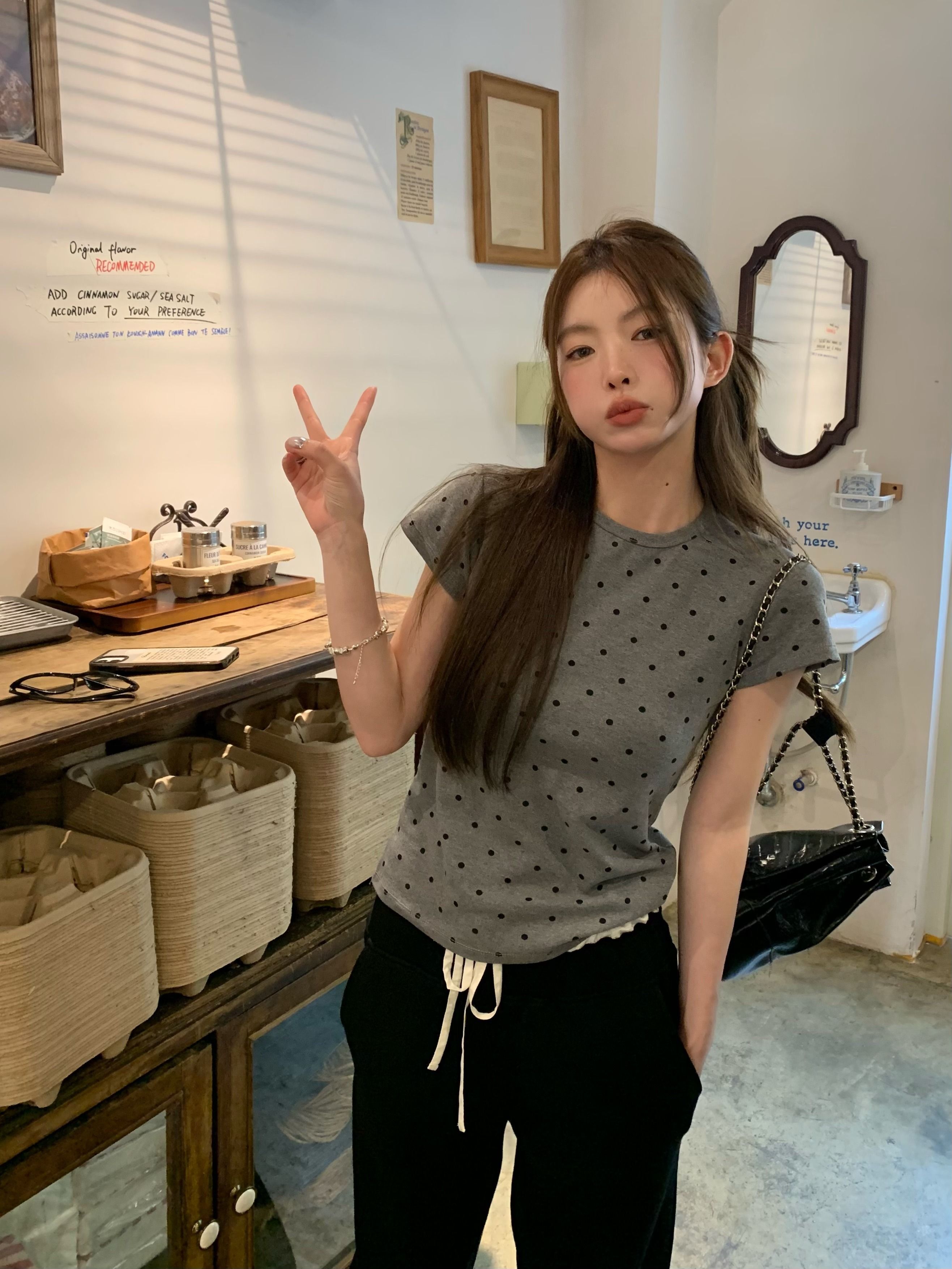 灰漫甜心~正肩波点短袖T恤女夏季基础百搭显瘦甜辣圆领上衣