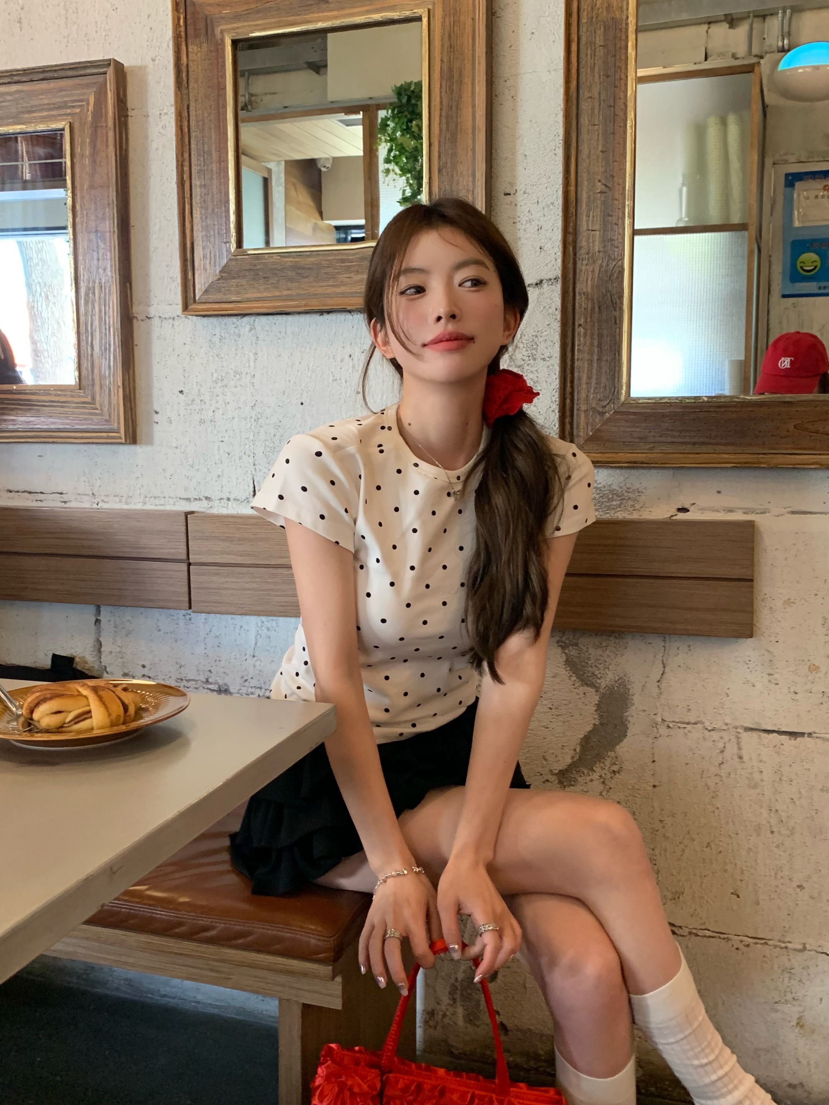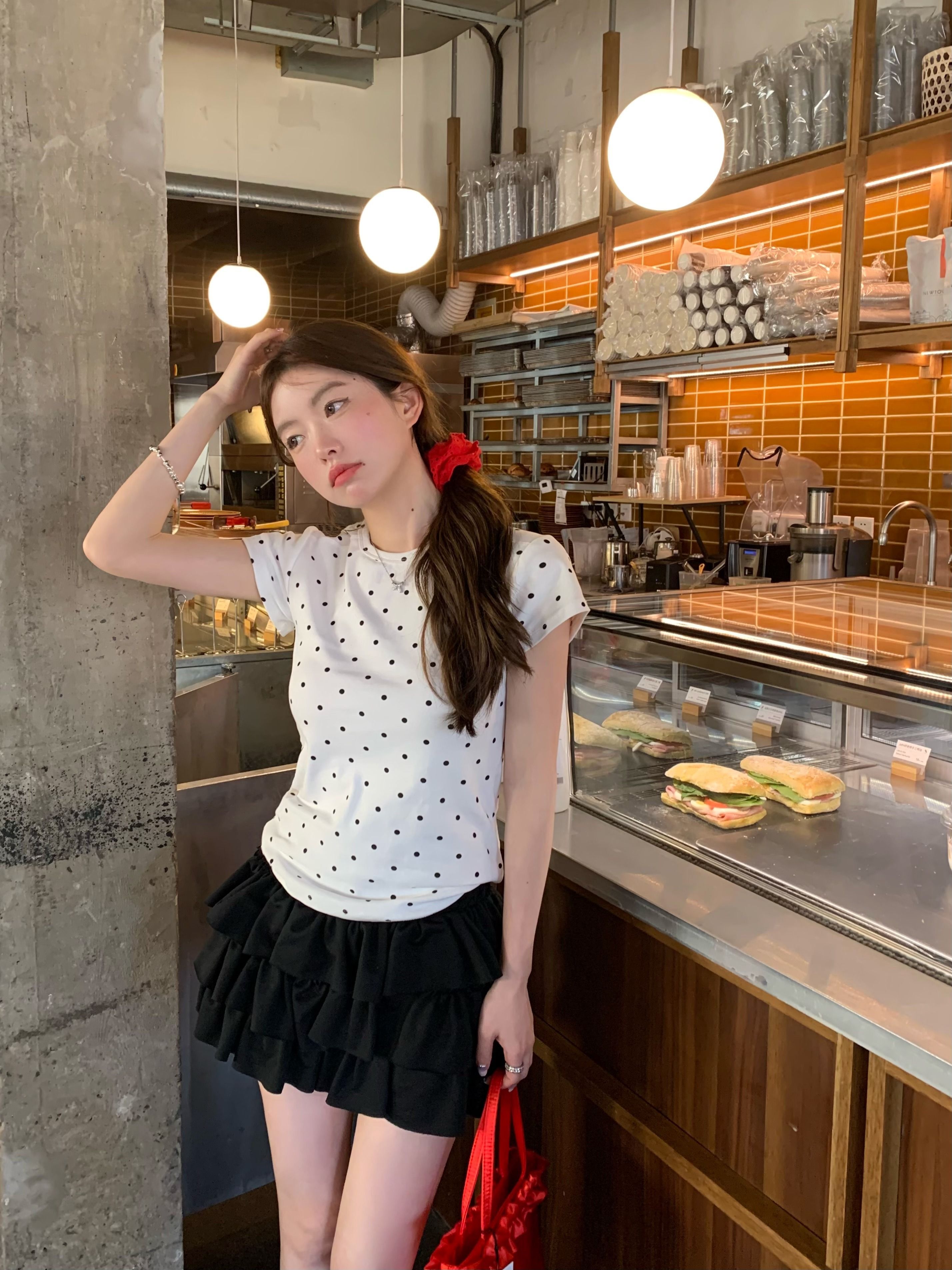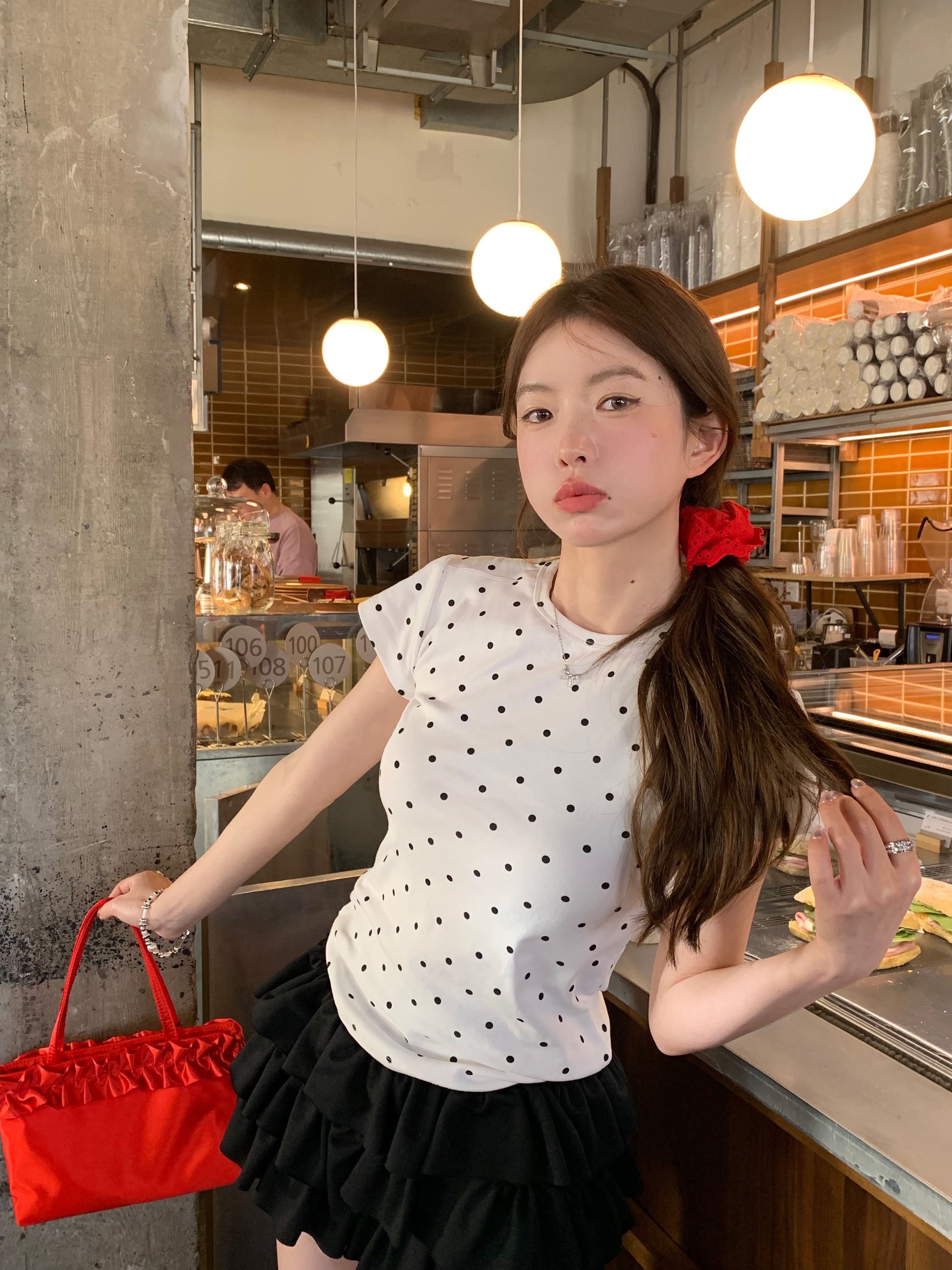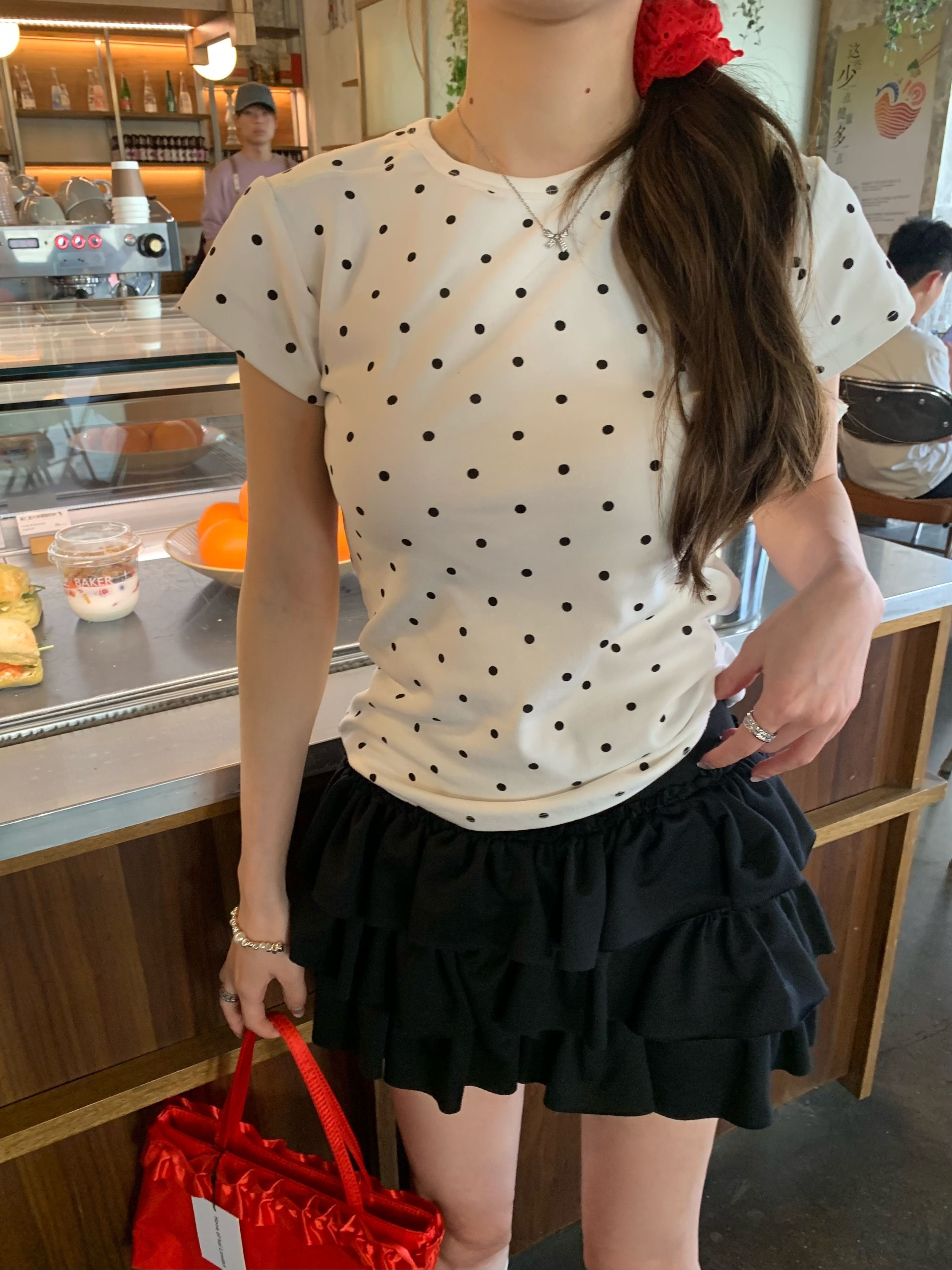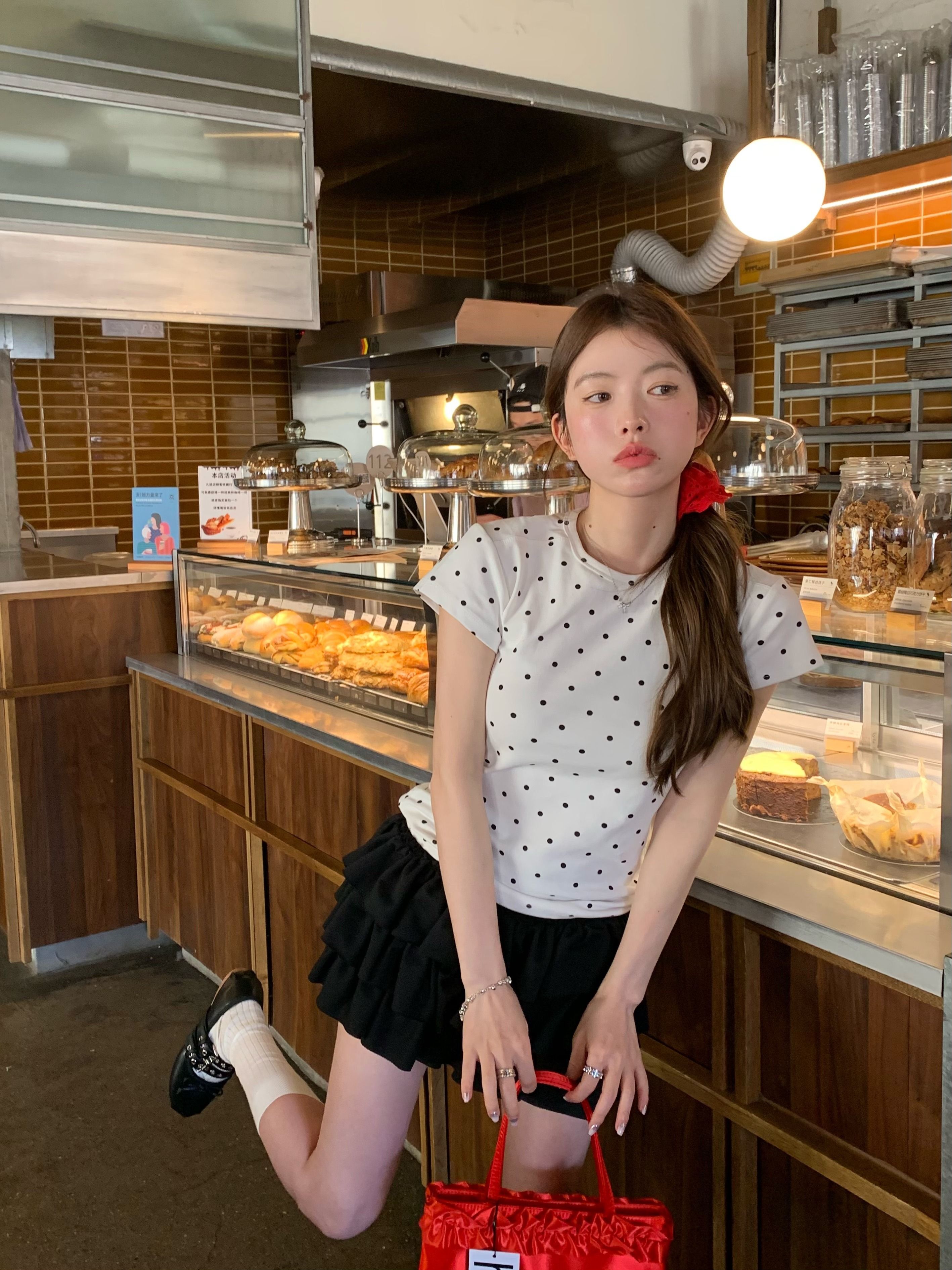 灰漫甜心~正肩波点短袖T恤女夏季基础百搭显瘦甜辣圆领上衣