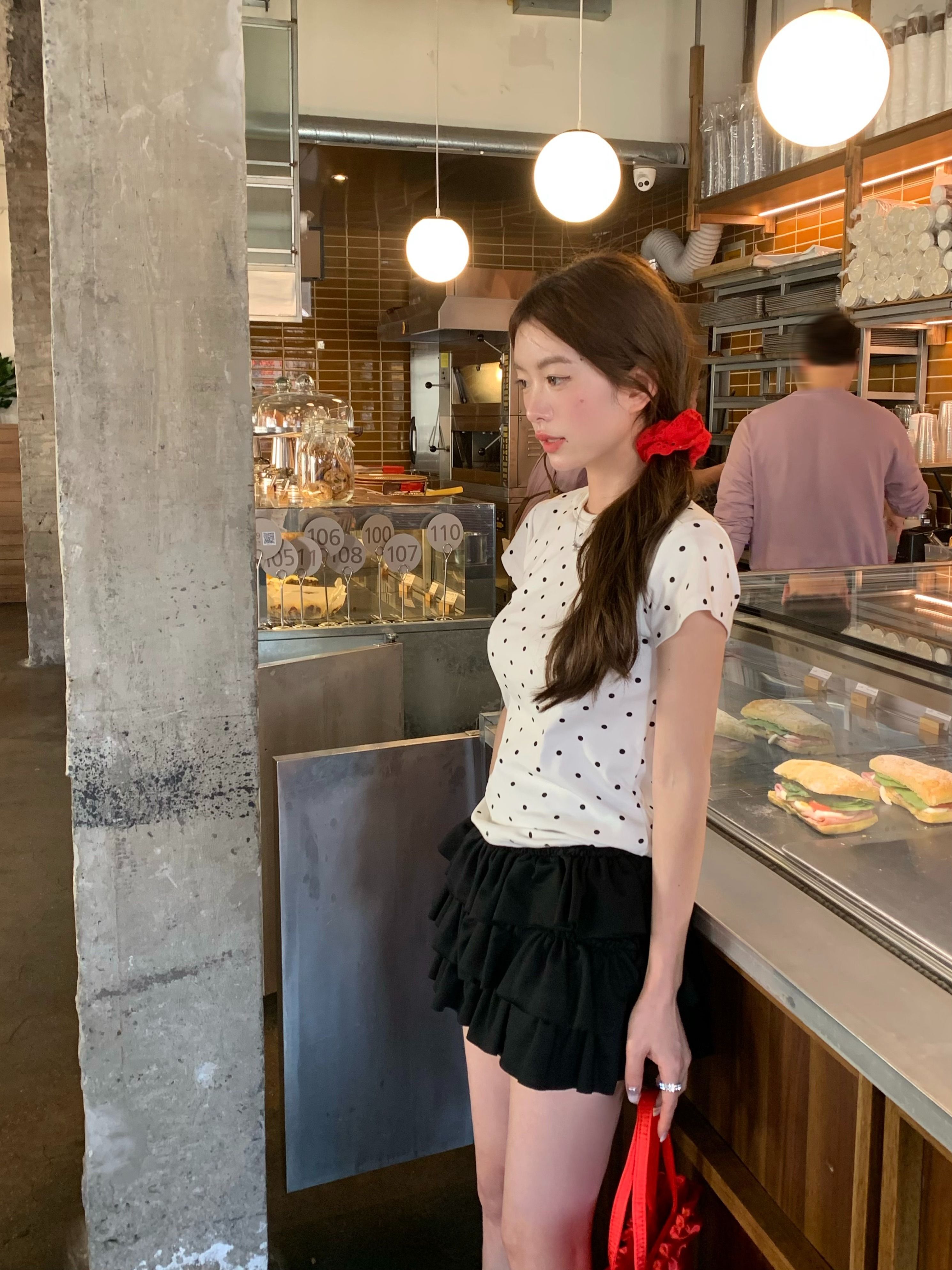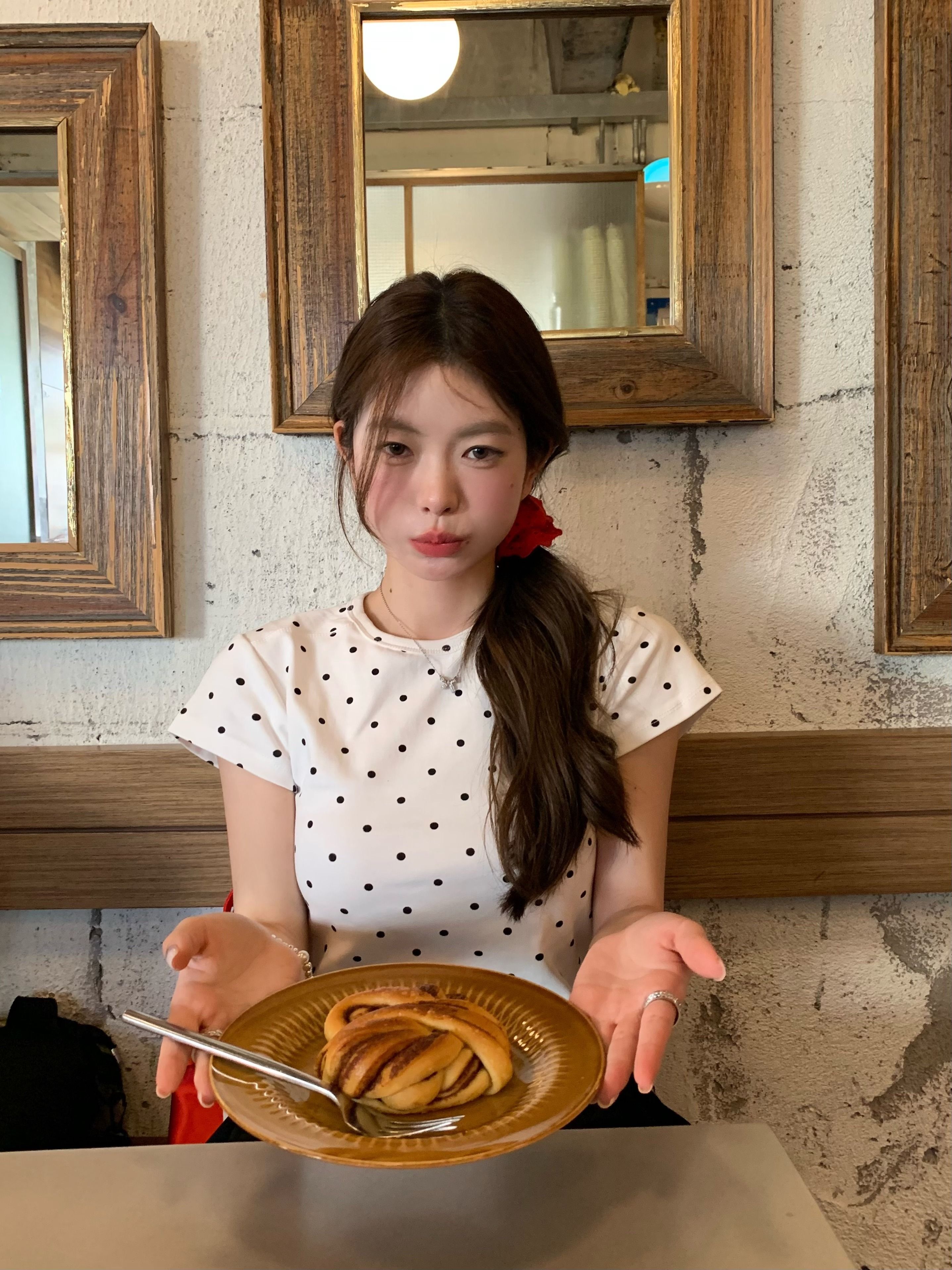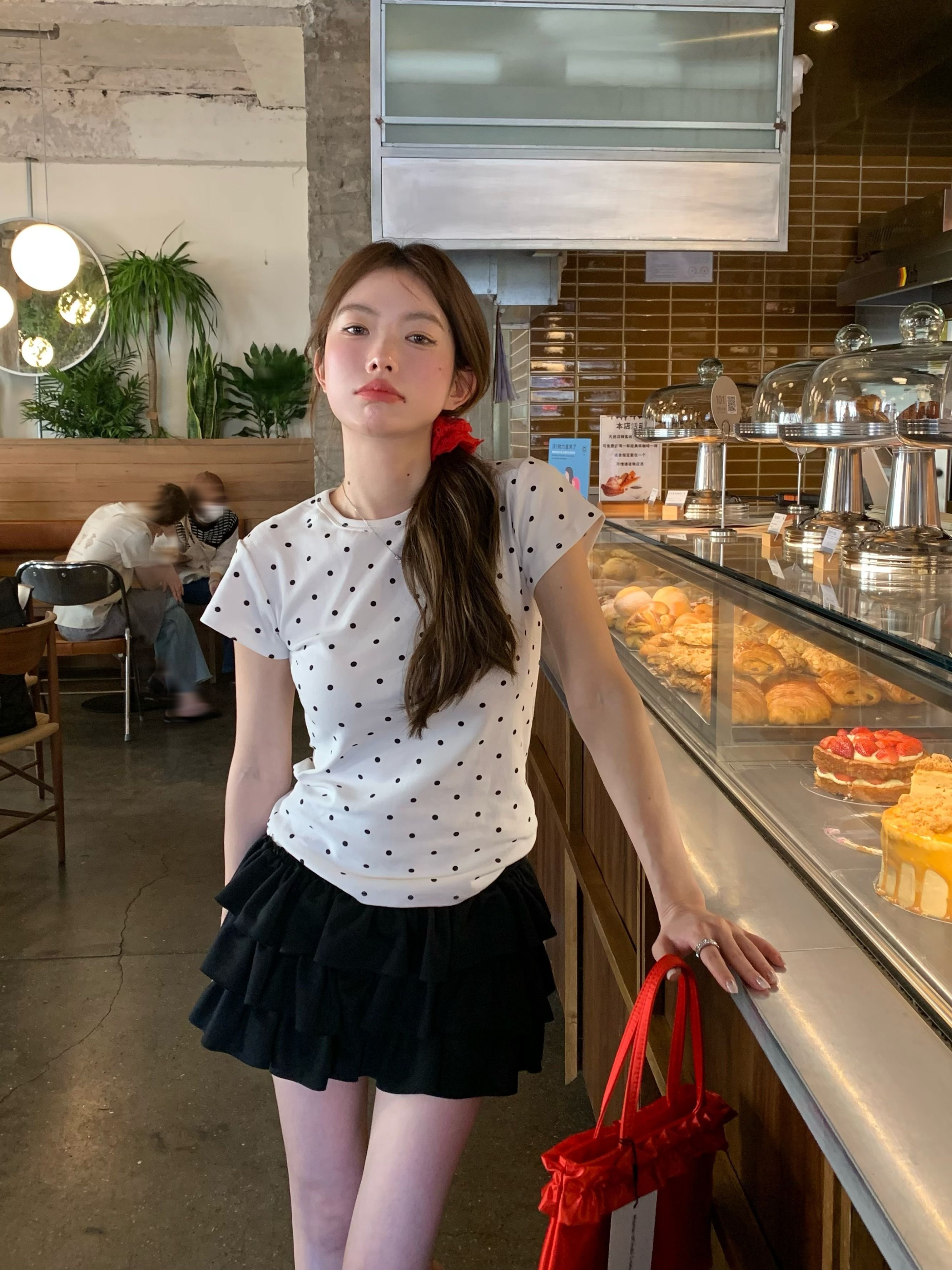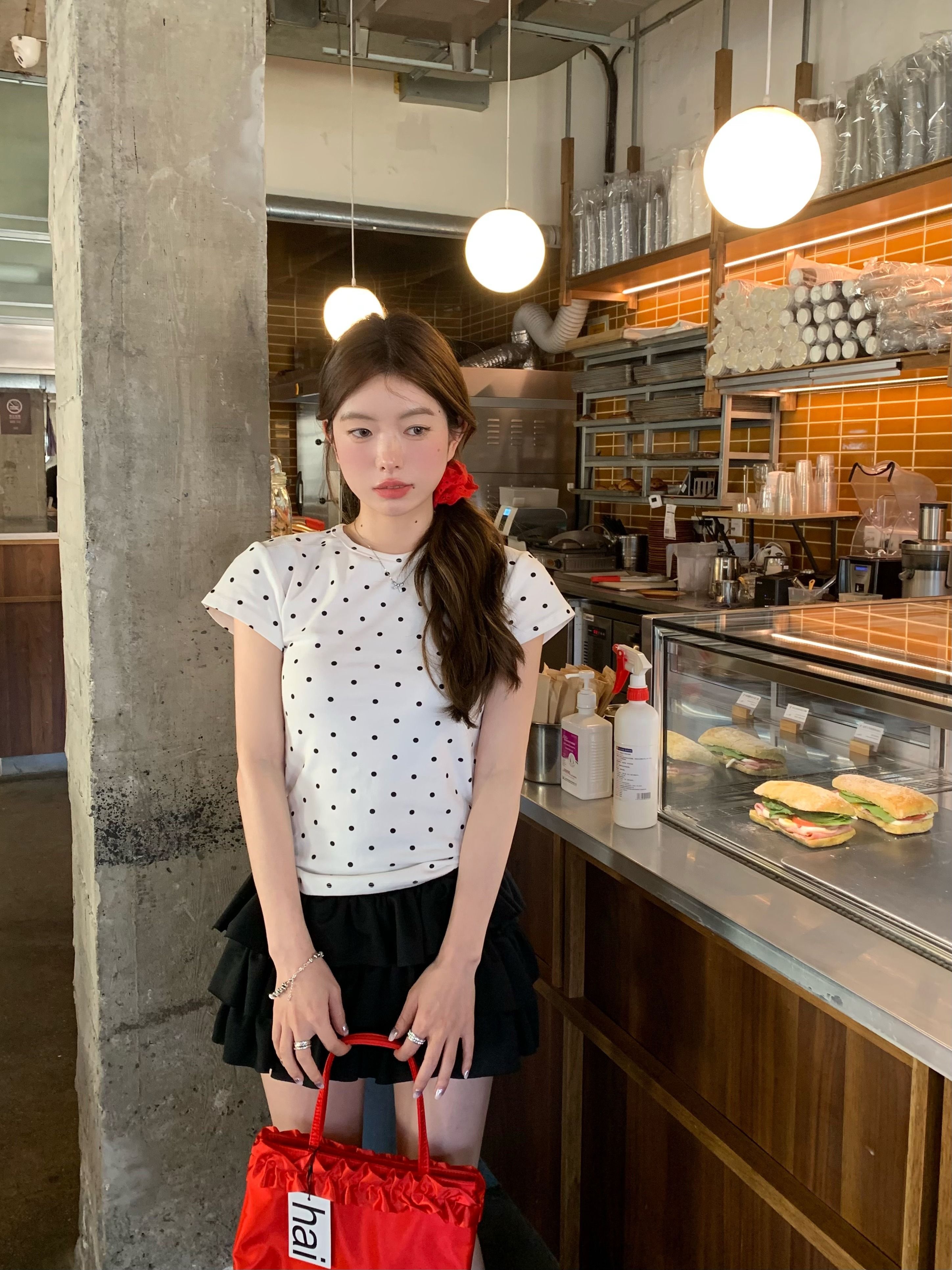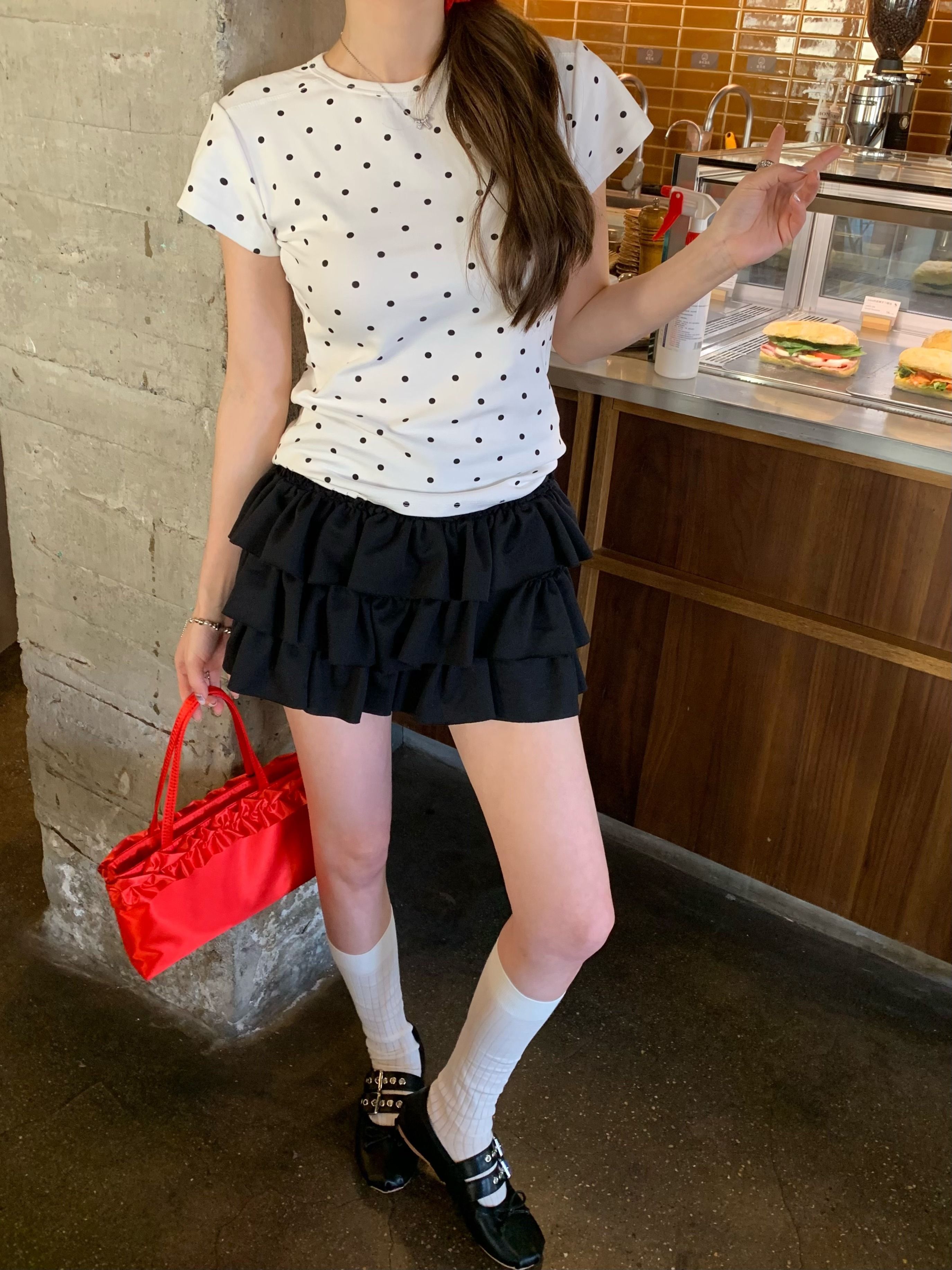 灰漫甜心~正肩波点短袖T恤女夏季基础百搭显瘦甜辣圆领上衣