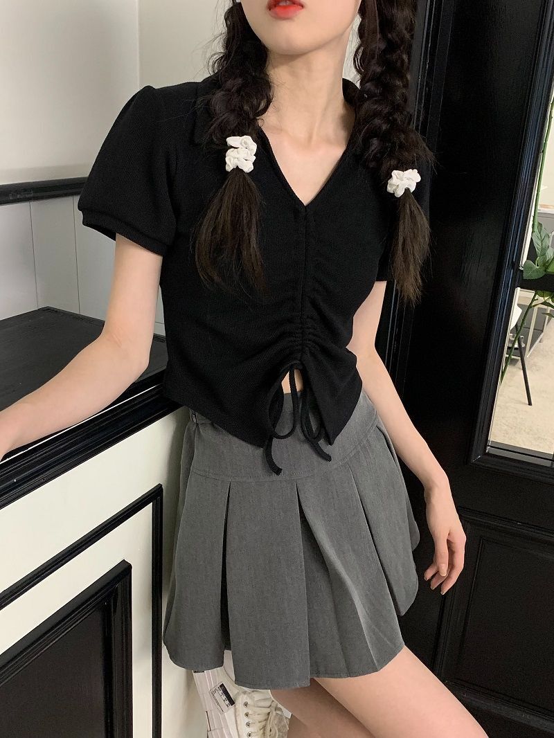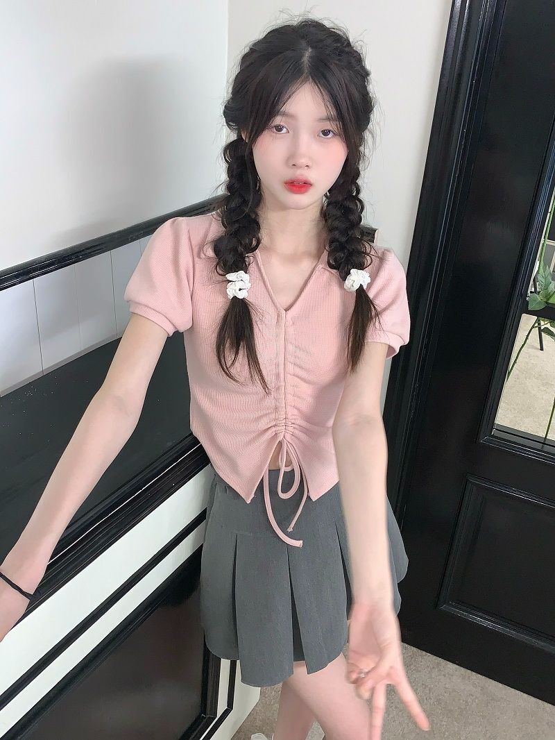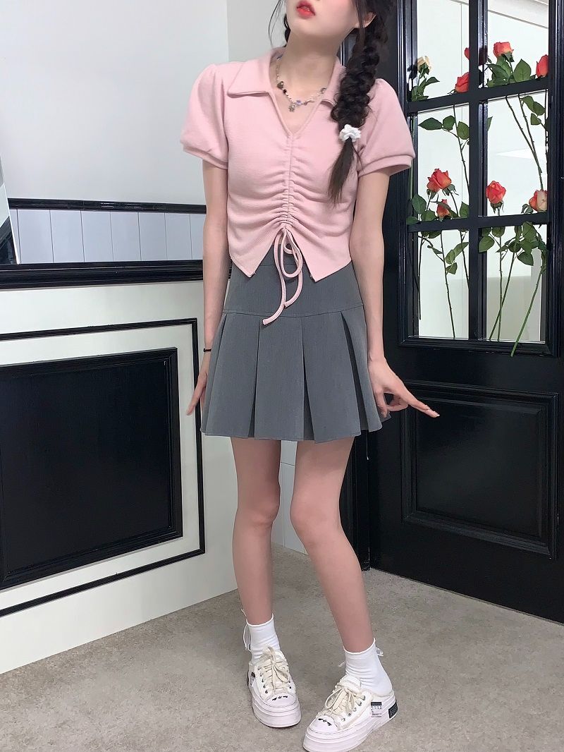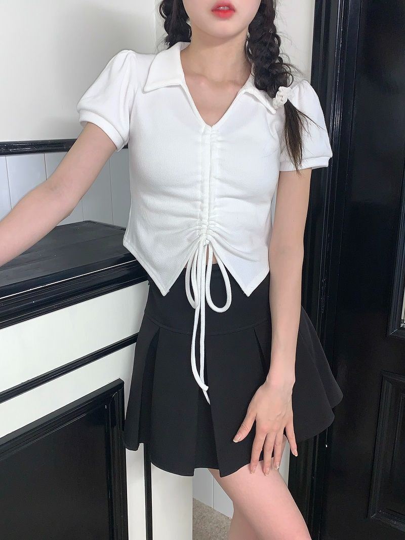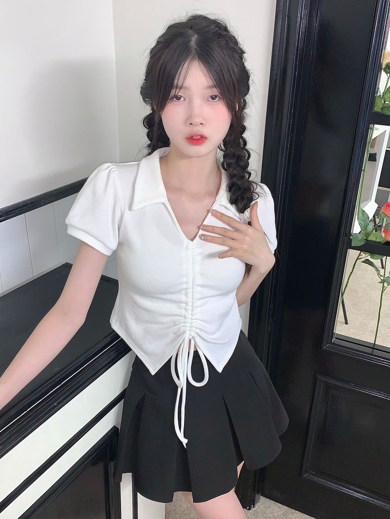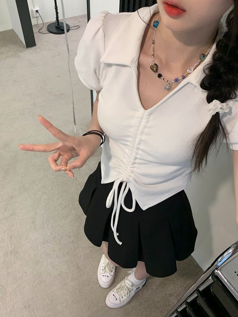【现货】主播自选!正肩泡泡袖 抽绳V领 polo领 短款华夫