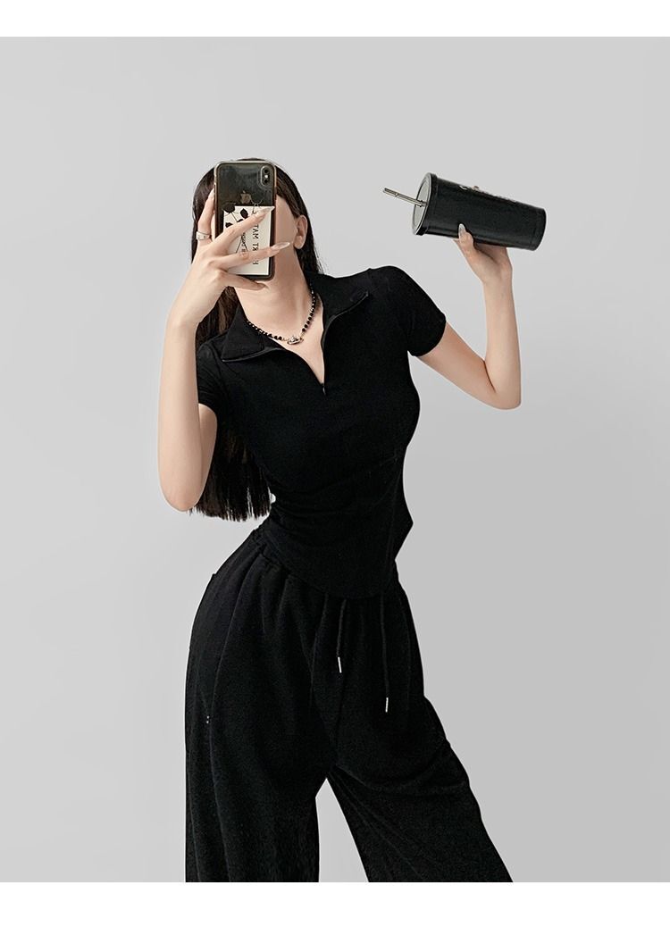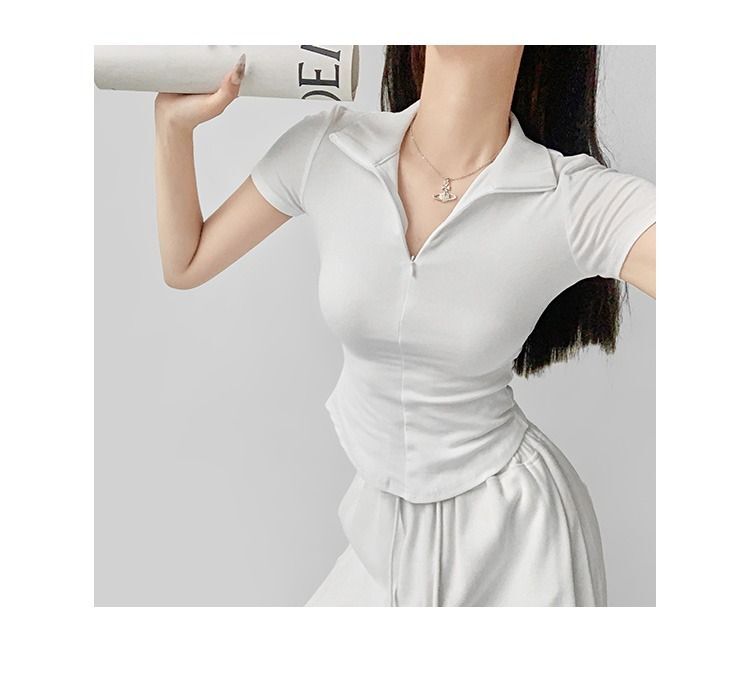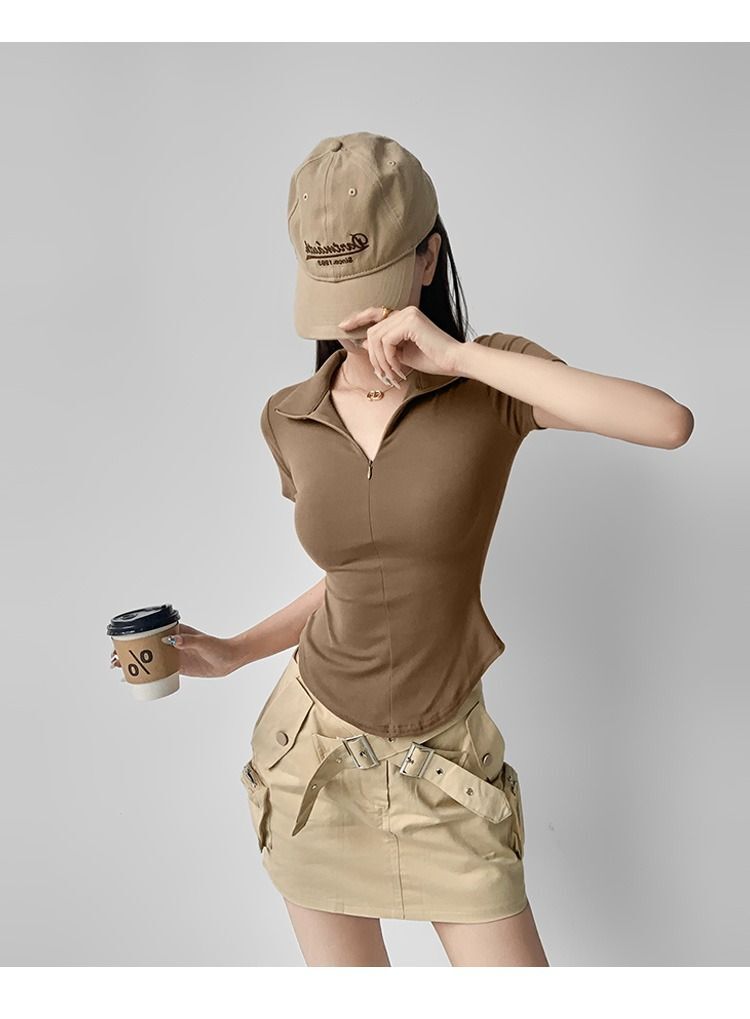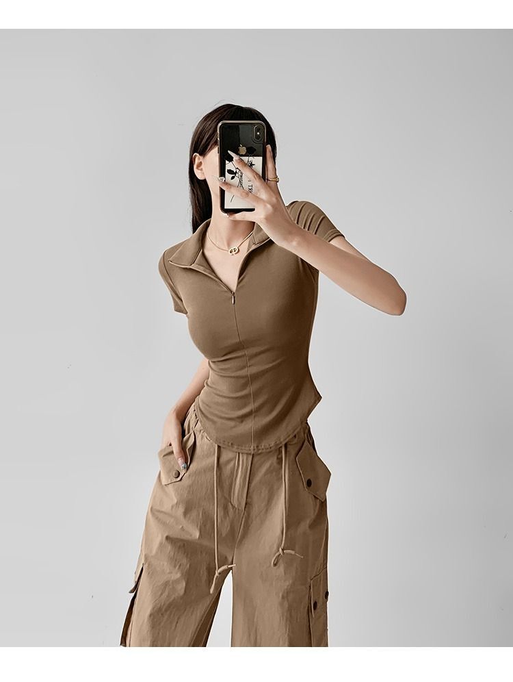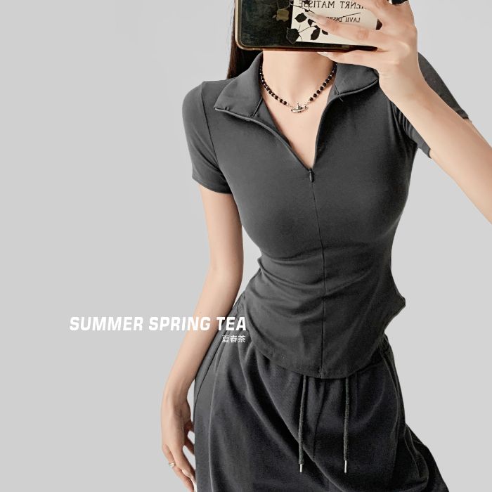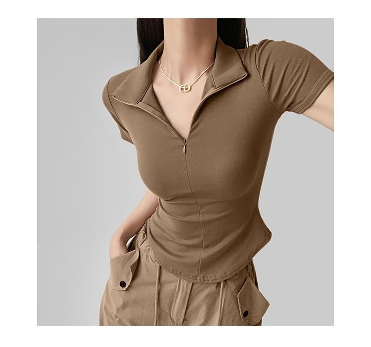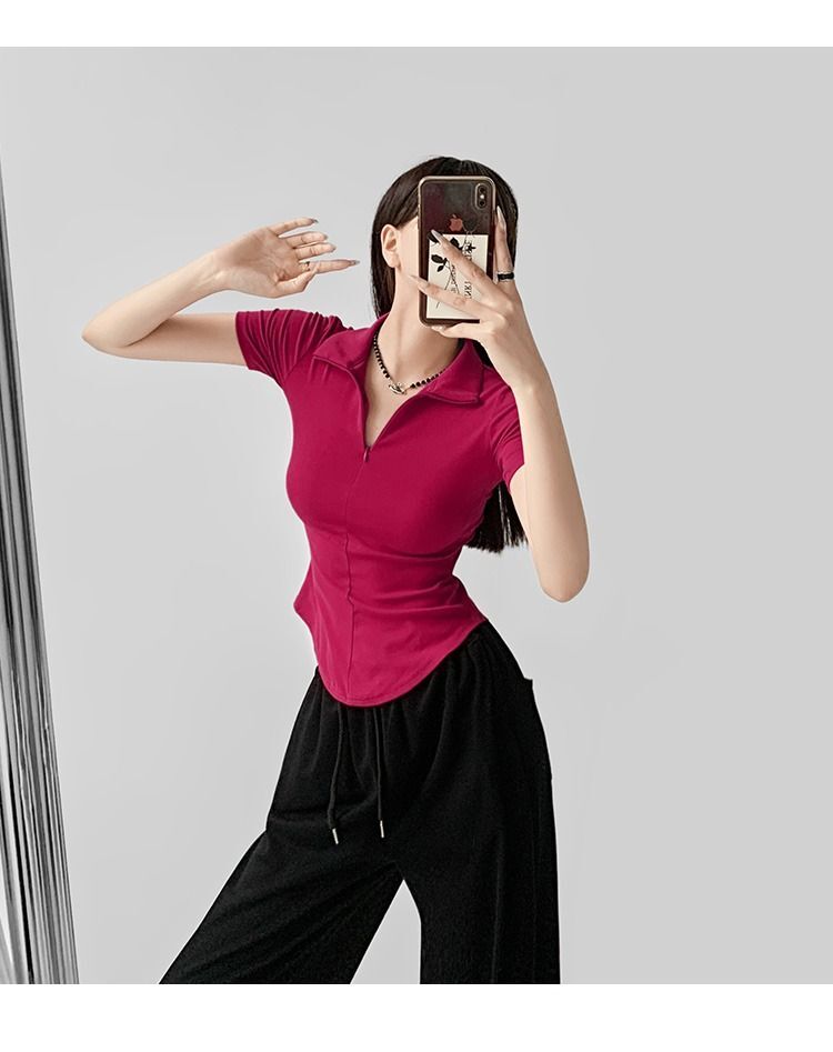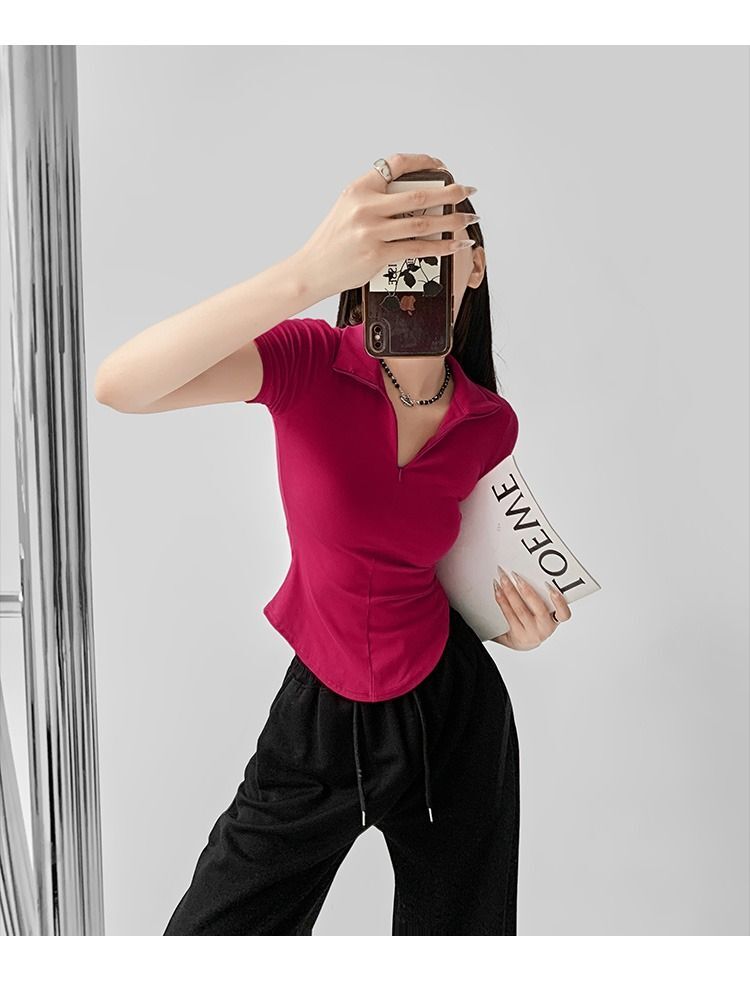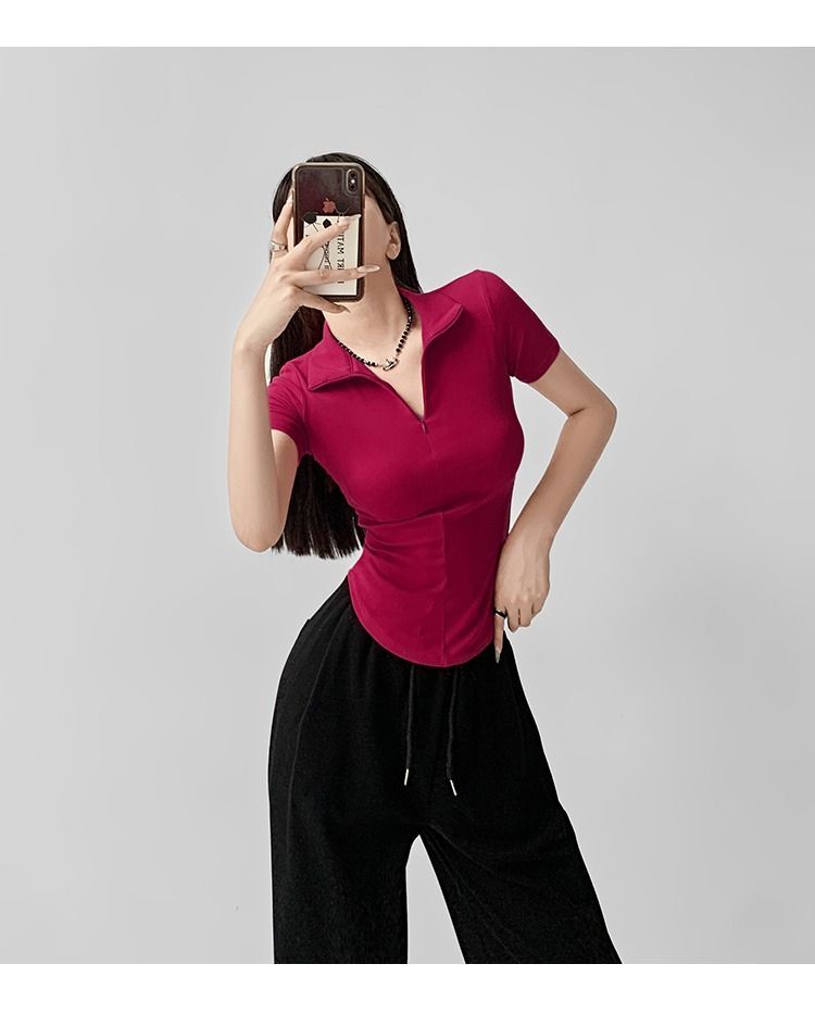 • 纯欲辣妹红色上衣女翻领修身短袖上衣显瘦纯色弹力收腰T恤
