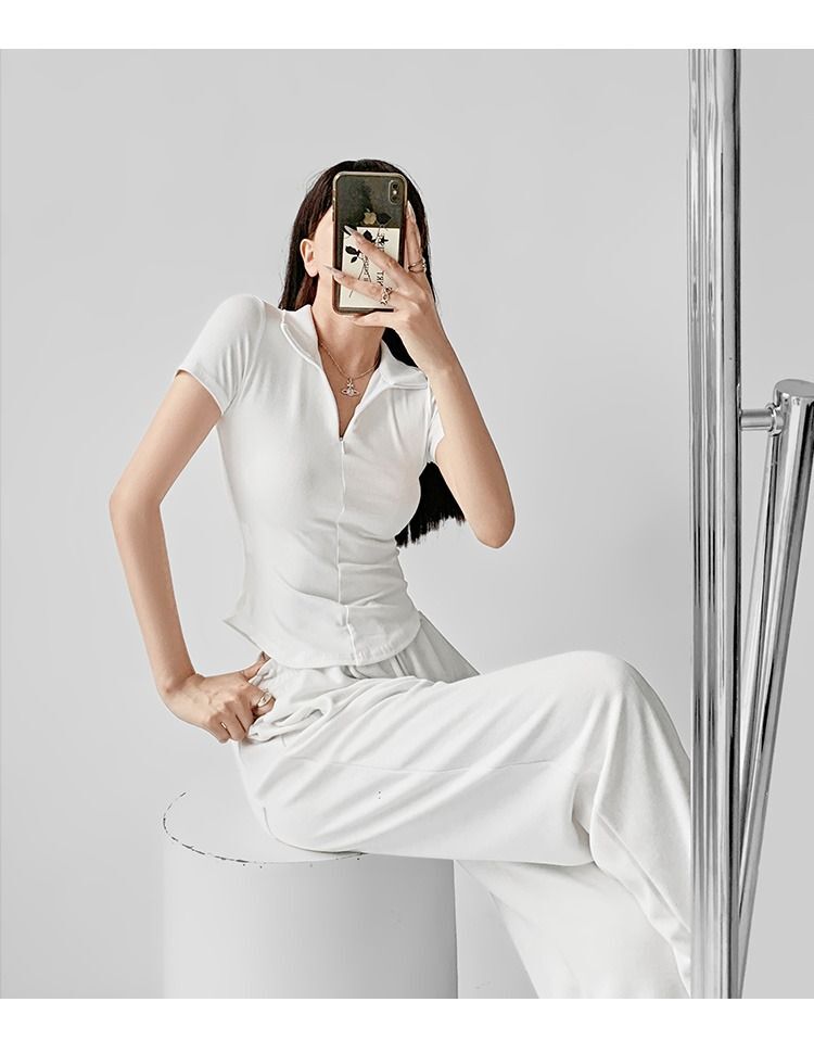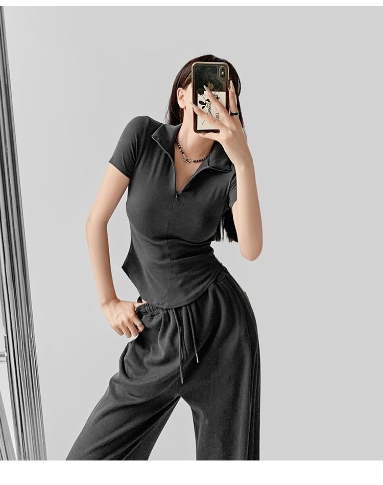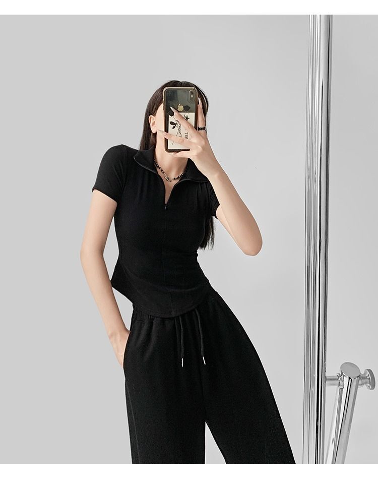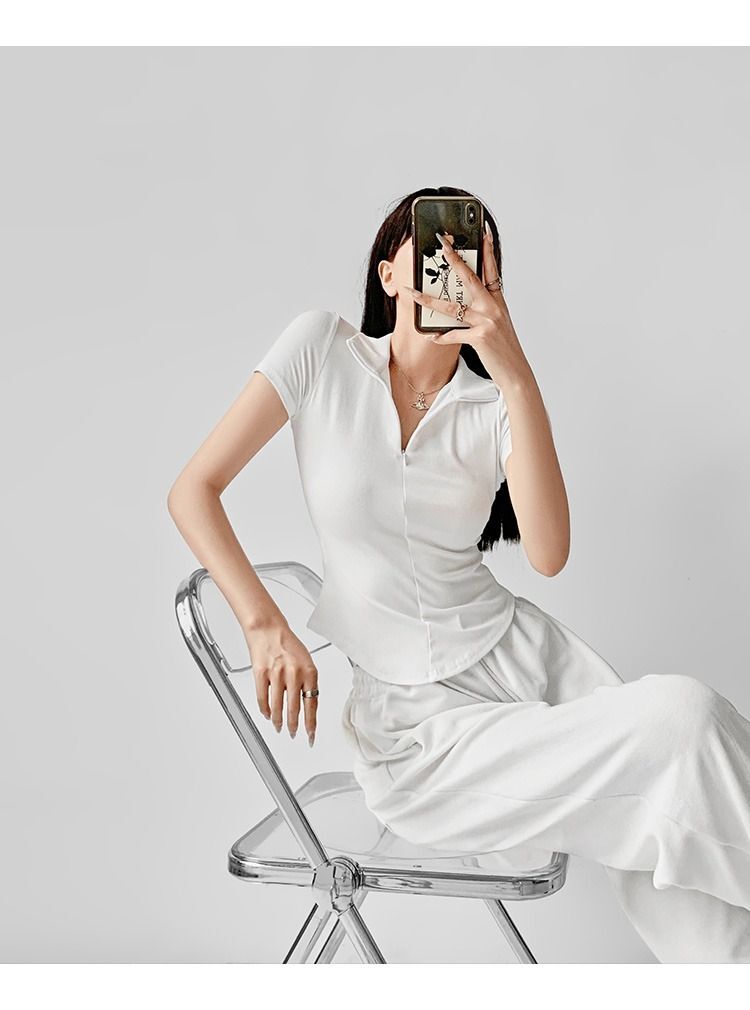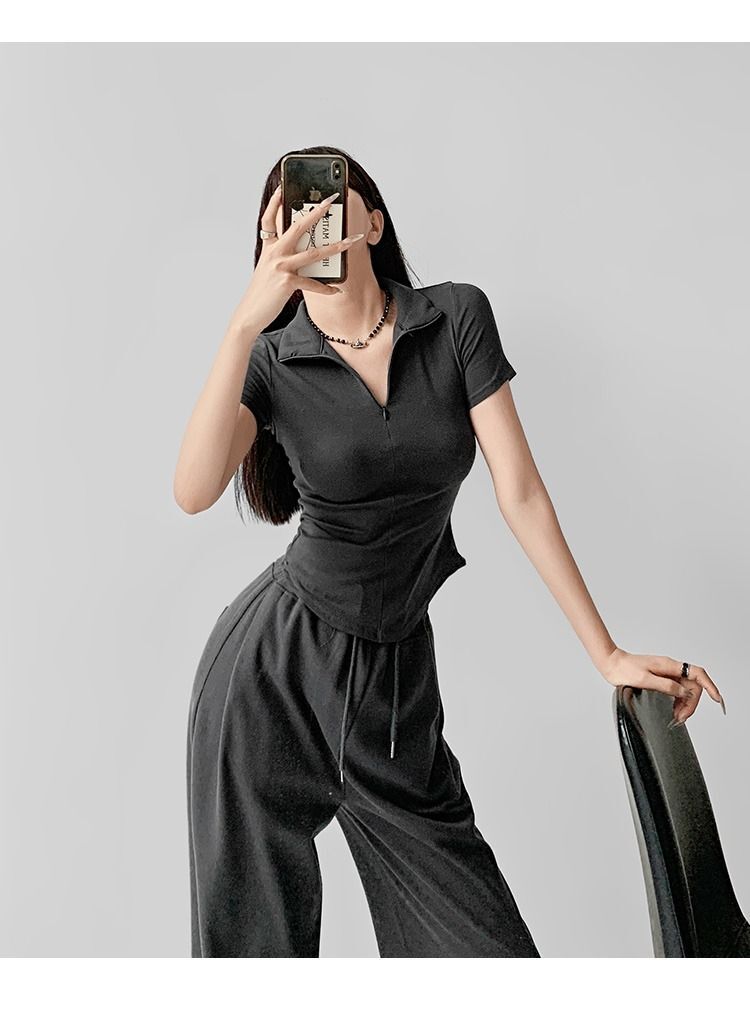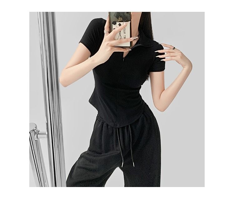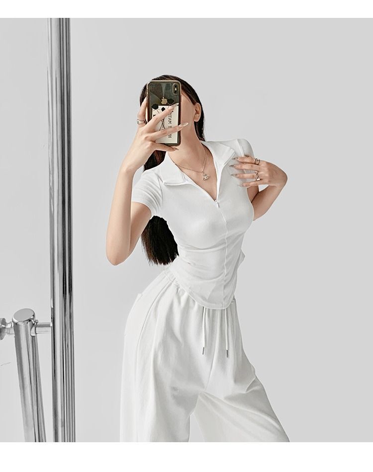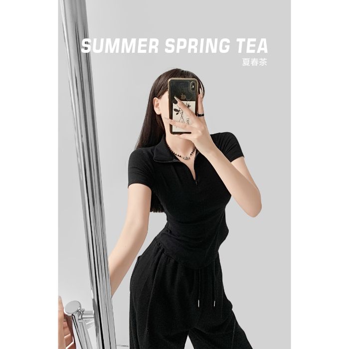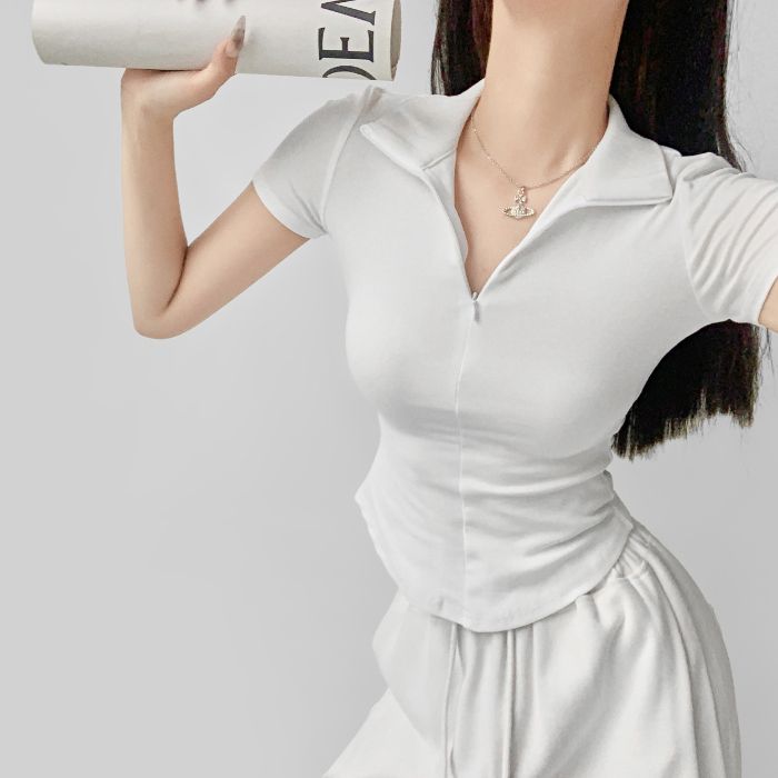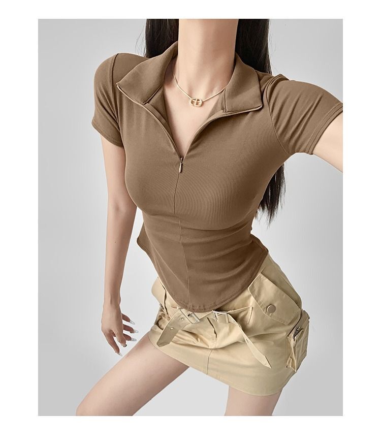 • 纯欲辣妹红色上衣女翻领修身短袖上衣显瘦纯色弹力收腰T恤