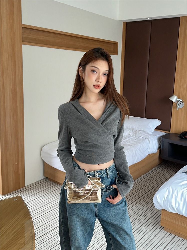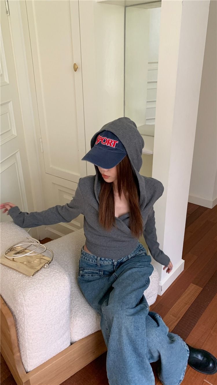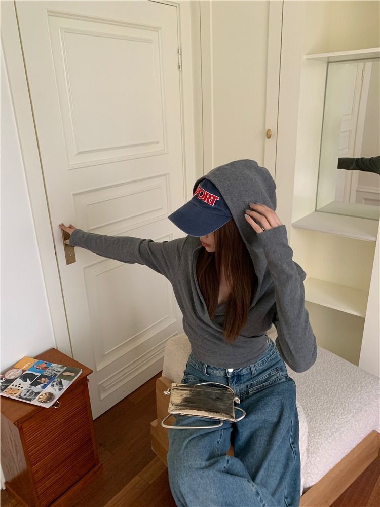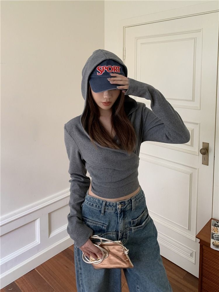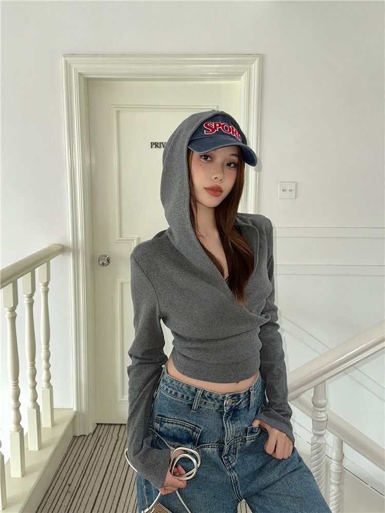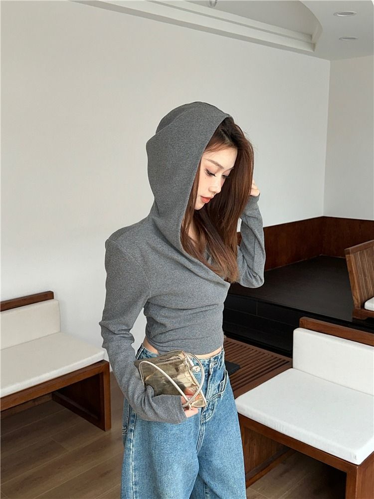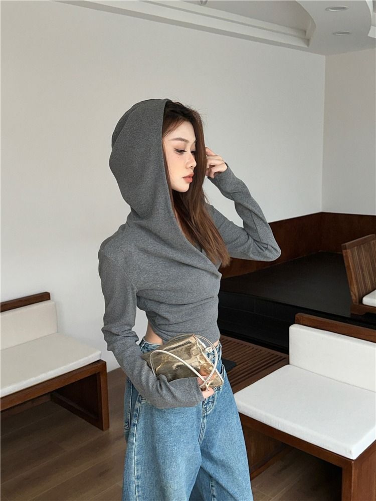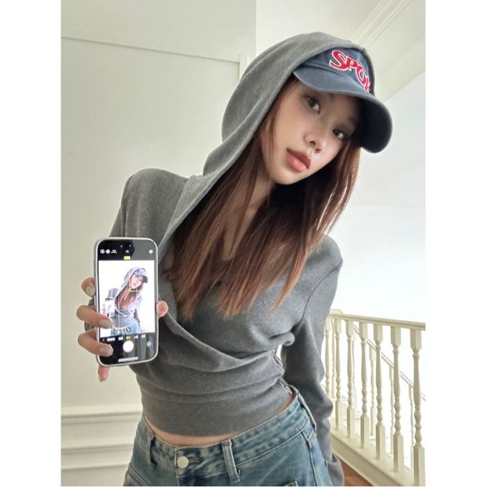 MR【天猫质量 螺纹德绒】复古设计感交叉连帽长袖T恤女早秋短