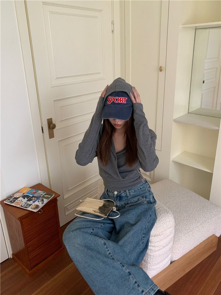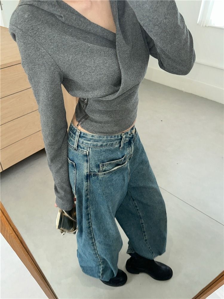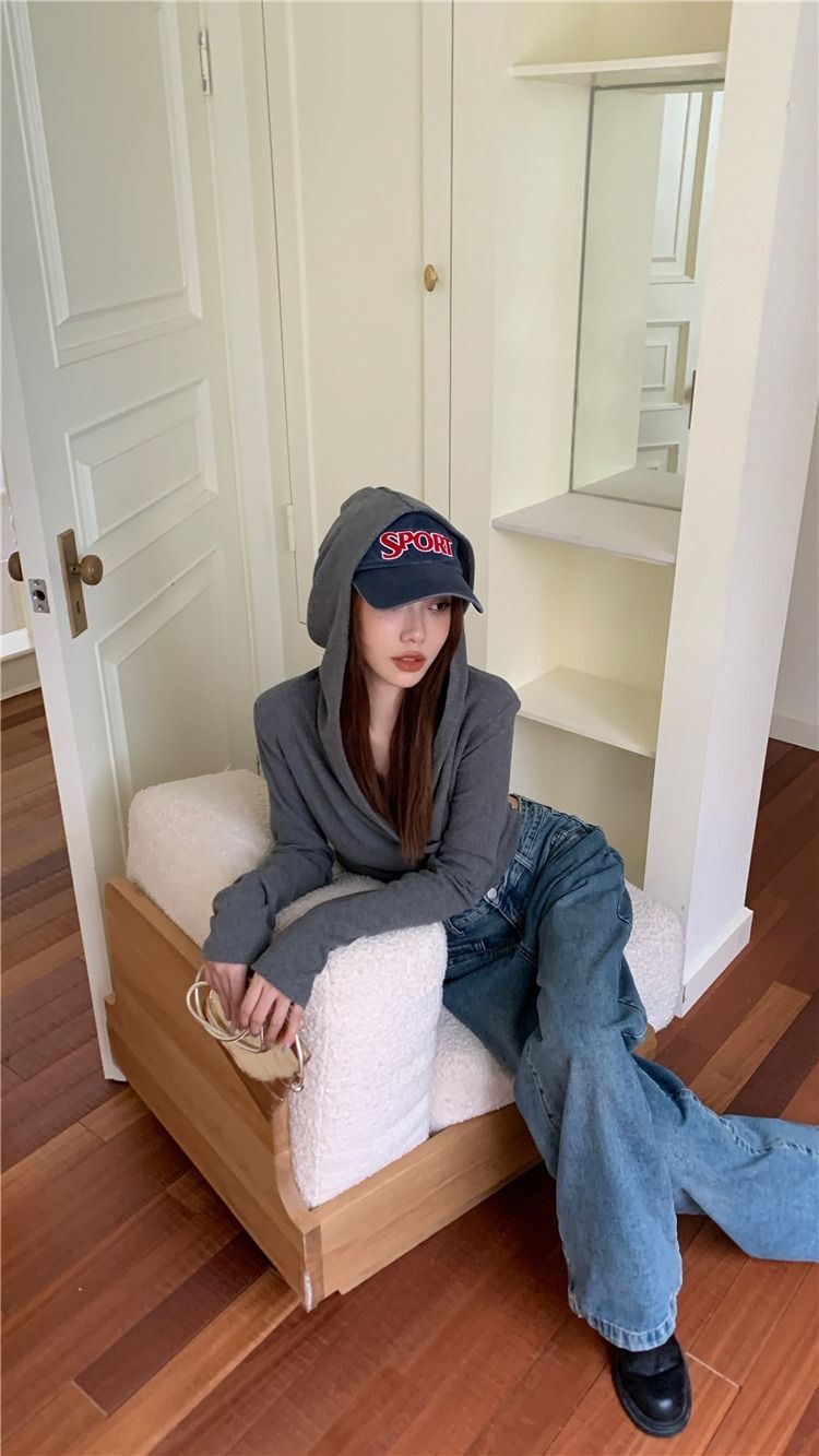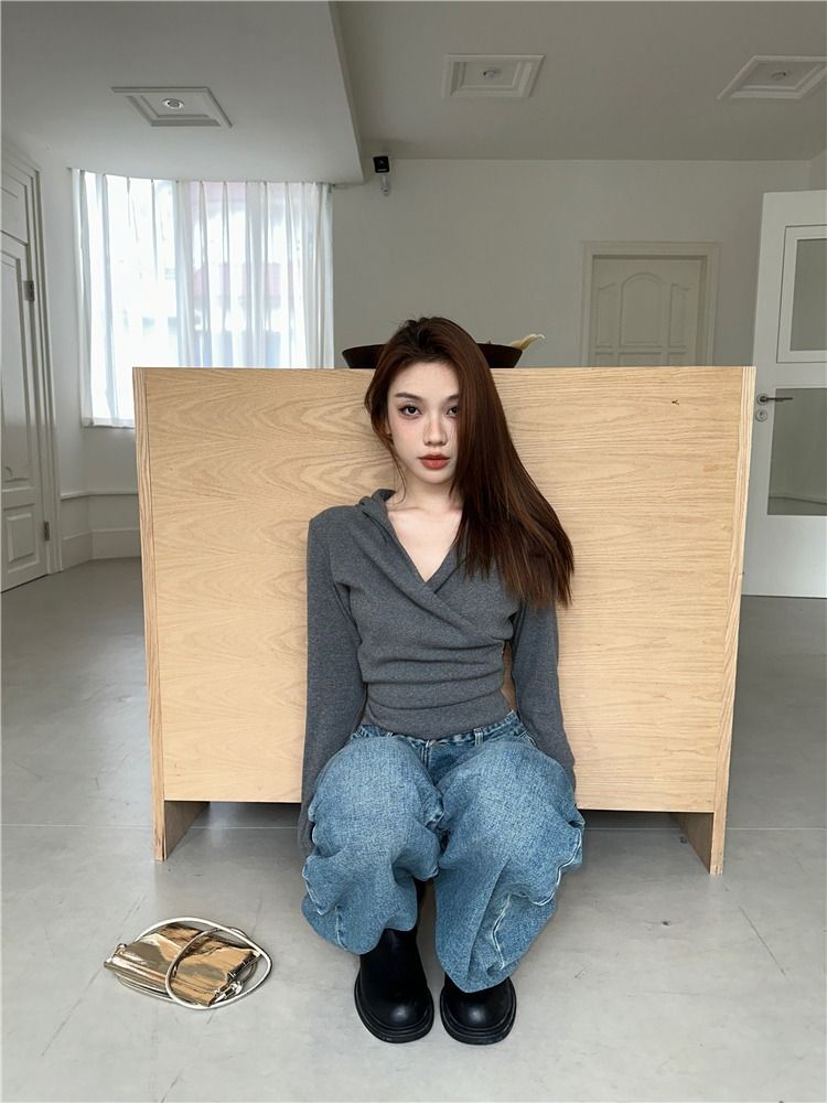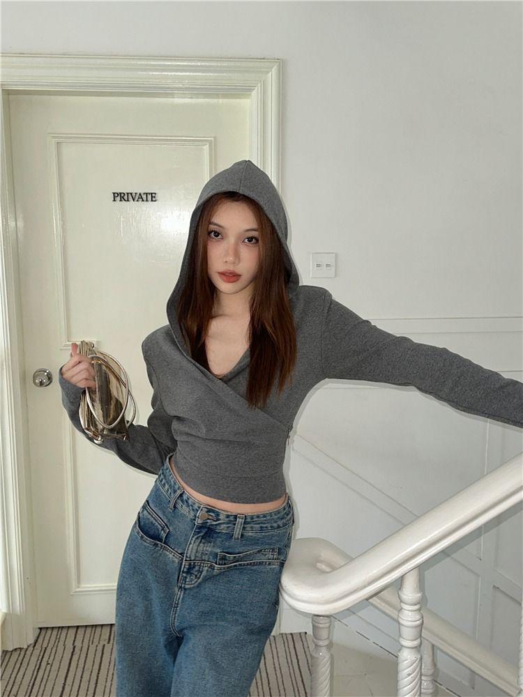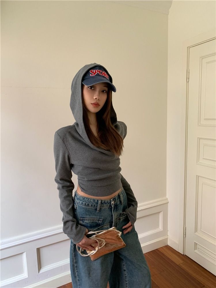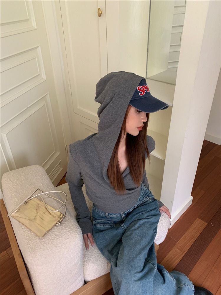 MR【天猫质量 螺纹德绒】复古设计感交叉连帽长袖T恤女早秋短