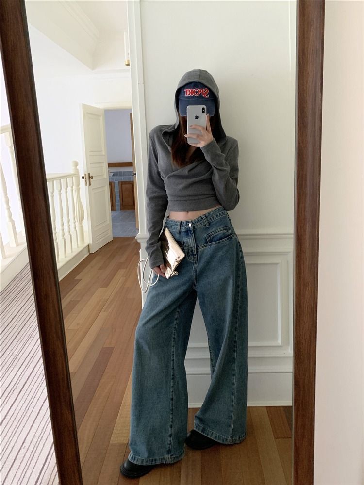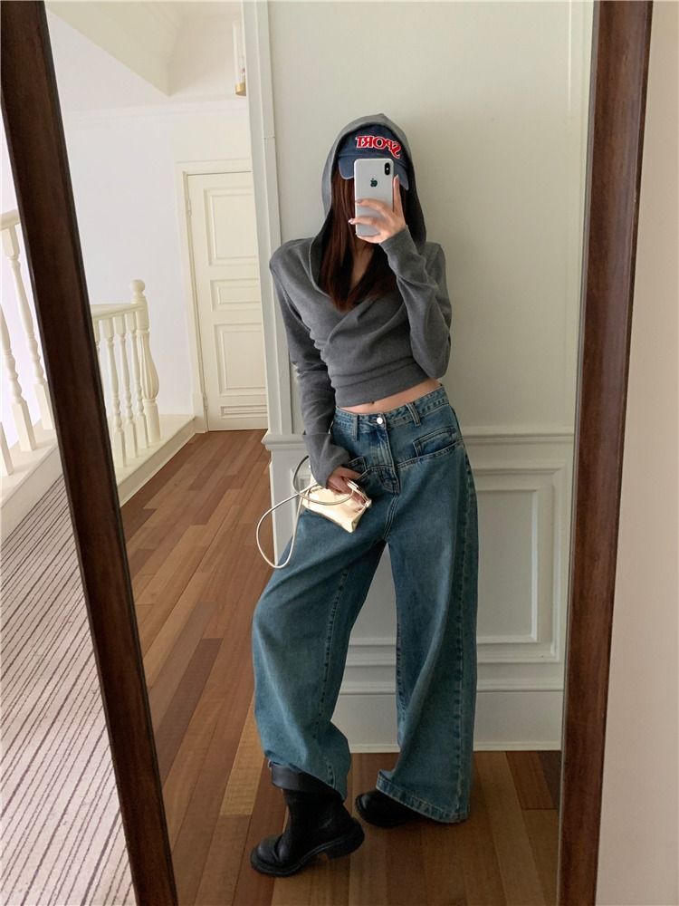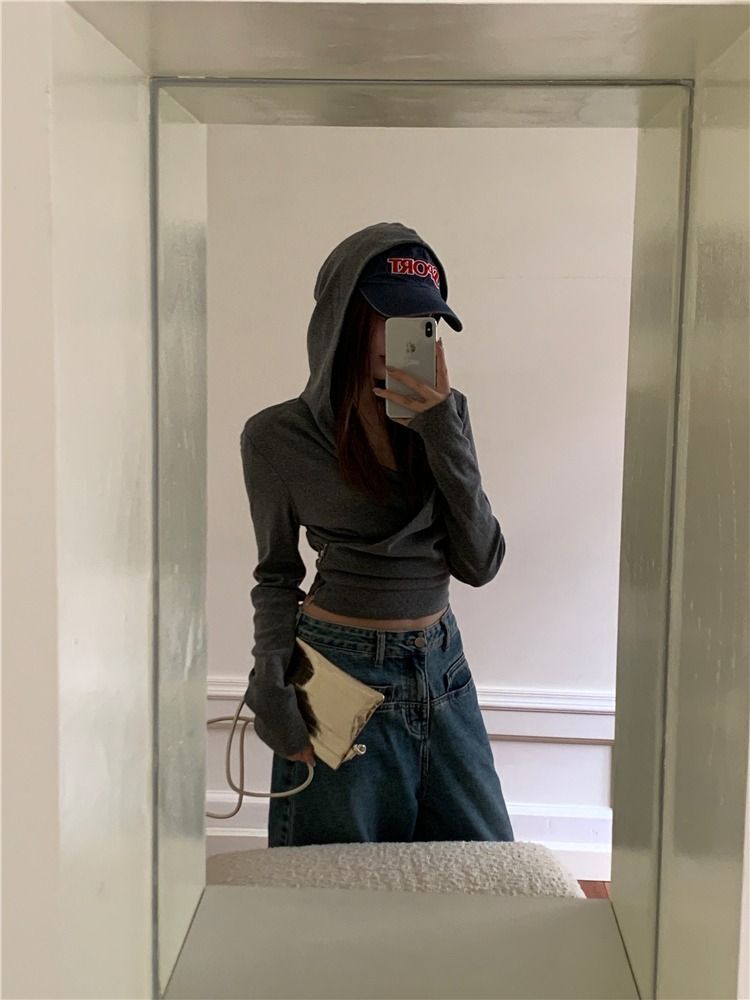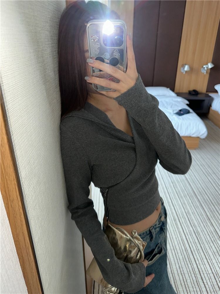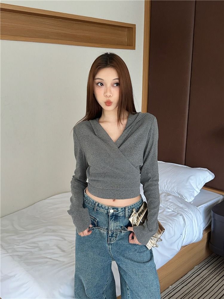 • MR【天猫质量 螺纹德绒】复古设计感交叉连帽长袖T恤女早秋短