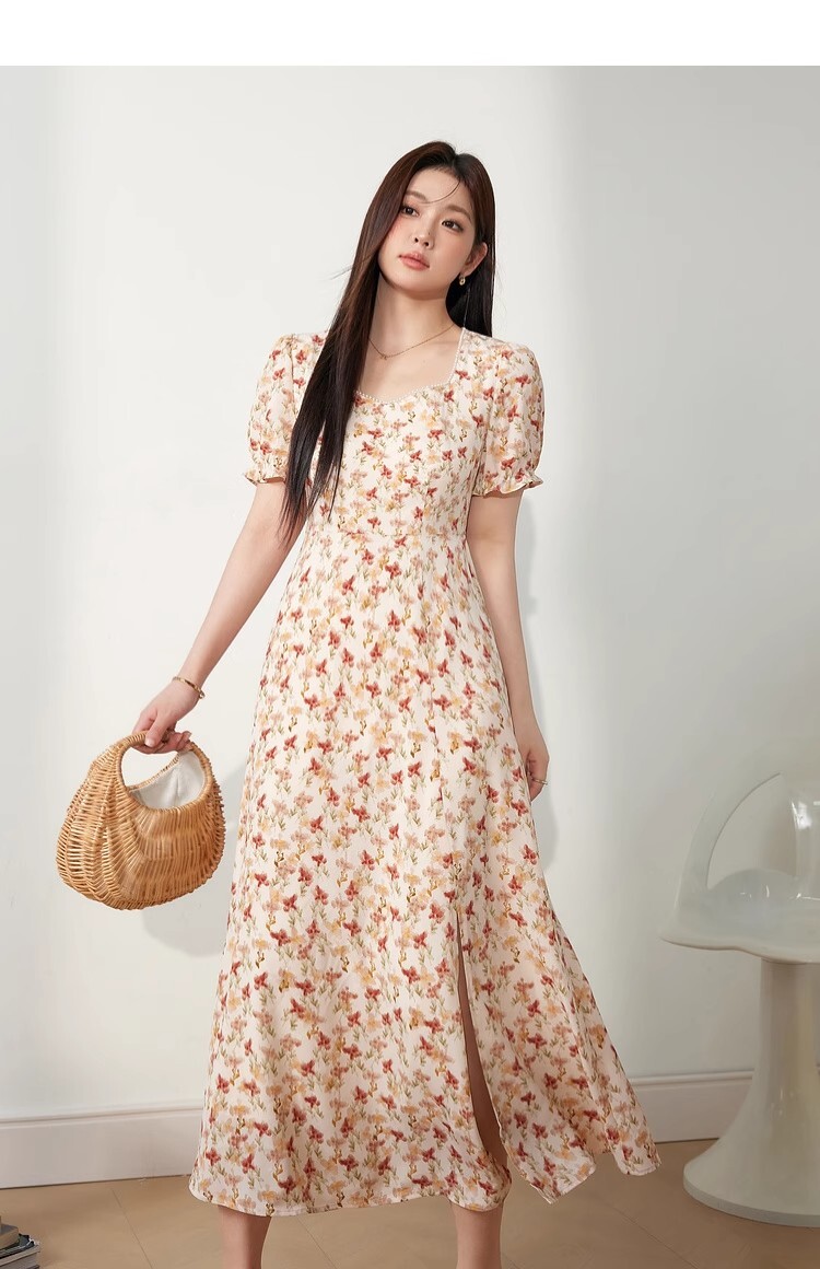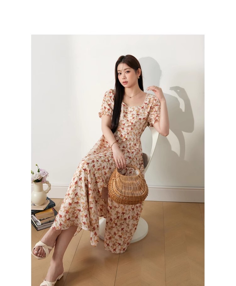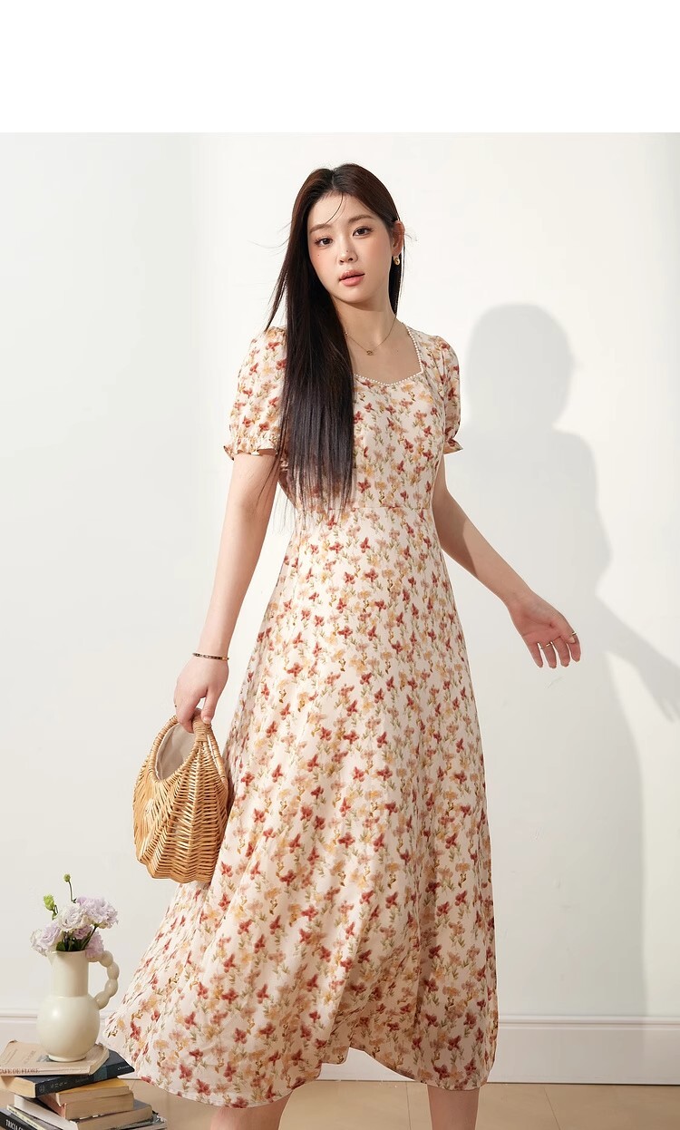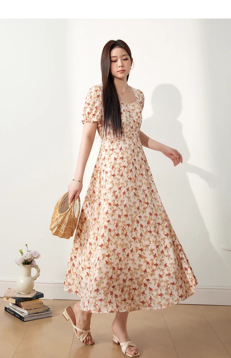 • 2025新款海边度假风方领泡泡袖连衣裙夏季女装胖mm显瘦碎花