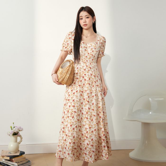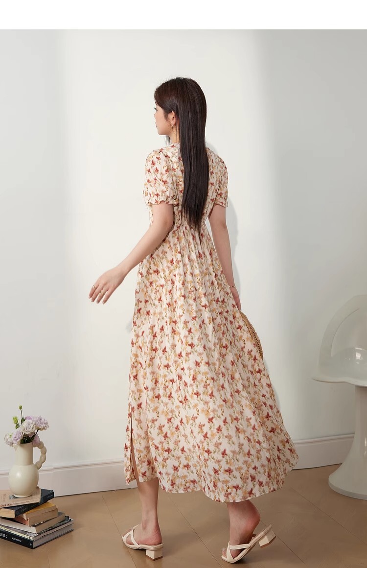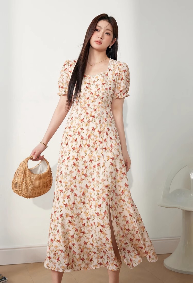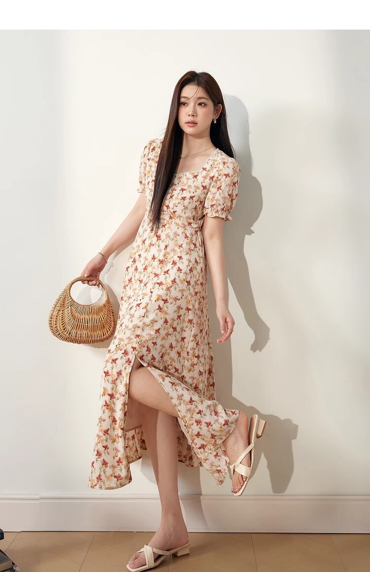 • 2025新款海边度假风方领泡泡袖连衣裙夏季女装胖mm显瘦碎花