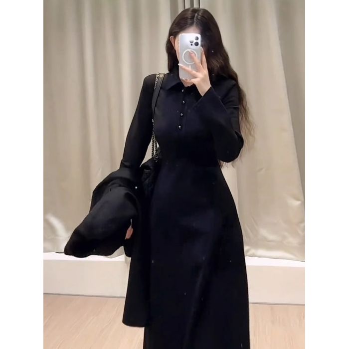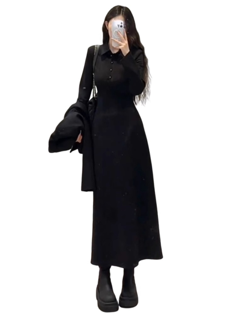 • 法式气质黑色长袖衬衫连衣裙女高级感御姐修身显瘦打底包臀长裙子
