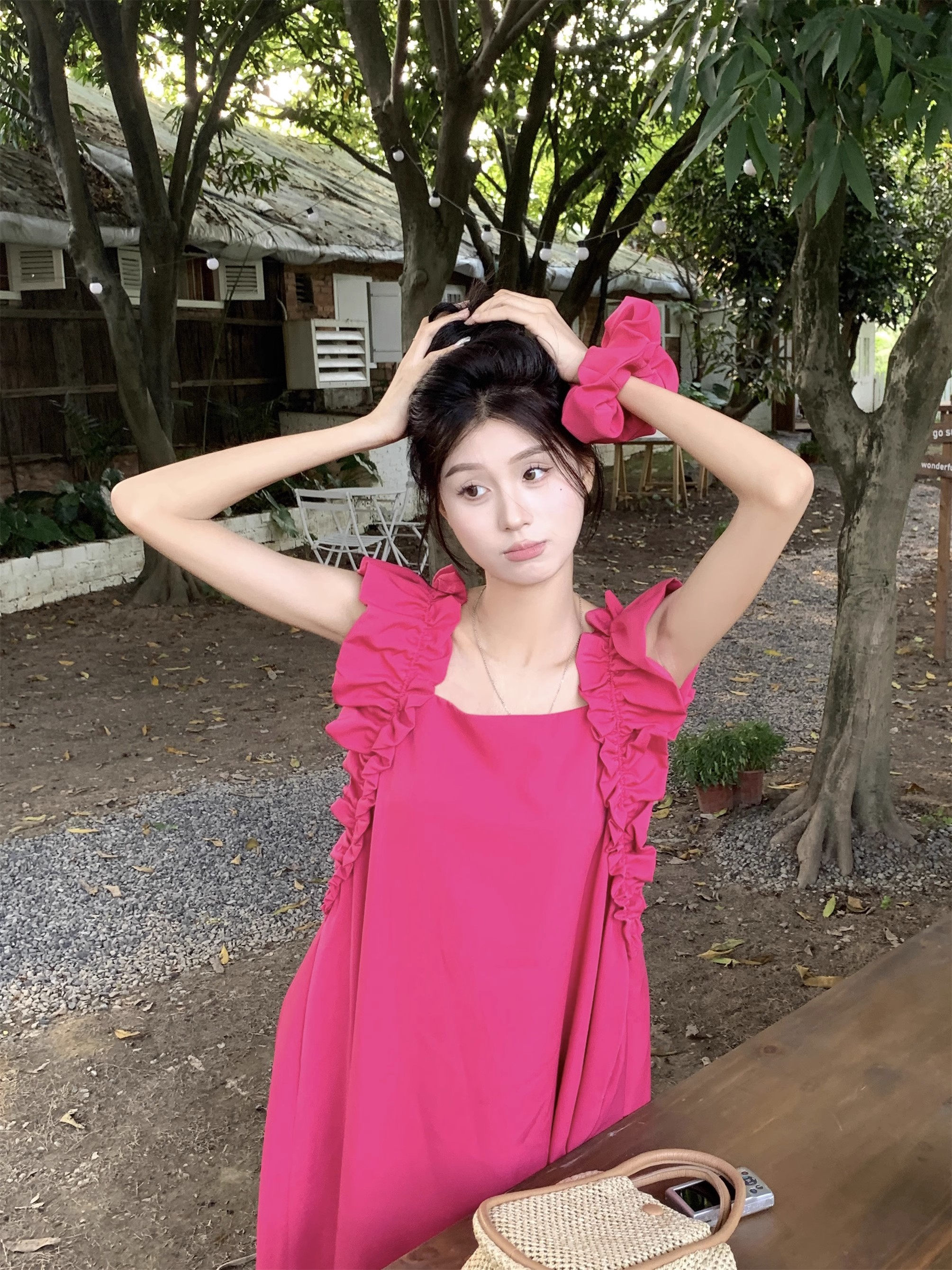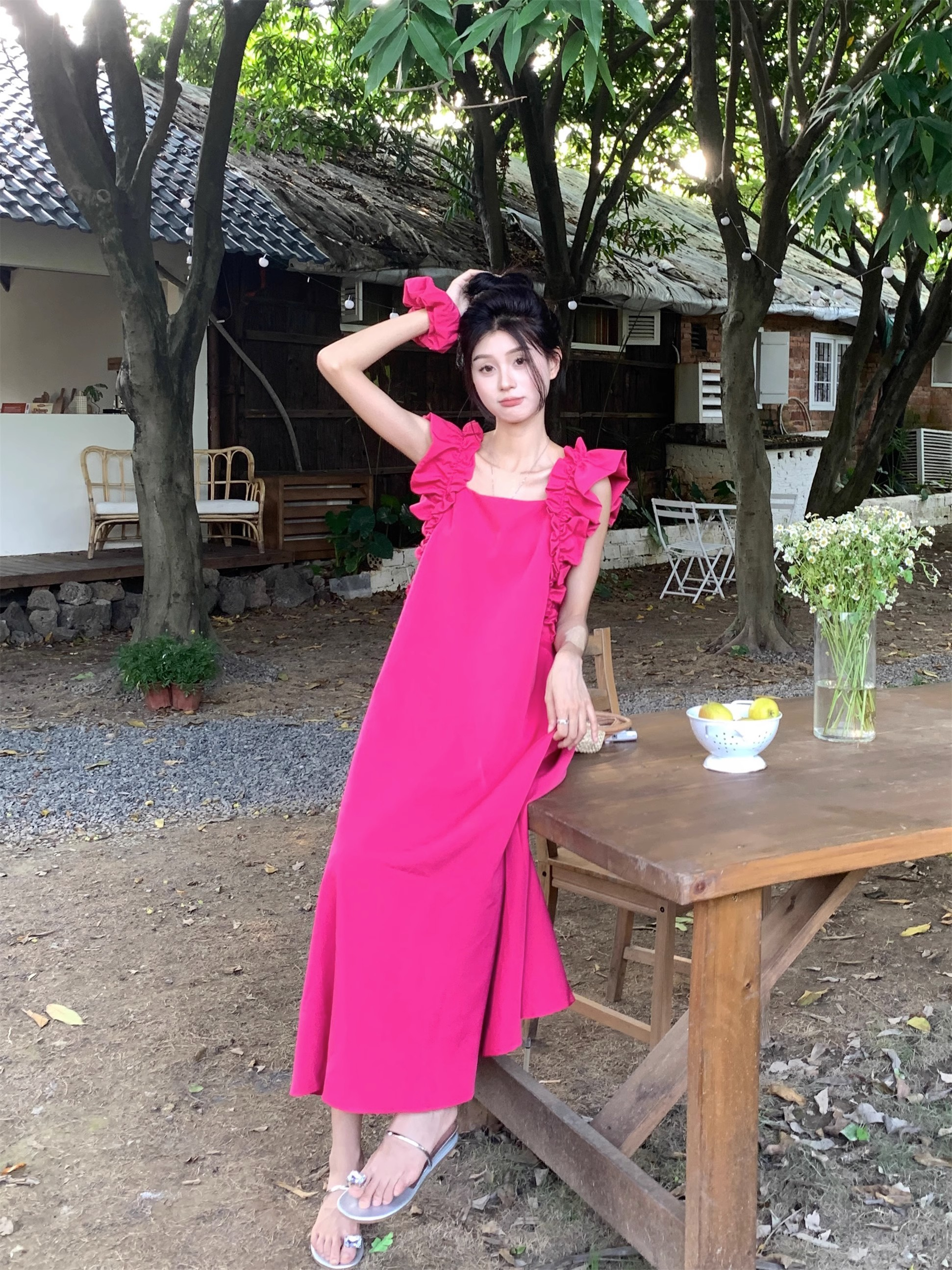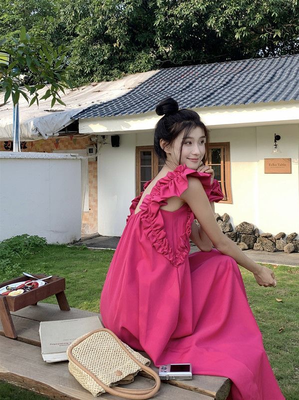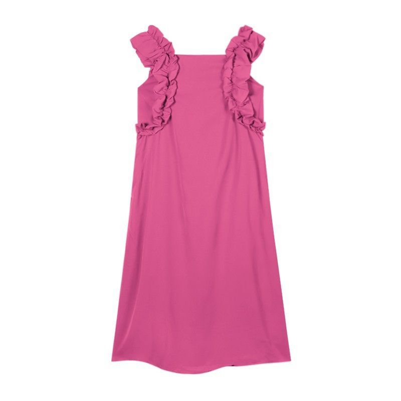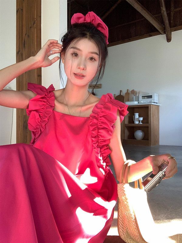 • 复古法式方领木耳边小飞袖连衣裙女夏宽松显瘦高级质感玫红色长裙
