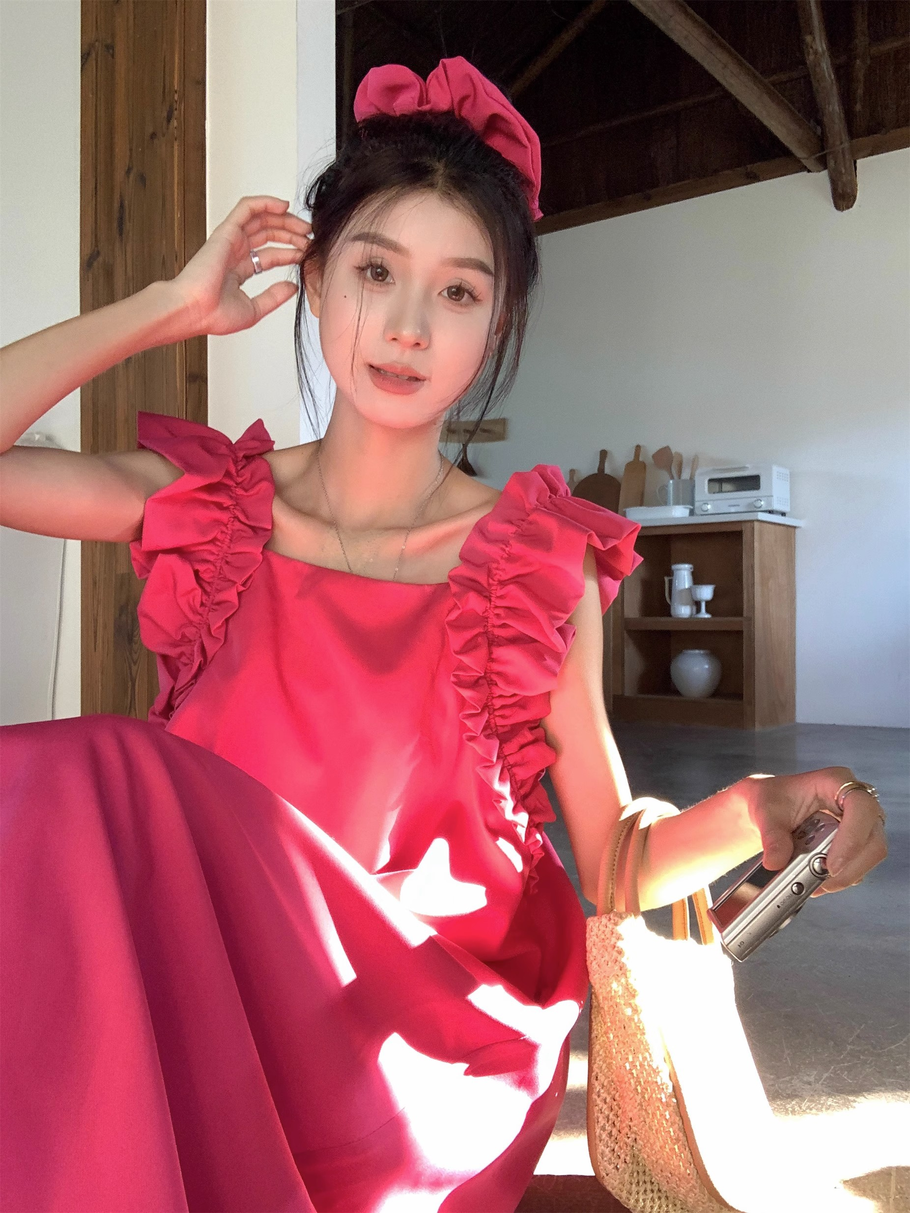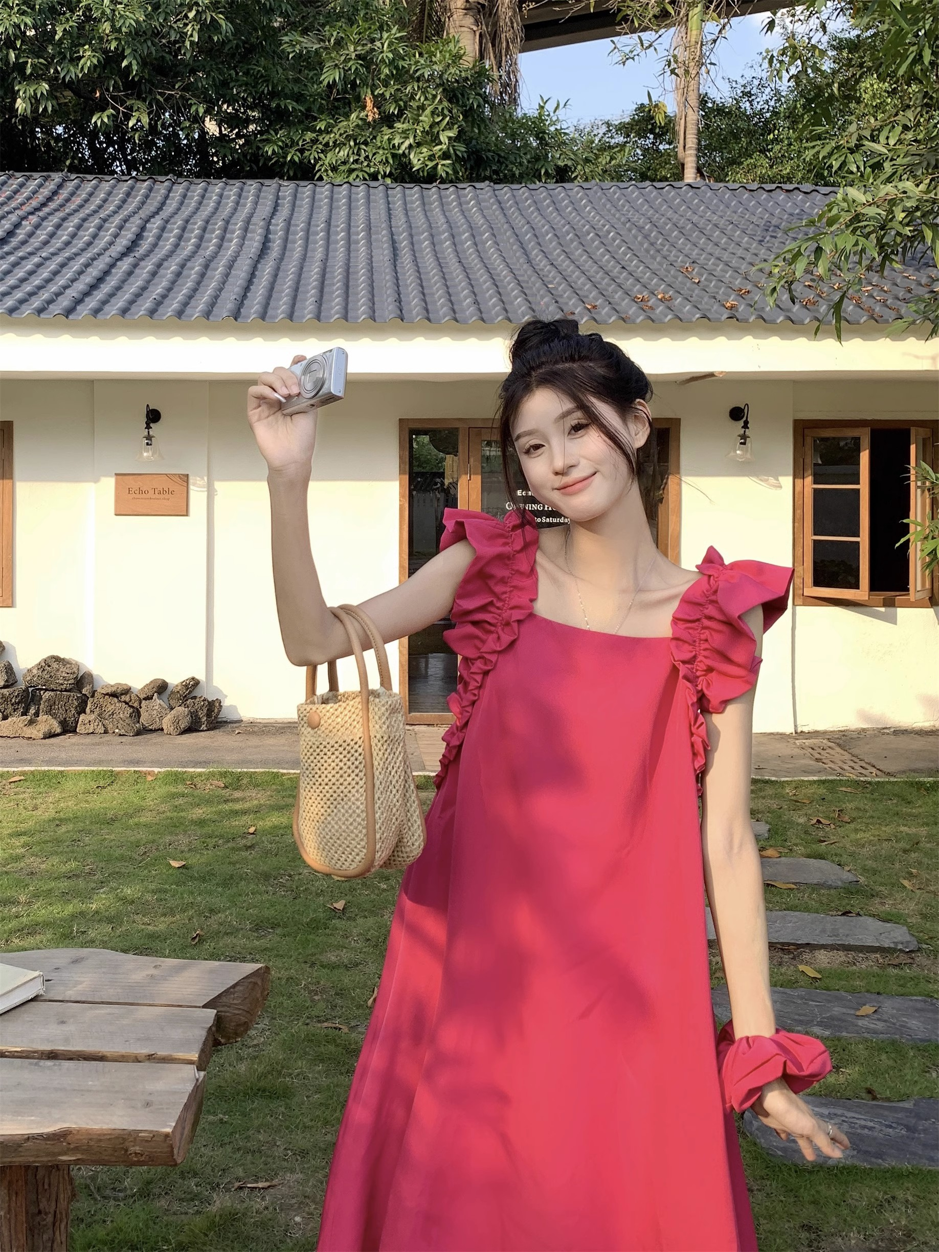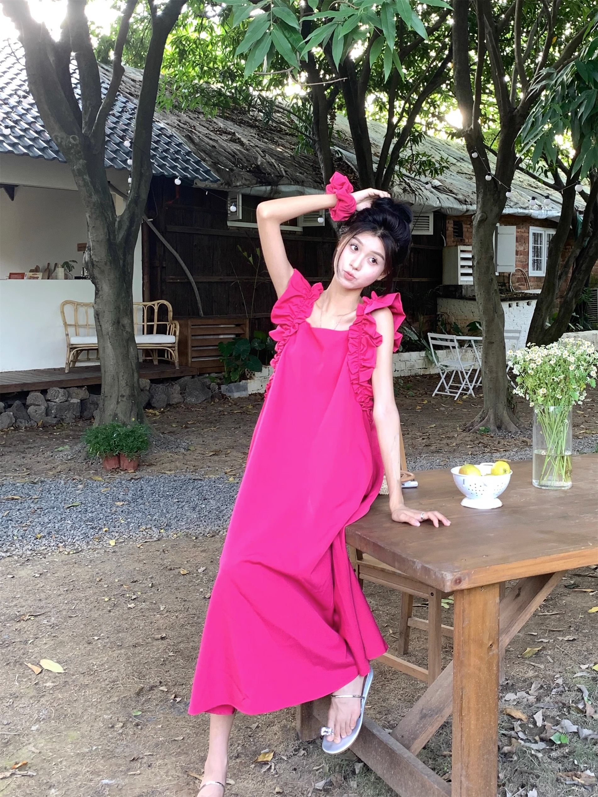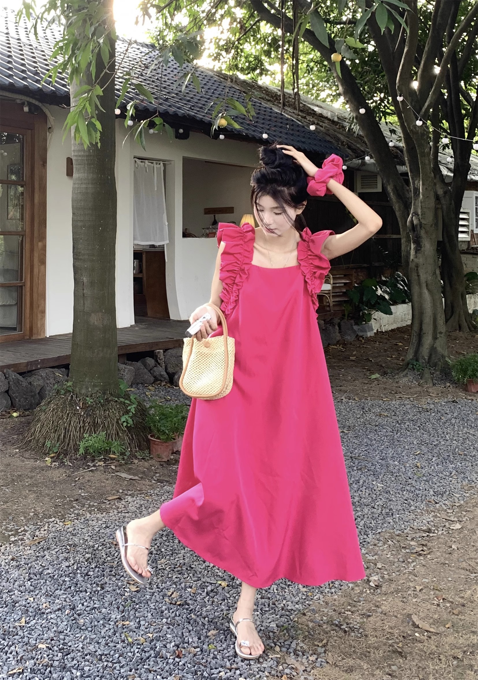 • 复古法式方领木耳边小飞袖连衣裙女夏宽松显瘦高级质感玫红色长裙