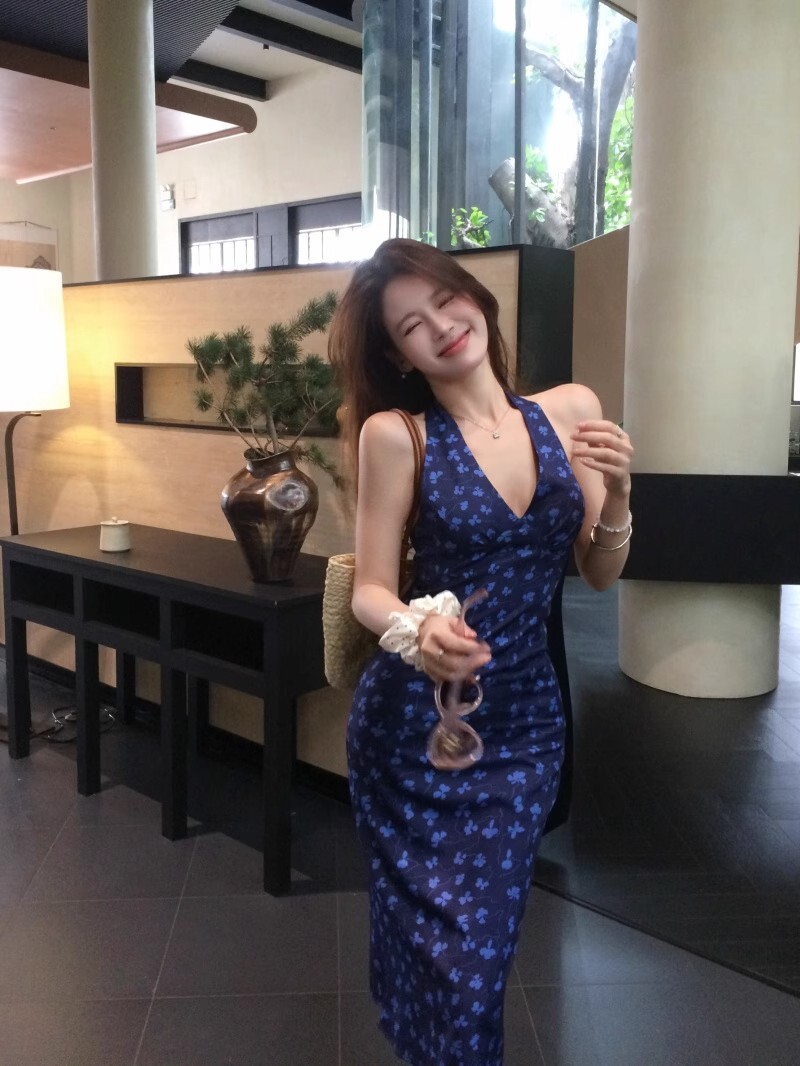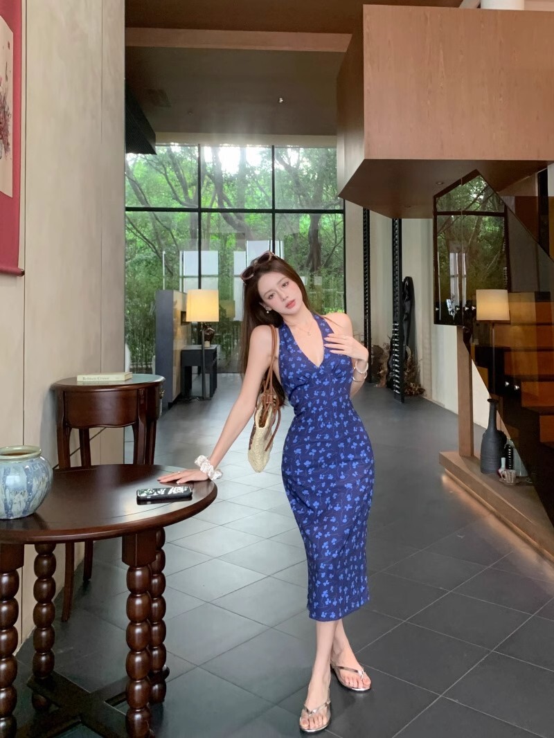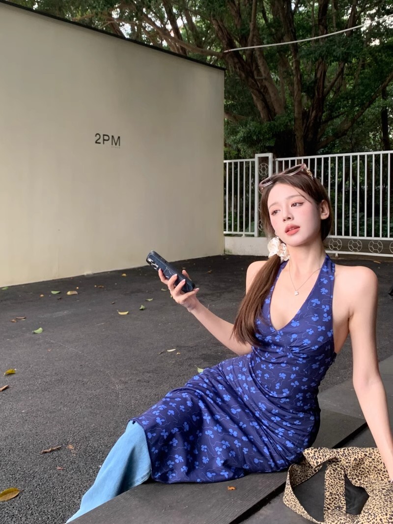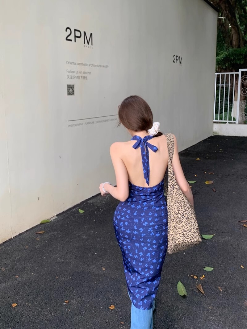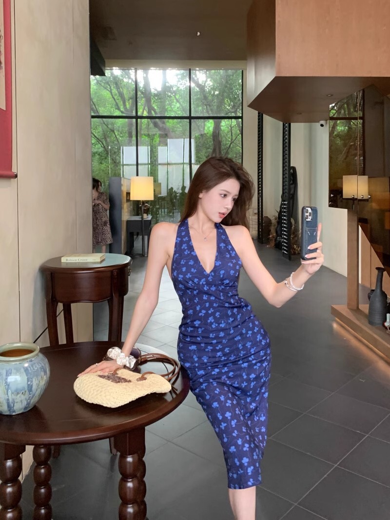 • 法式蓝色v领挂脖连衣裙女夏度假风收腰露背包臀裙修身碎花吊带裙