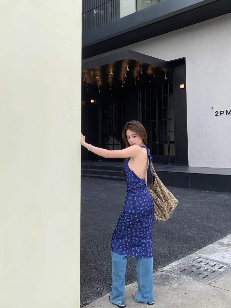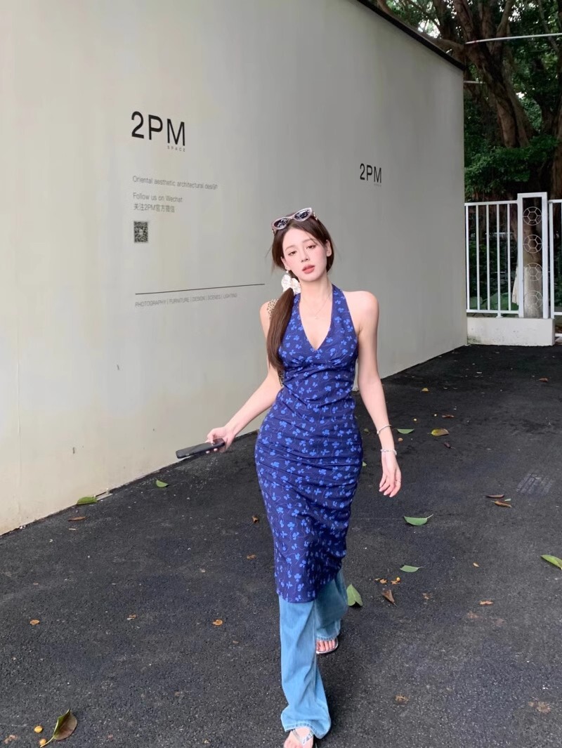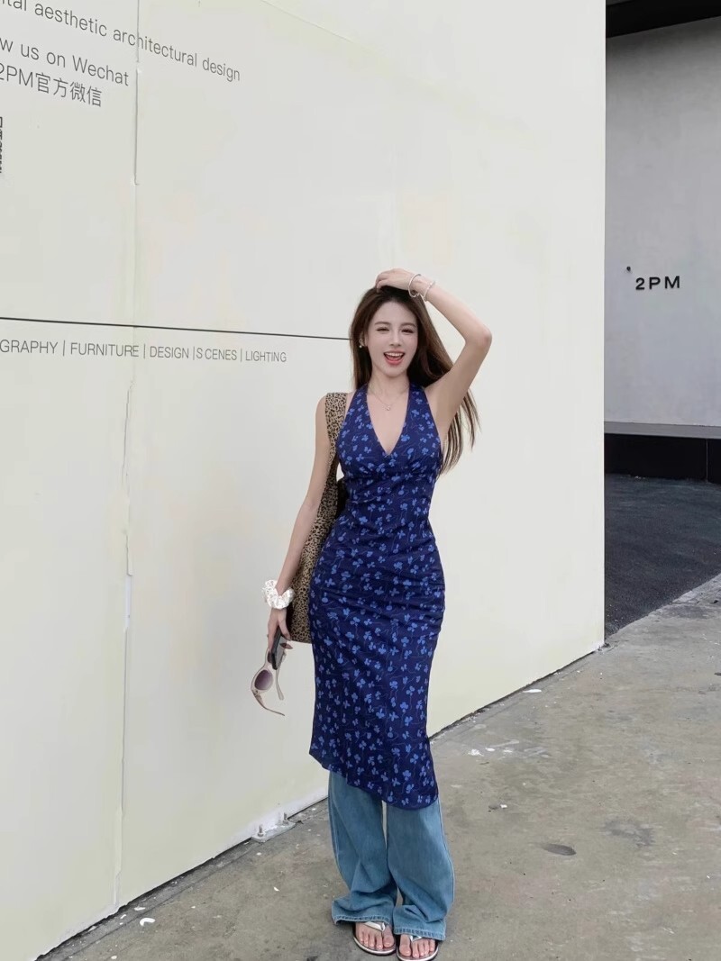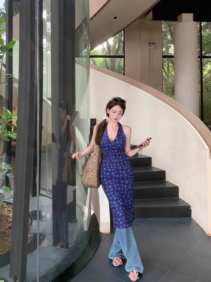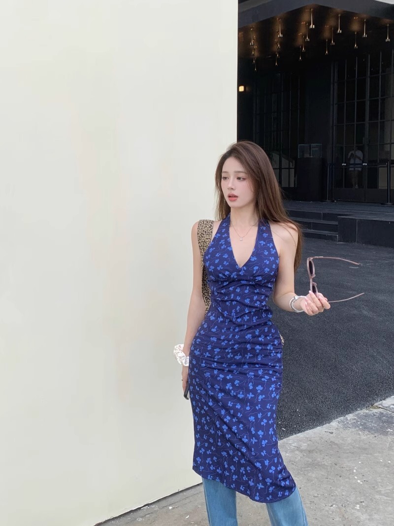 • 法式蓝色v领挂脖连衣裙女夏度假风收腰露背包臀裙修身碎花吊带裙