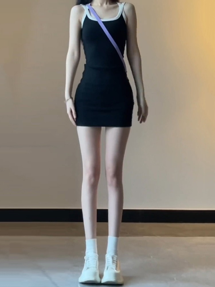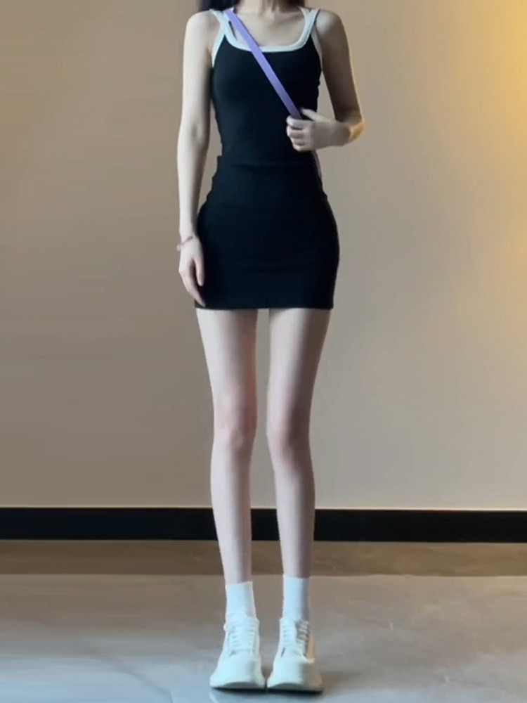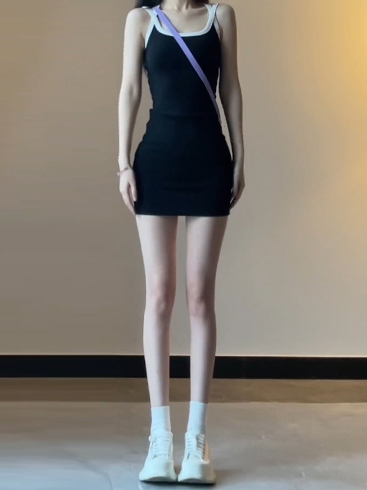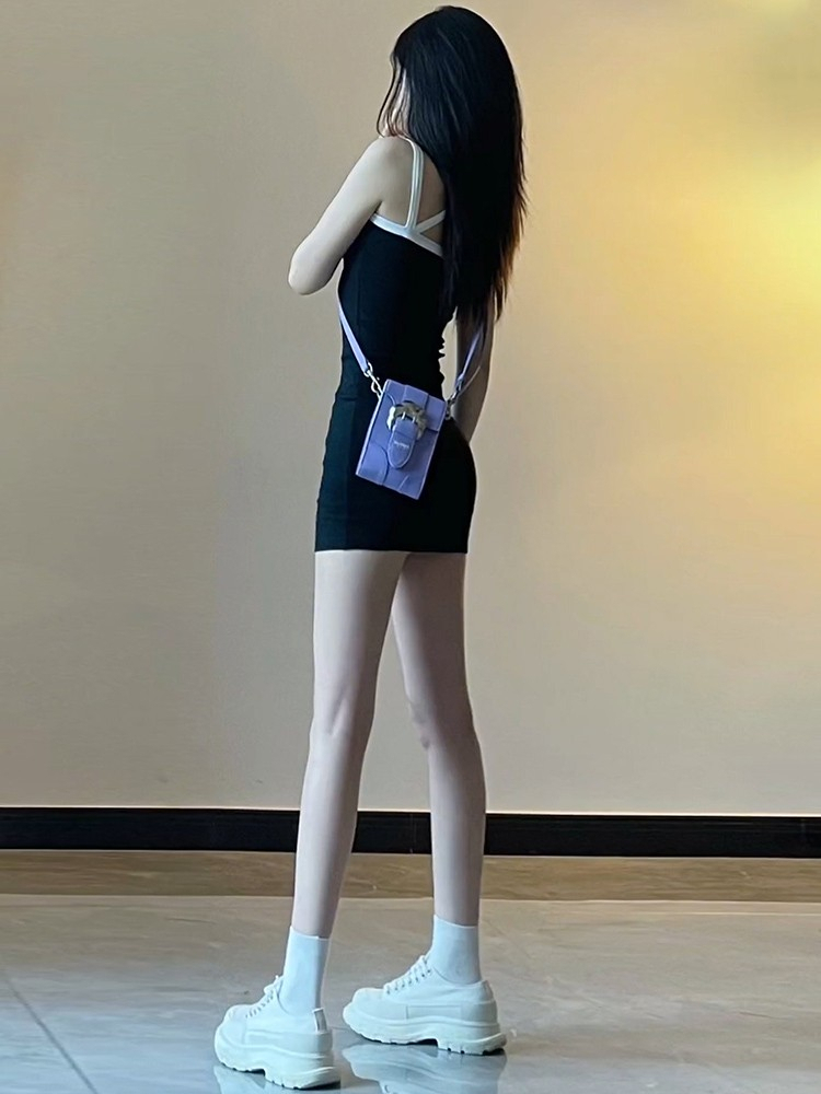 - 法式印花网纱紫色吊带连衣裙女夏季修身显瘦包臀短裙