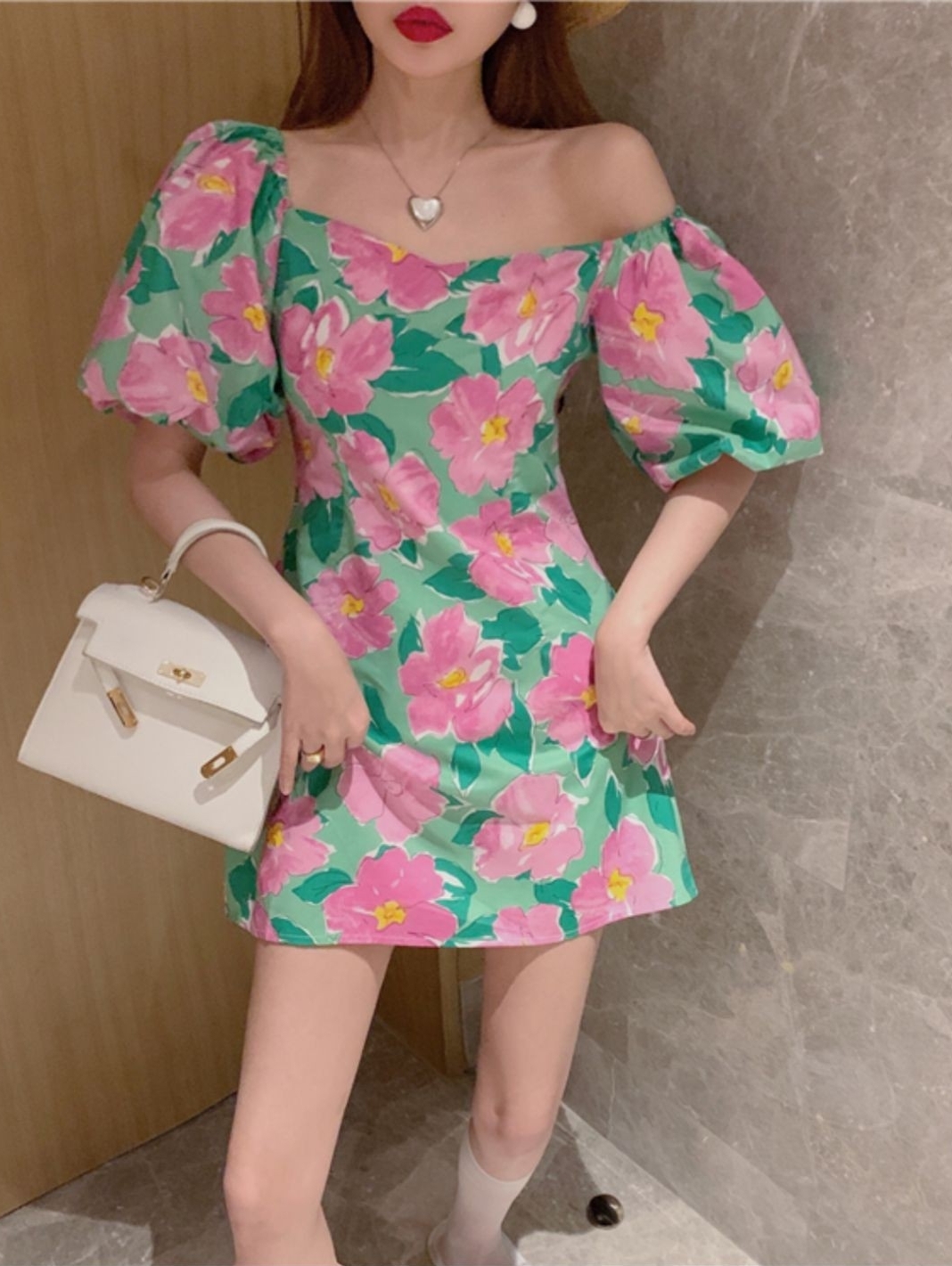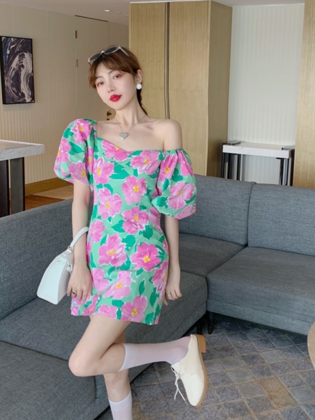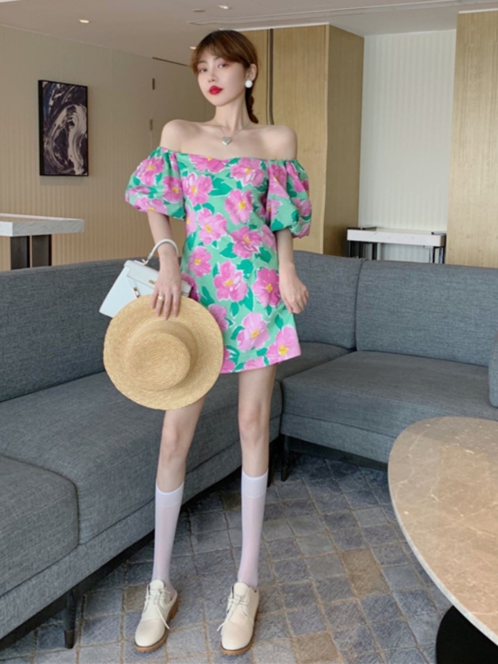 • 法式锁骨一字肩碎花连衣裙女2024夏季新款复古初恋温柔高级感