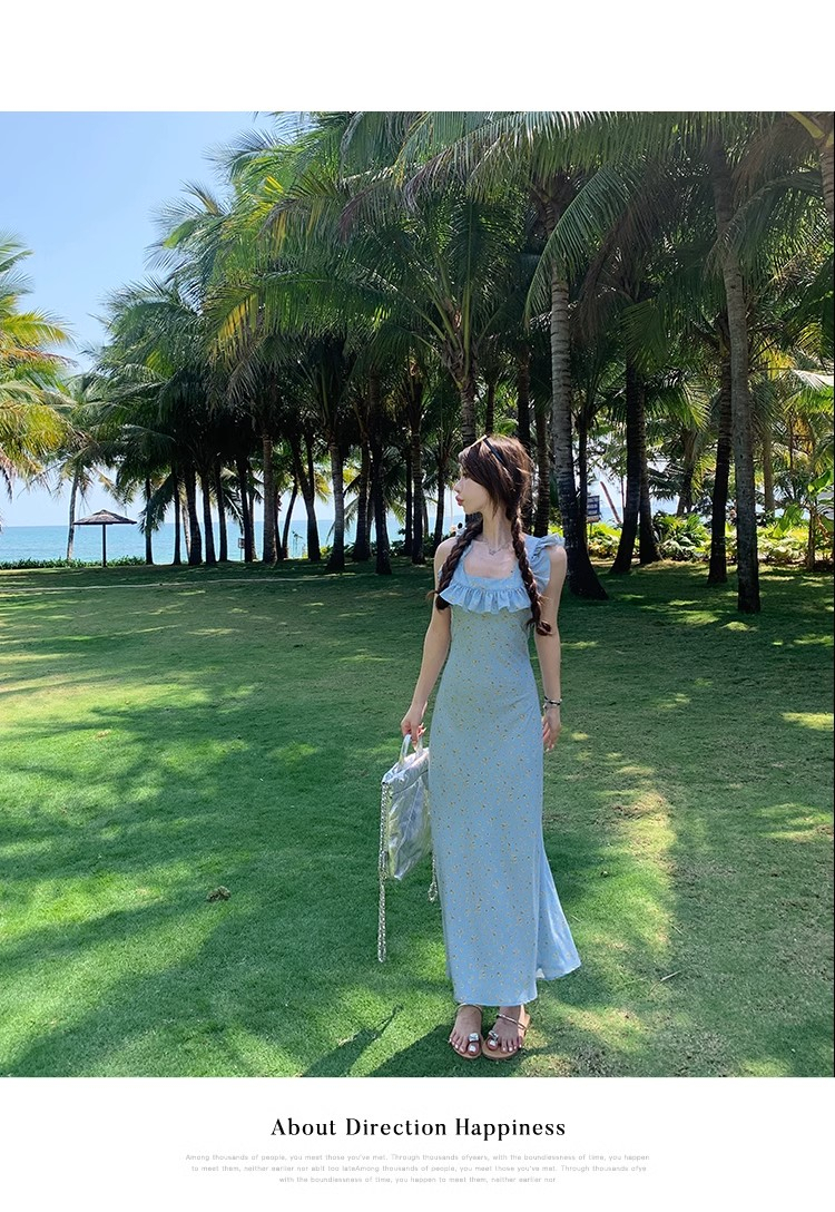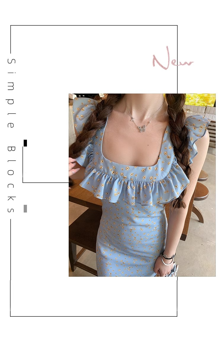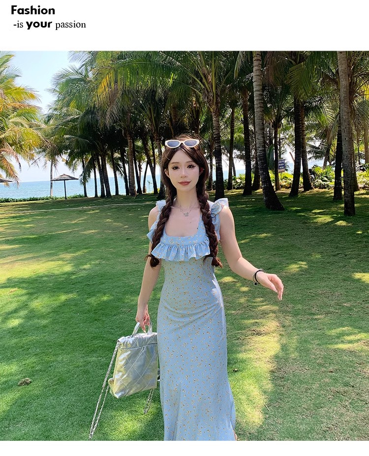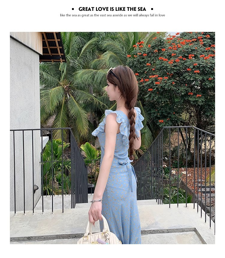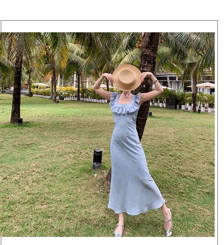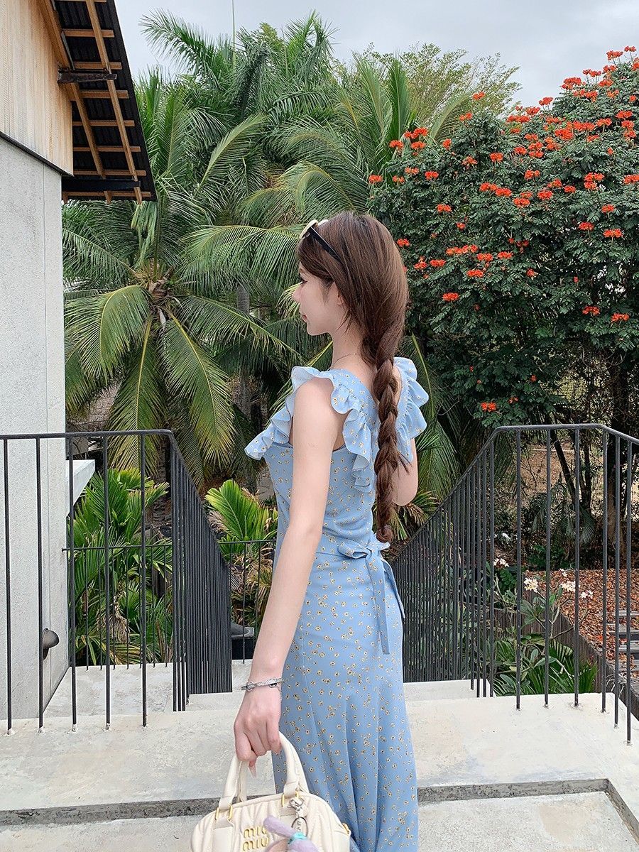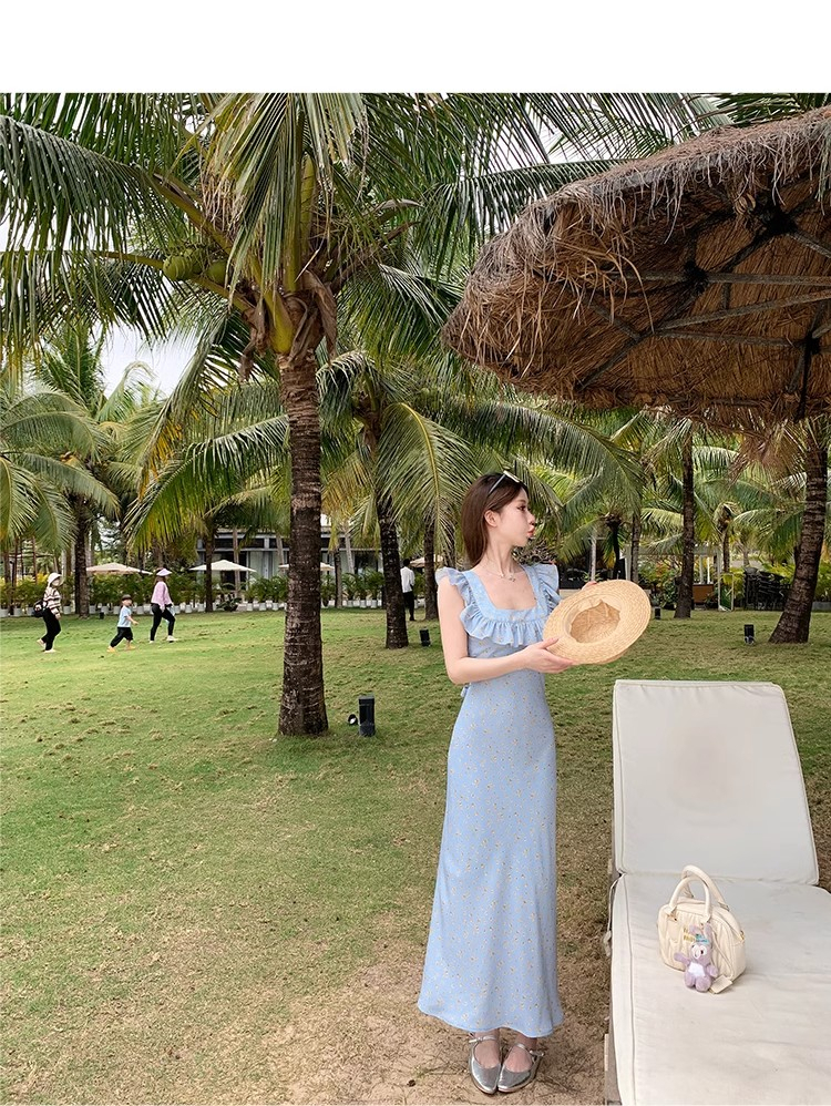 • 法式浪漫温柔小飞袖蓝色碎花连衣裙子女夏季2024新款海边度假