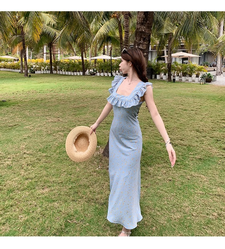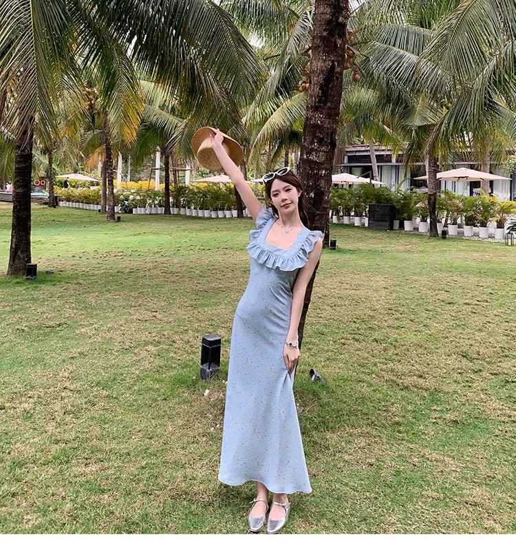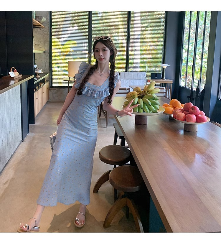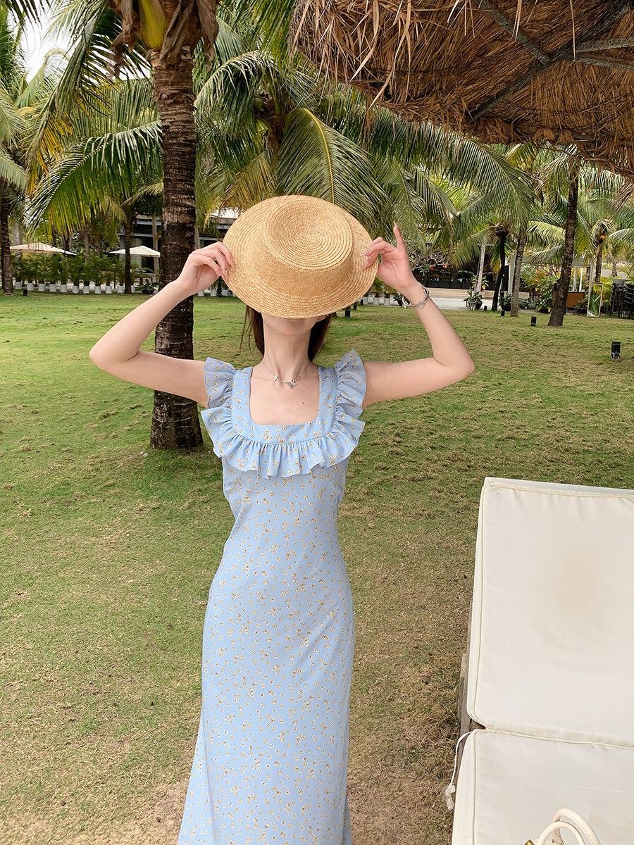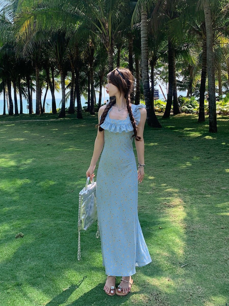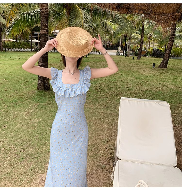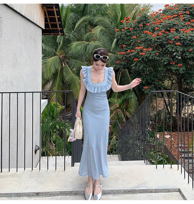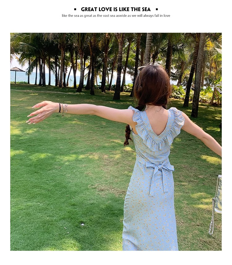 • 法式浪漫温柔小飞袖蓝色碎花连衣裙子女夏季2024新款海边度假
