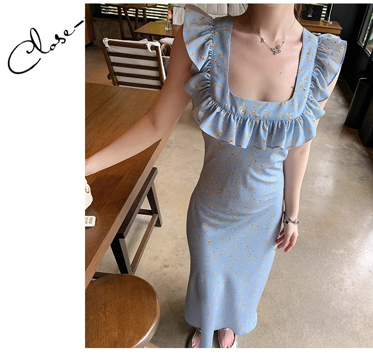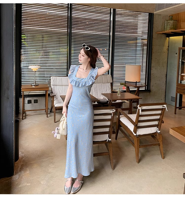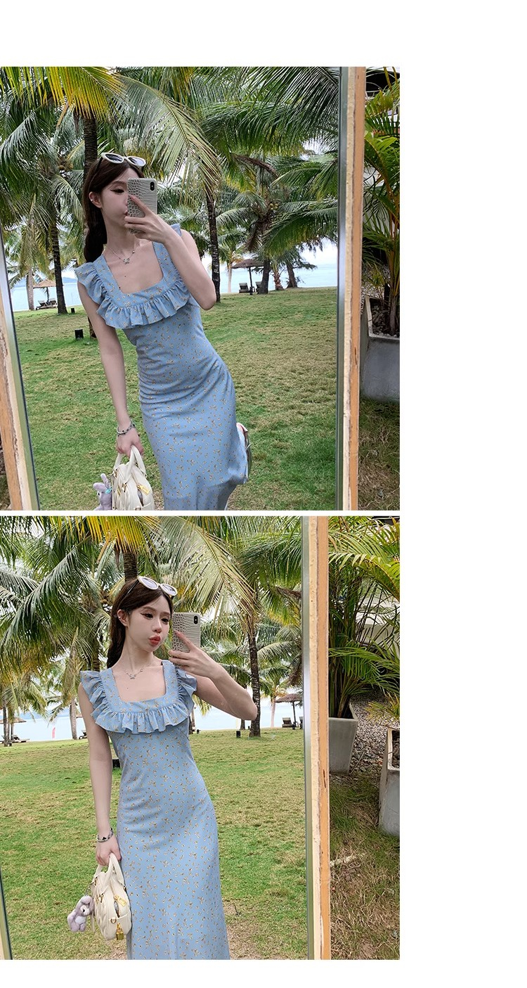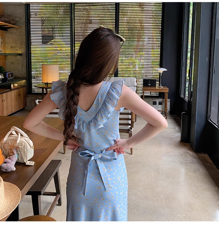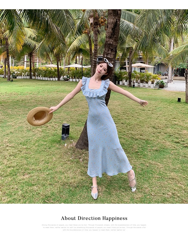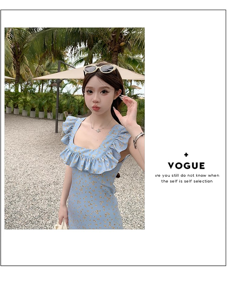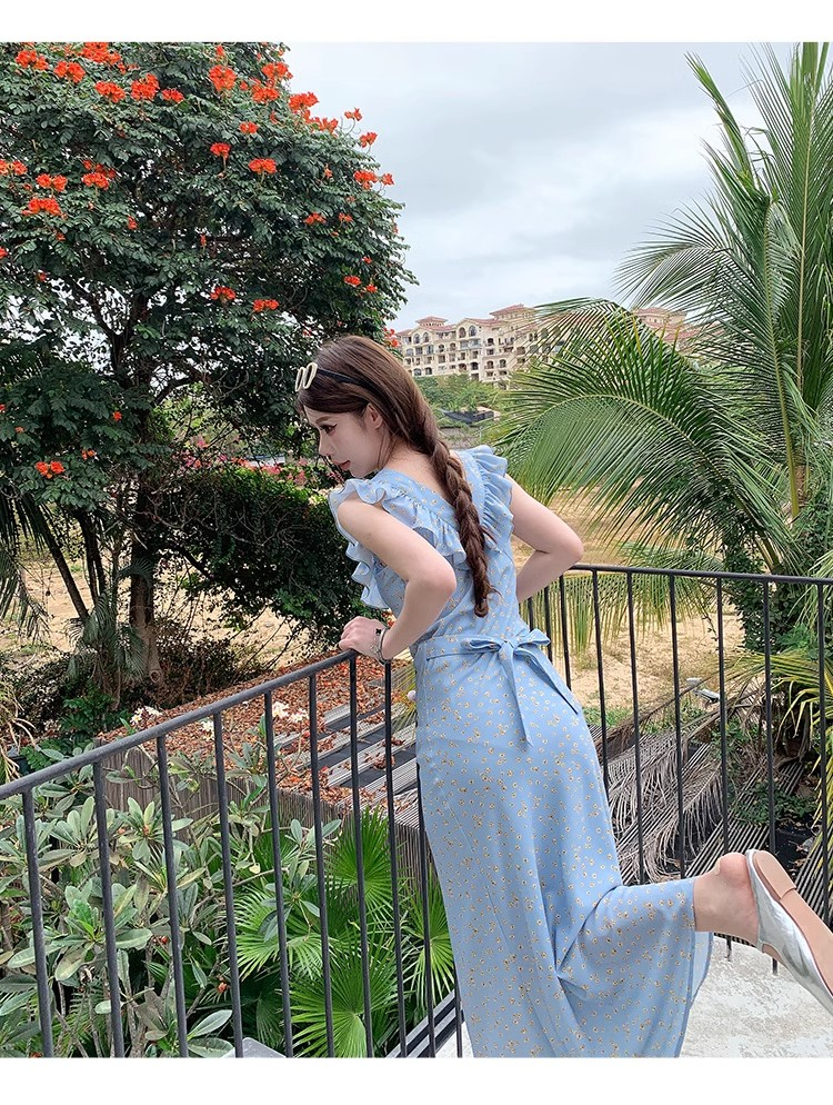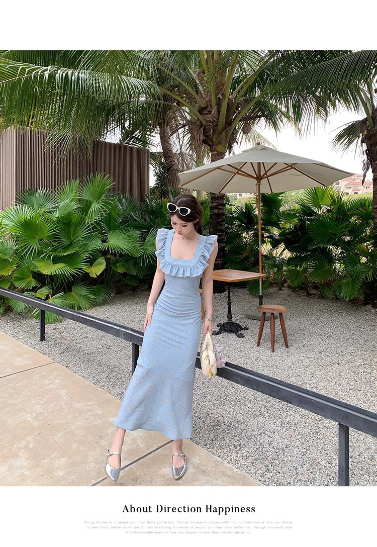 • 法式浪漫温柔小飞袖蓝色碎花连衣裙子女夏季2024新款海边度假