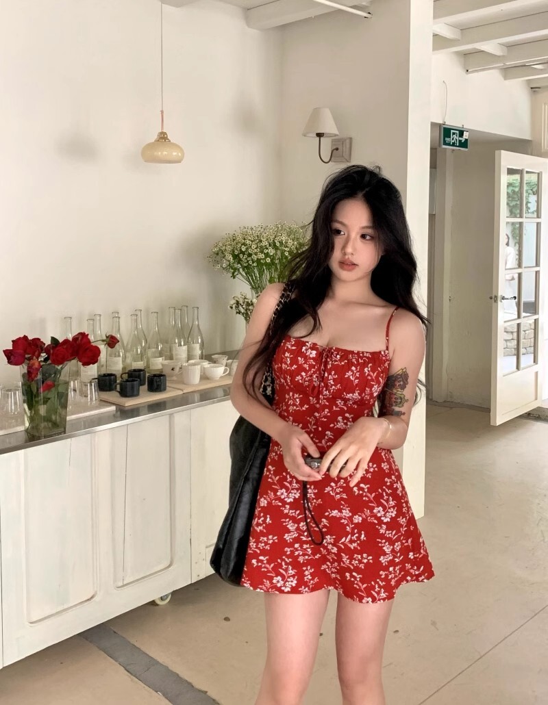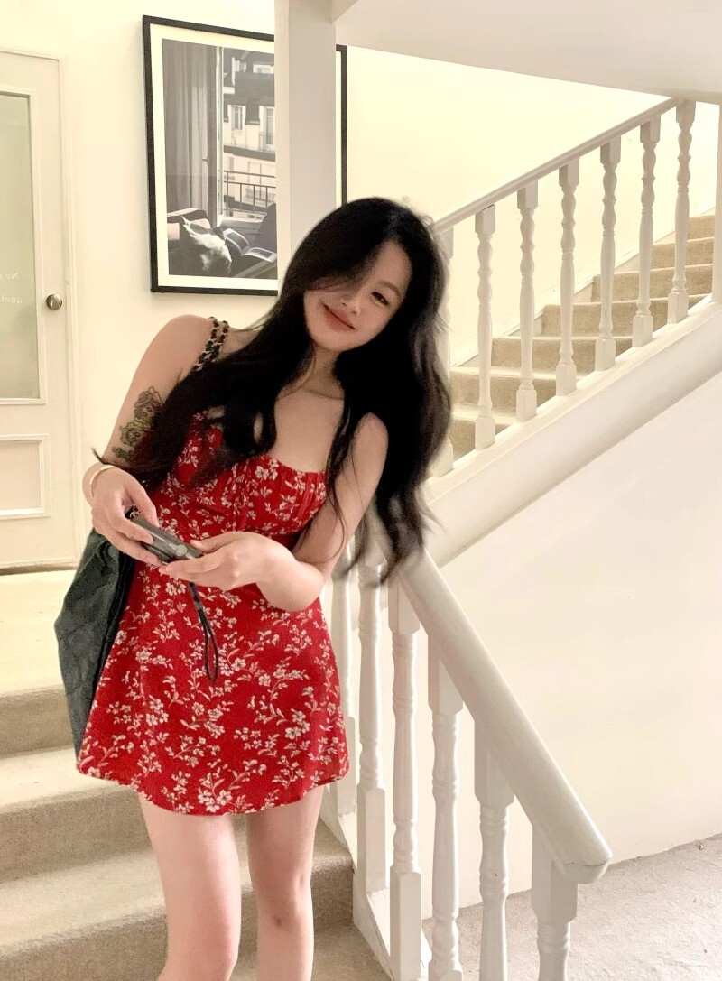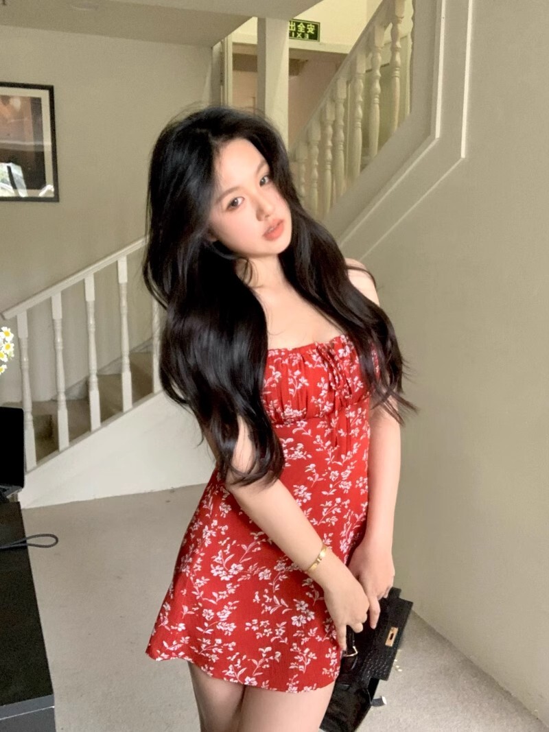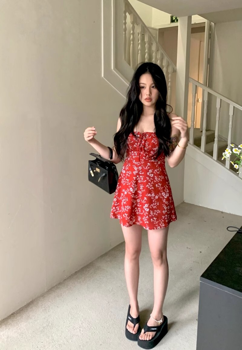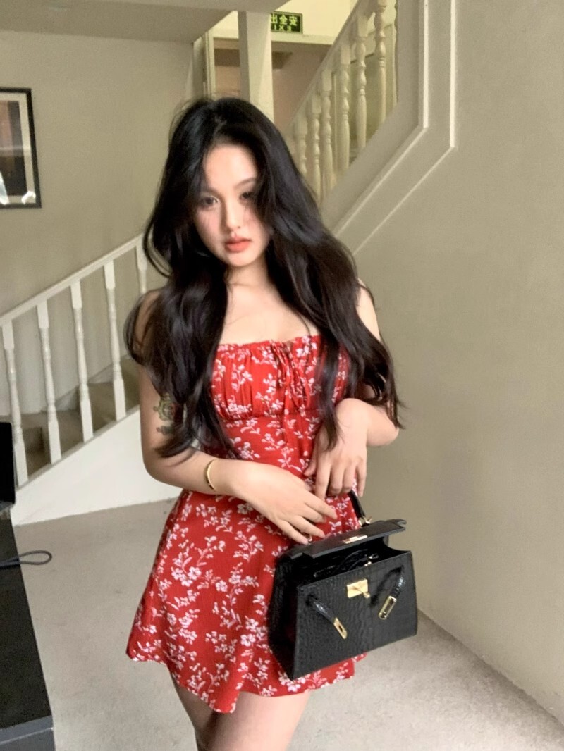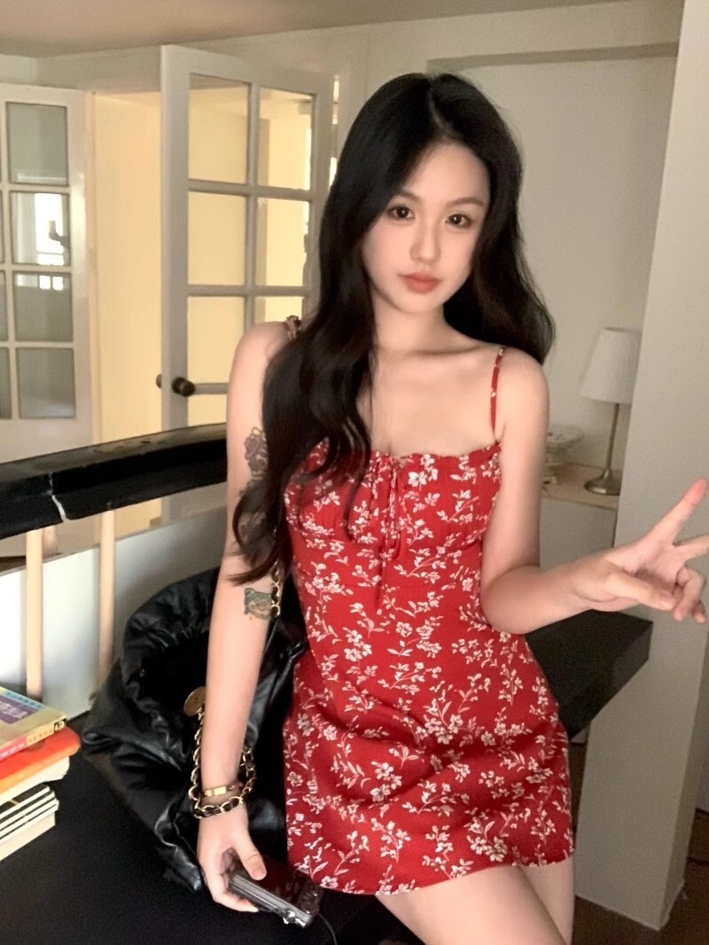 • 红色碎花吊带裙女春季2024新款度假风性感收腰显瘦A字连连衣